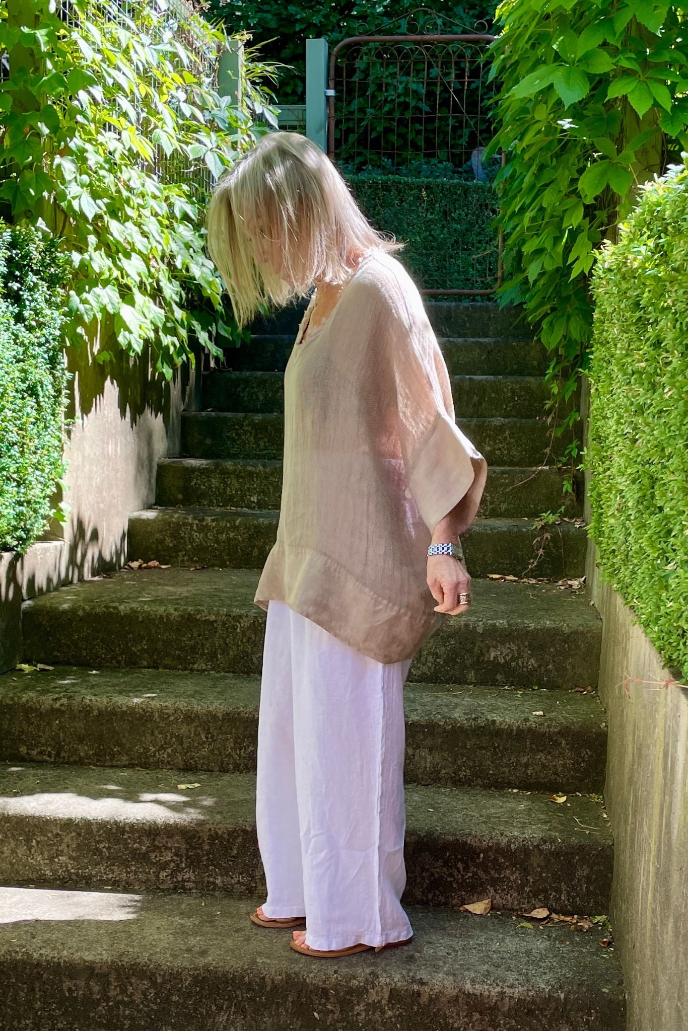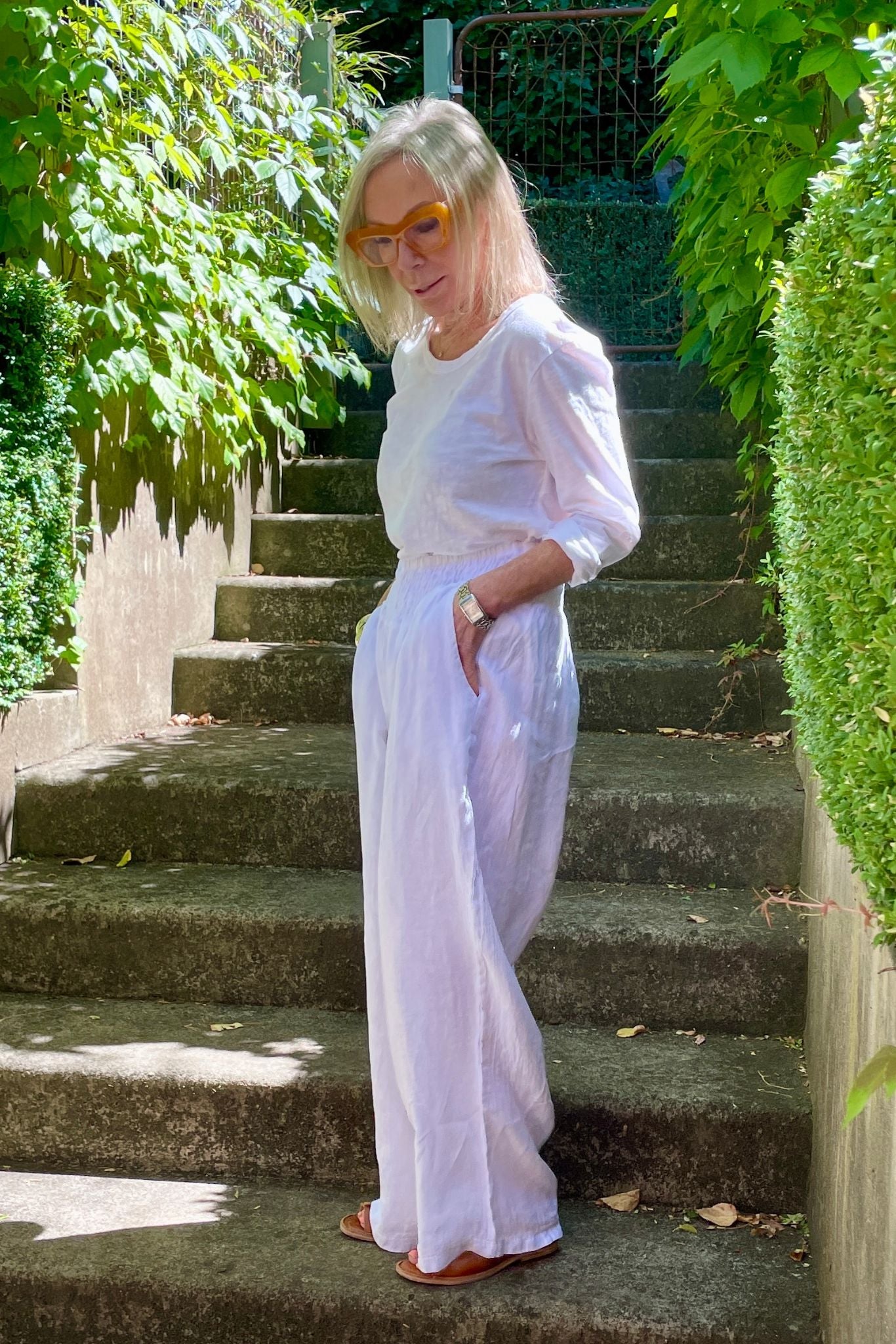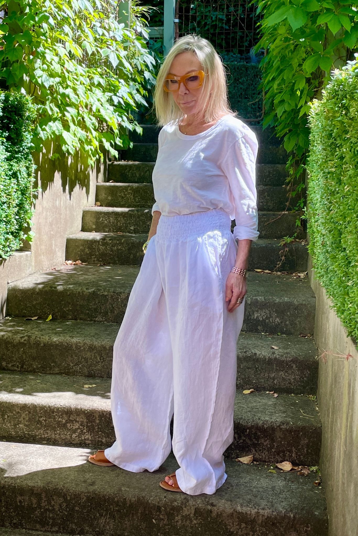 DESCRIPTION -crafted in Italy from 100% linen, the amara pants feature a soft wide elasticated waistband, handy side pockets, and a relaxed, loose fit with gently tapered wide legs for a stylish, baggy look. exceptionally comfortable, they pair beautifully with the atrani top also from italian cartel for a effortlessly chic outfit.
