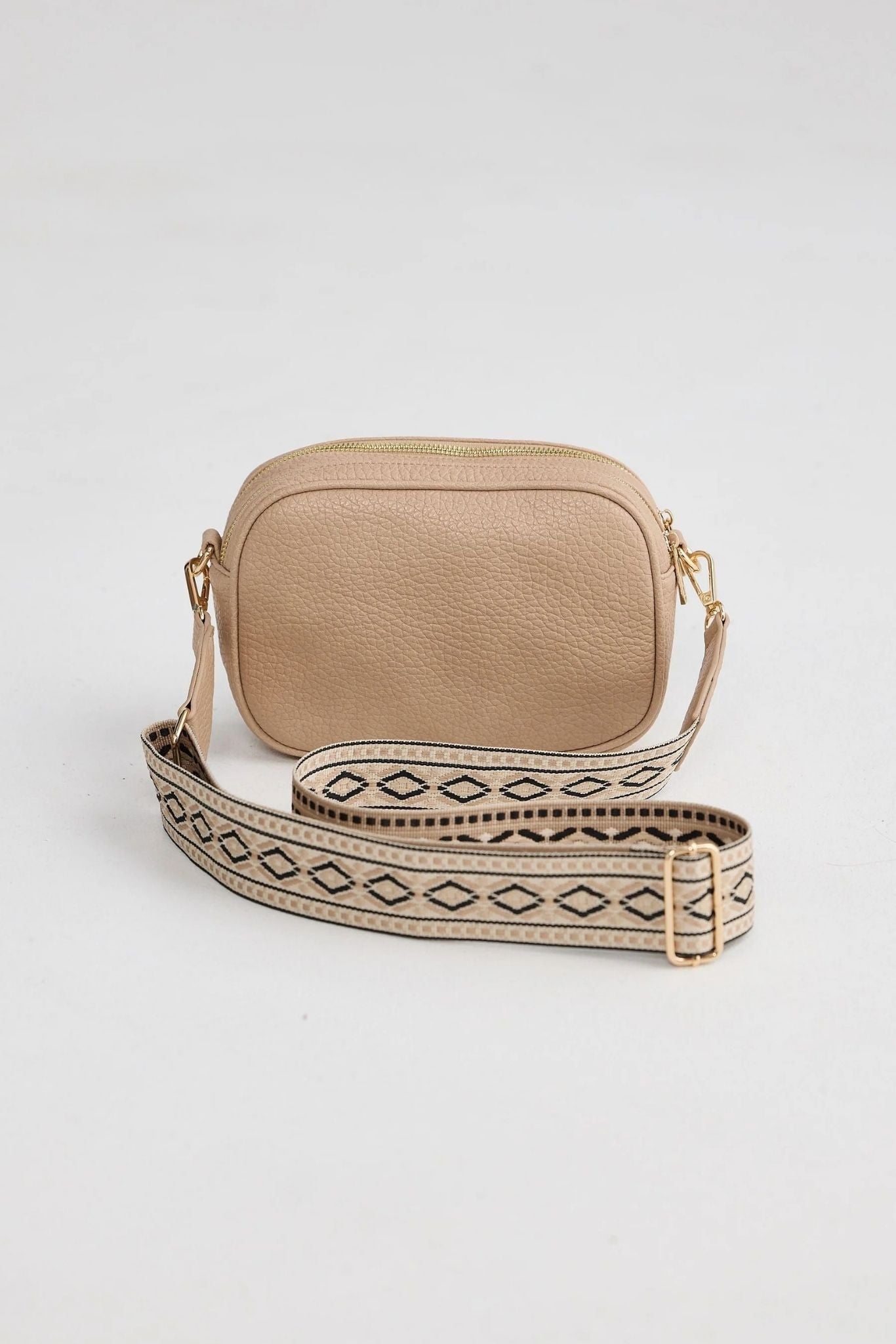 DESCRIPTION - the knightly crossbody bag combines accessibility with refined design. dual wide zip openings ensure effortless retrieval of essentials, while an open pouch provides supplementary storage solutions. the adjustable strap accommodates various carrying preferences, and detachable straps offer styling flexibility for different occasions. available in a versatile ecru finish with subtle patterning, it's an investment piece that seamlessly integrates into any discerning wardrobe.