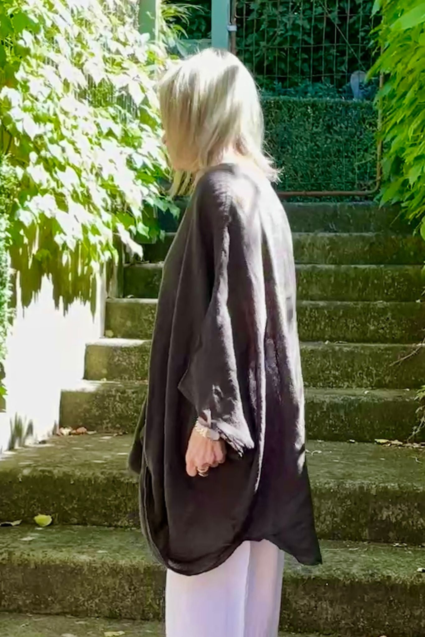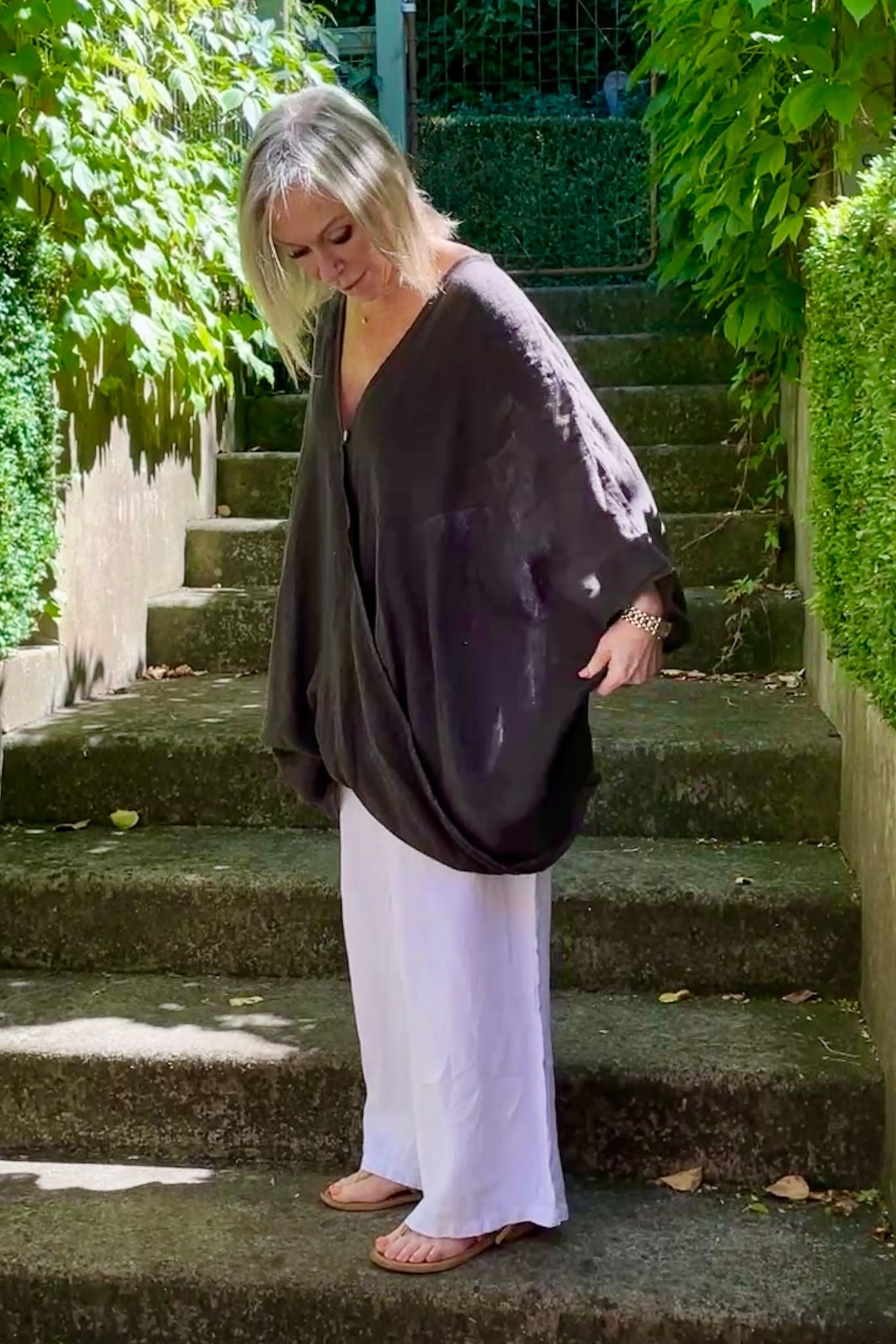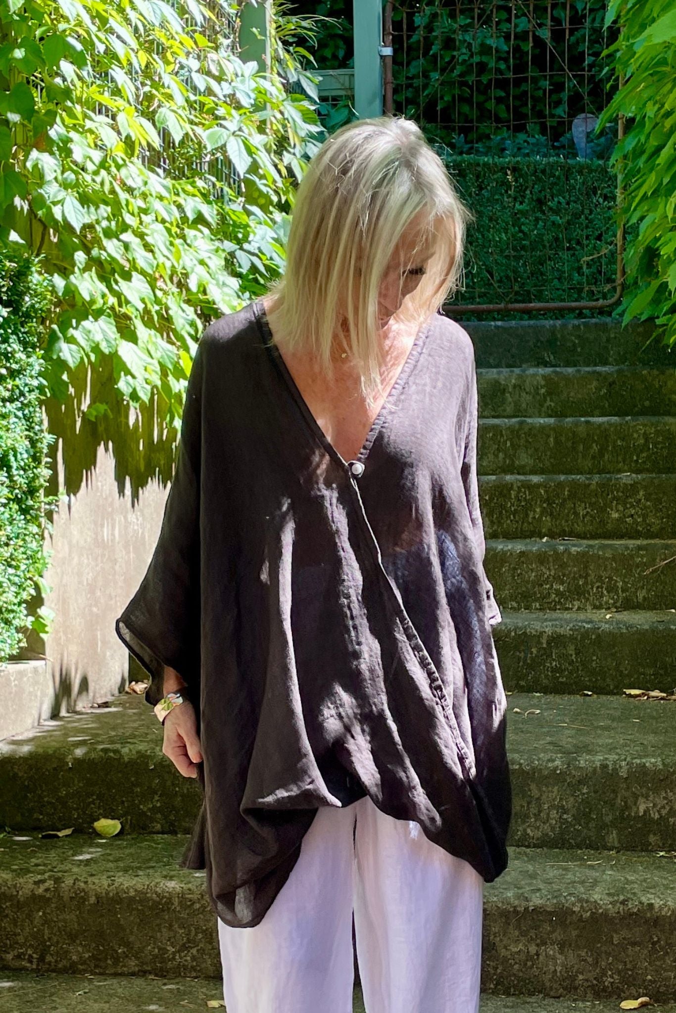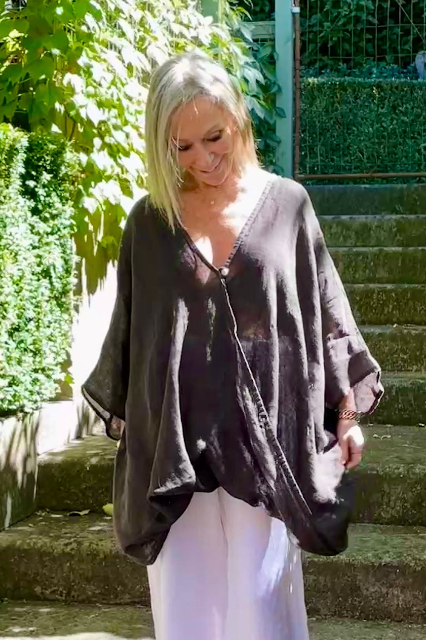 DESCRIPTION - the minerva top by italian cartel is a versatile linen tunic style top, featuring a soft V-neckline with a unique cross over front and drape at the hem. loose 3/4 sleeves and made in italy, crafted from a loose, textured linen fabric. this hip-length top offers effortless style and breathable comfort. perfect with our amara pants.