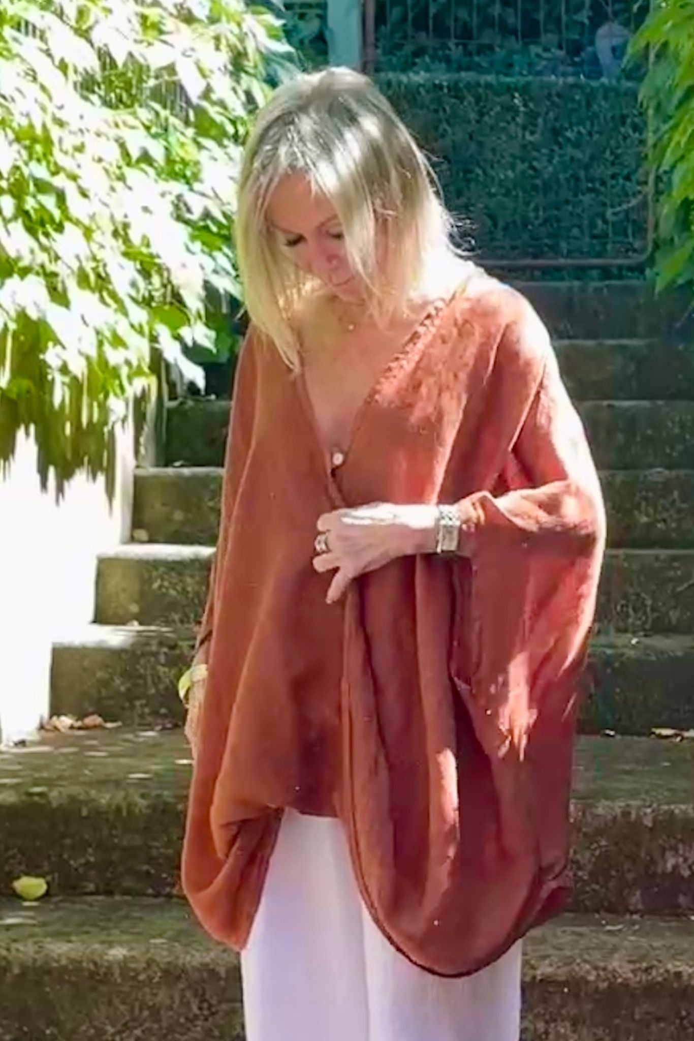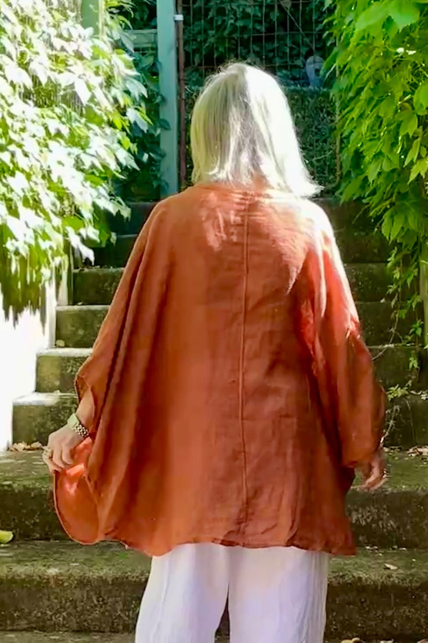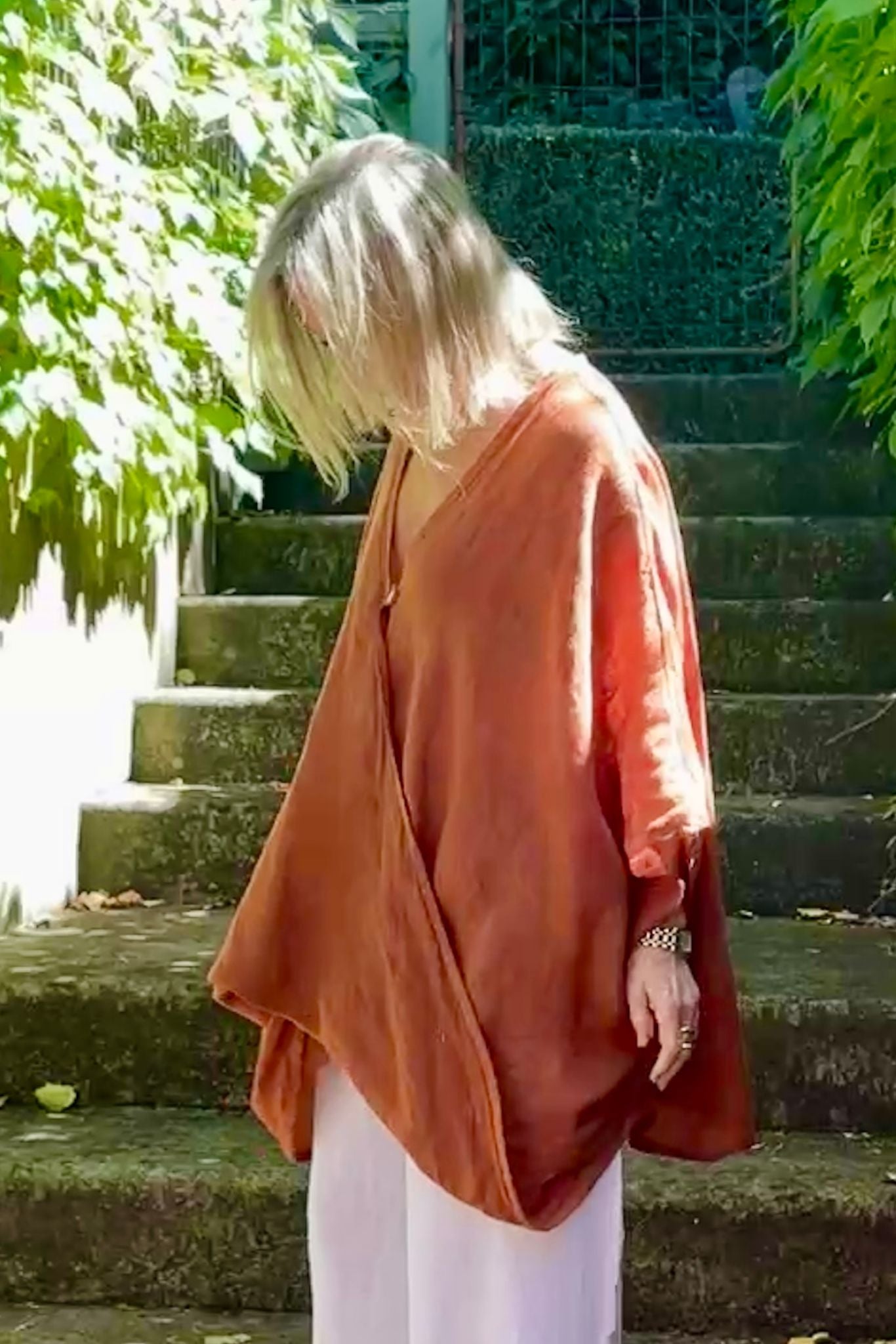 DESCRIPTION - the minerva top by italian cartel is a versatile linen tunic style top, featuring a soft V-neckline with a unique cross over front and drape at the hem. loose 3/4 sleeves and made in italy, crafted from a loose, textured linen fabric. this hip-length top offers effortless style and breathable comfort. perfect with our amara pants.