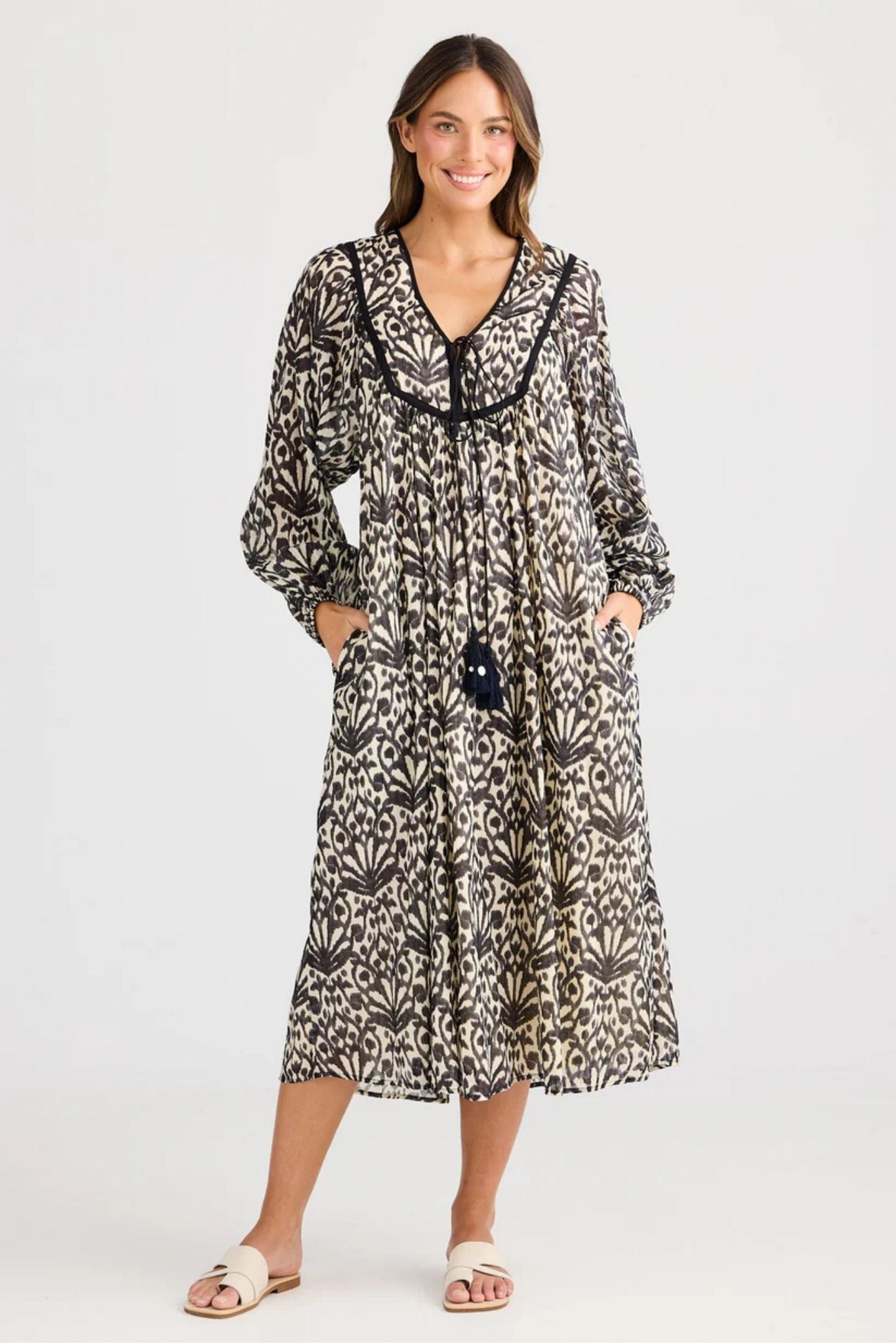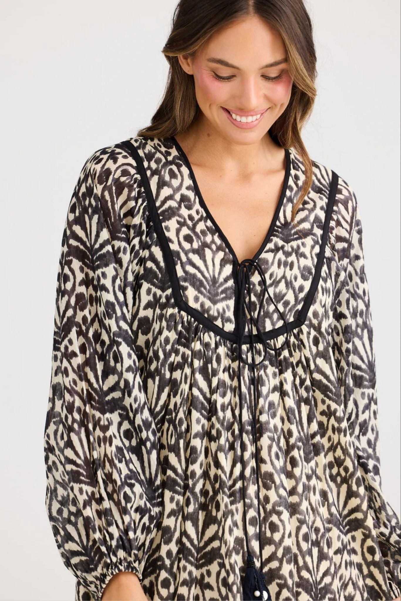 DESCRIPTION - crafted with refined detailing, this piece showcases a flattering V-neckline adorned with tassel-trimmed ties featuring delicate shell and sequin pearl embellishments. the structured front and back yokes are finished with contrasting flat binding for a polished look. long raglan sleeves provide comfortable movement, while elasticated hems ensure a secure fit at the wrists.
