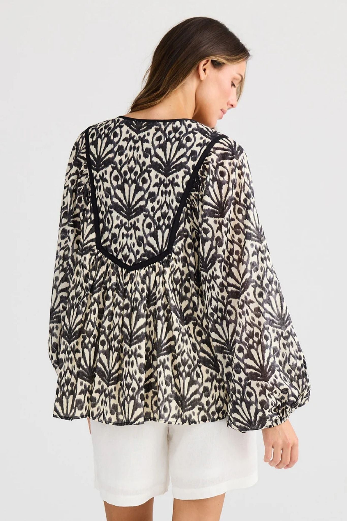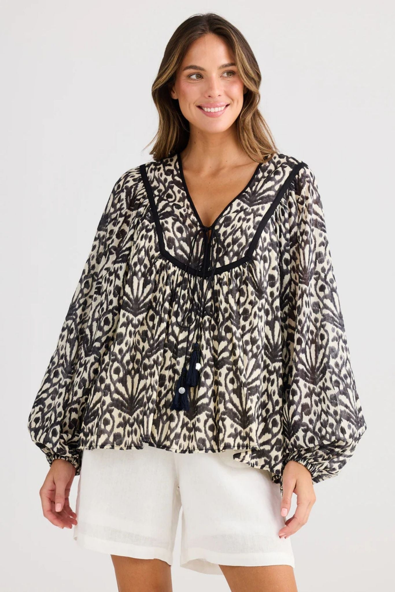 DESCRIPTION - crafted with refined coastal aesthetics, this piece showcases a flattering V neckline adorned with tassel-trimmed ties featuring delicate shell and sequin pearl embellishments. structured yoke detailing at front and back is finished with contrasting flat binding for visual interest. the long raglan sleeves provide comfortable movement, while elasticated hems ensure a polished fit at the wrists.