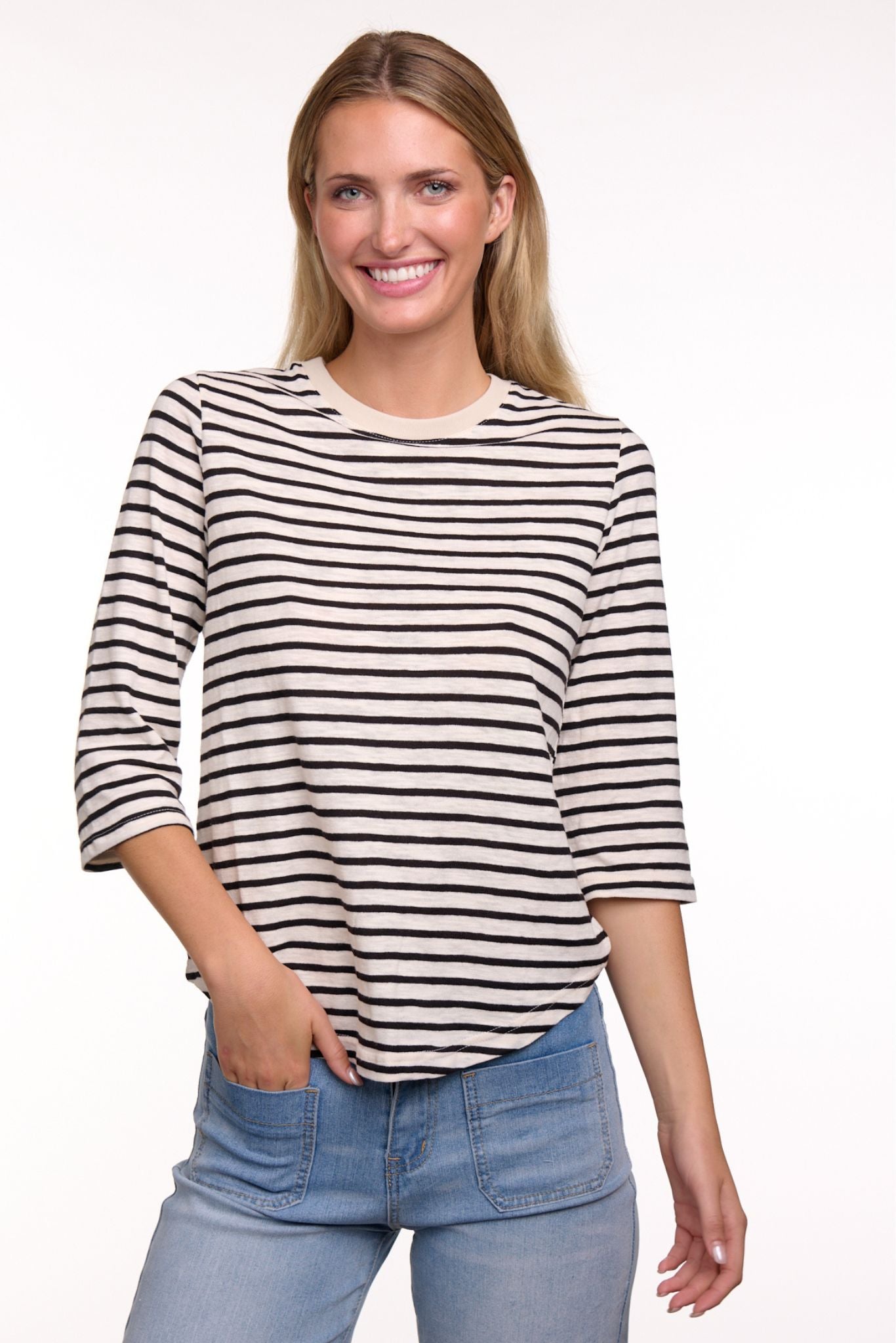DESCRIPTION - this essential tee from basic 123 is a versatile addition to your wardrobe. it features a classic crew neck and a slim, relaxed fit with natural and black stripes on soft, textured cotton jersey. the 3/4 slim sleeves and curved hem provide a flattering medium length, ideal for tucking in or wearing loose. easily styled up with a blazer and scarf or kept casual with your favourite jeans.