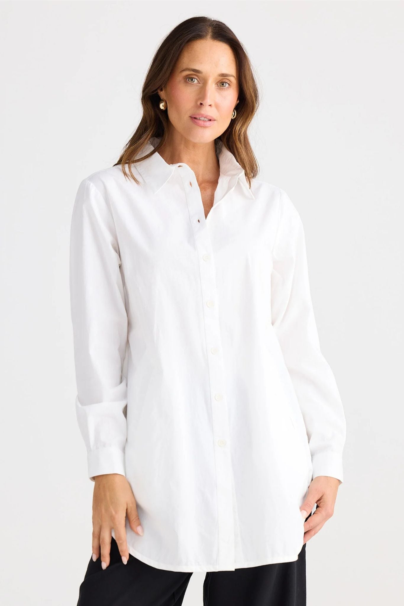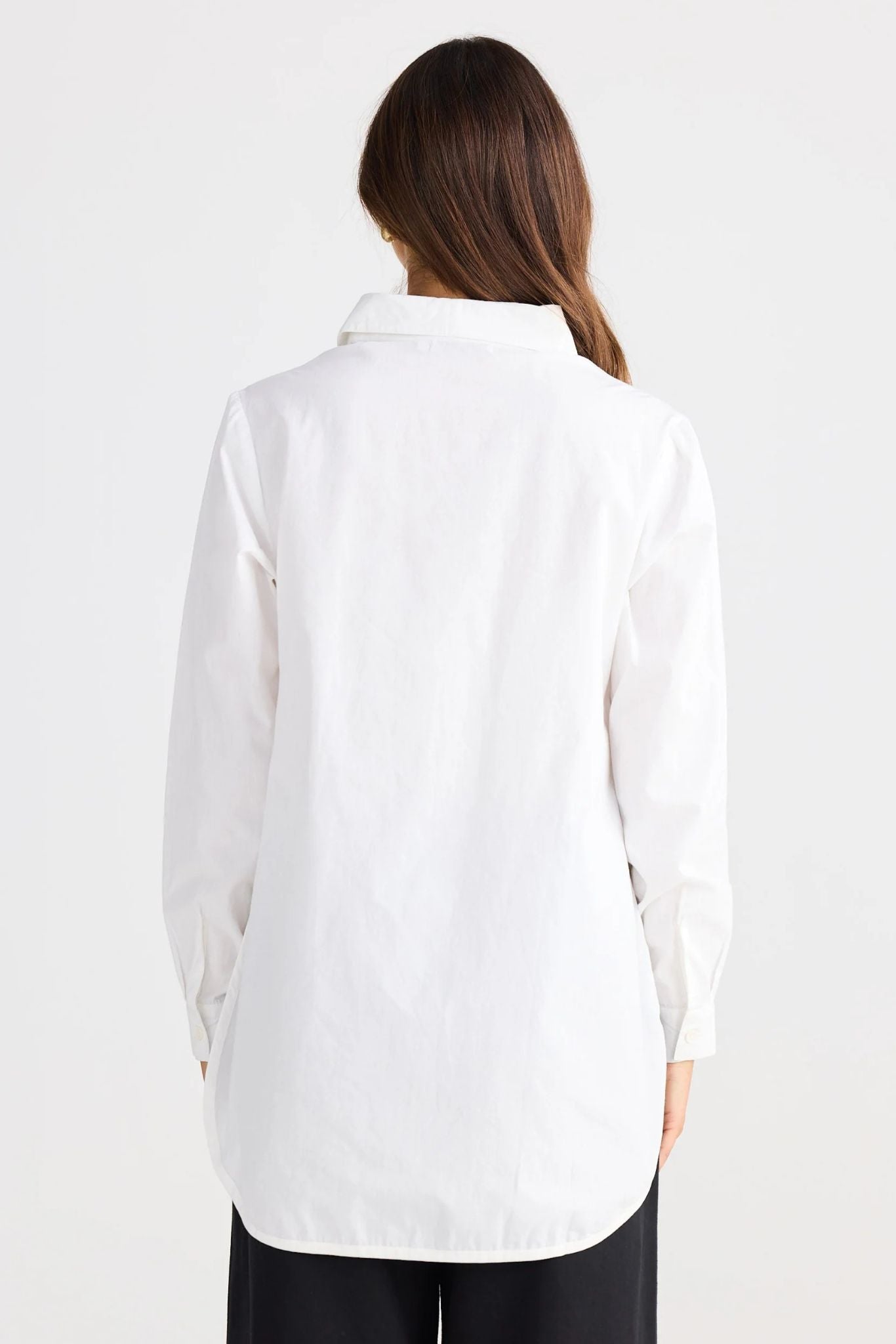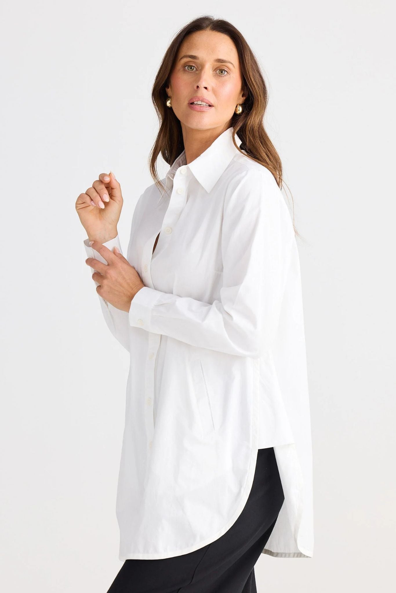 DESCRIPTION - the ava shirt by brave + true is sure to be a wardrobe staple. featuring a classic collar and front buttons for easy wear, this statement shirt has long sleeves and front welt pockets for added convenience. the curved hem with side godets create a comfortable, relaxed fit you’ll appreciate throughout your day and a chic twist. wear as a statement piece with your favourite jeans or pants.