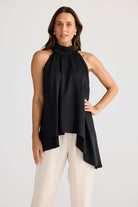 DESCRIPTION - elevate your style with the jewell top by brave + true. with a high mock style gathered neckline, this sleeveless top offers a chic look. a keyhole opening at the centre back secured with a gold button and an asymmetrical hemline for a modern twist. perfect with black pants.