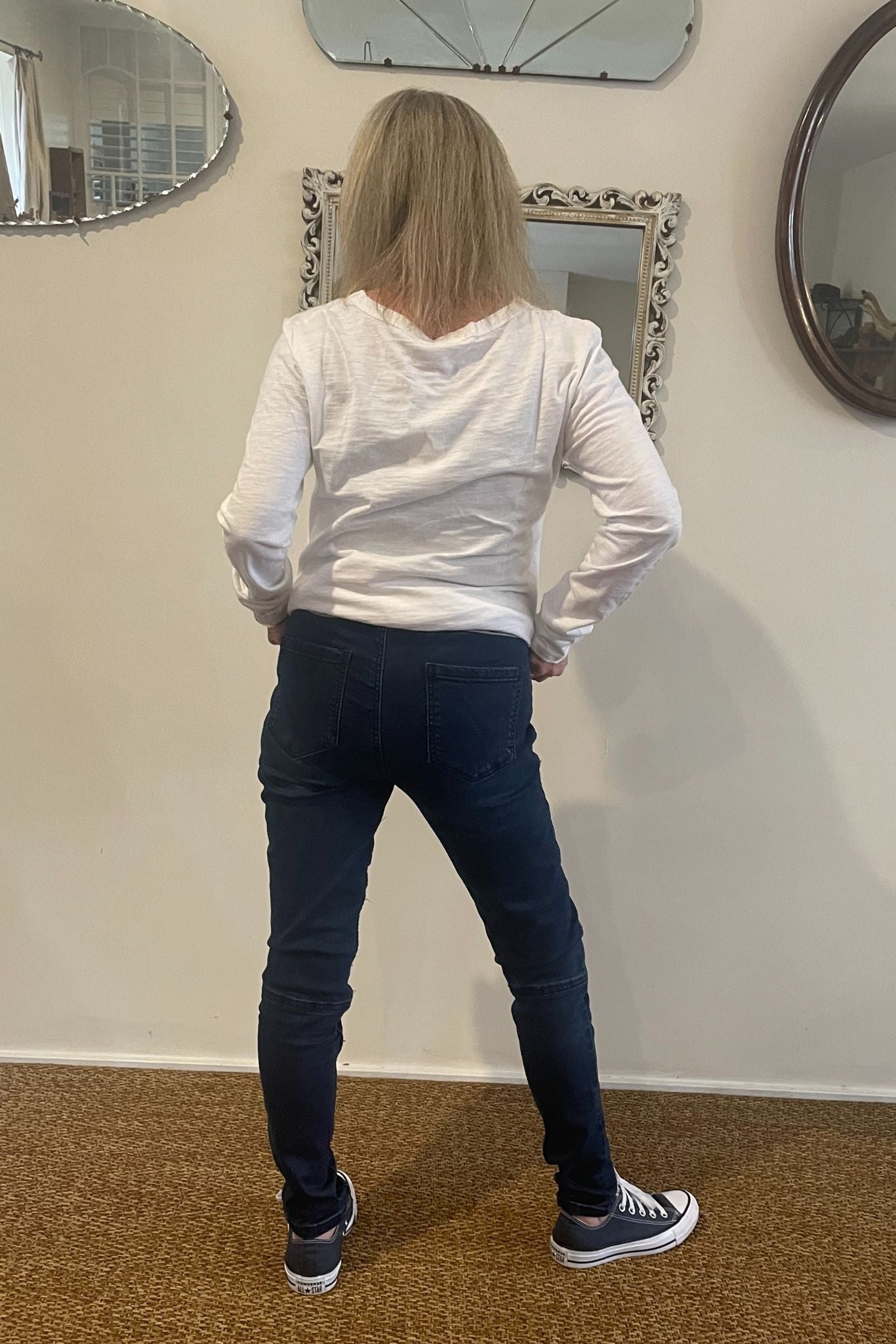 DESCRIPTION - a must have pull up jean for every woman. a fitted style with ribbed detail at the front on the knees and super stretchy. high waisted with flattering front panel to hide everything. pockets on the back. a super comfy soft feel denim.