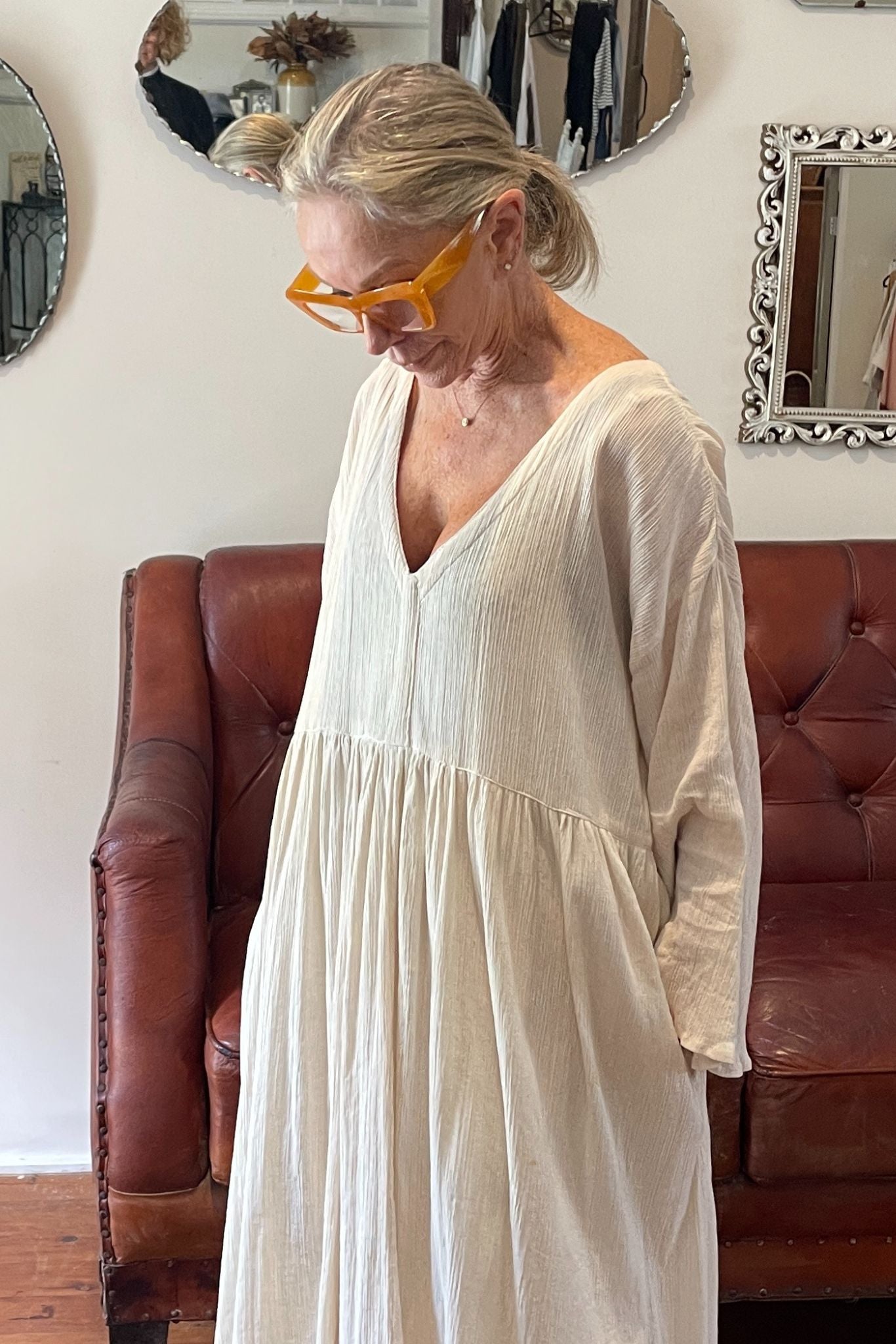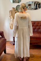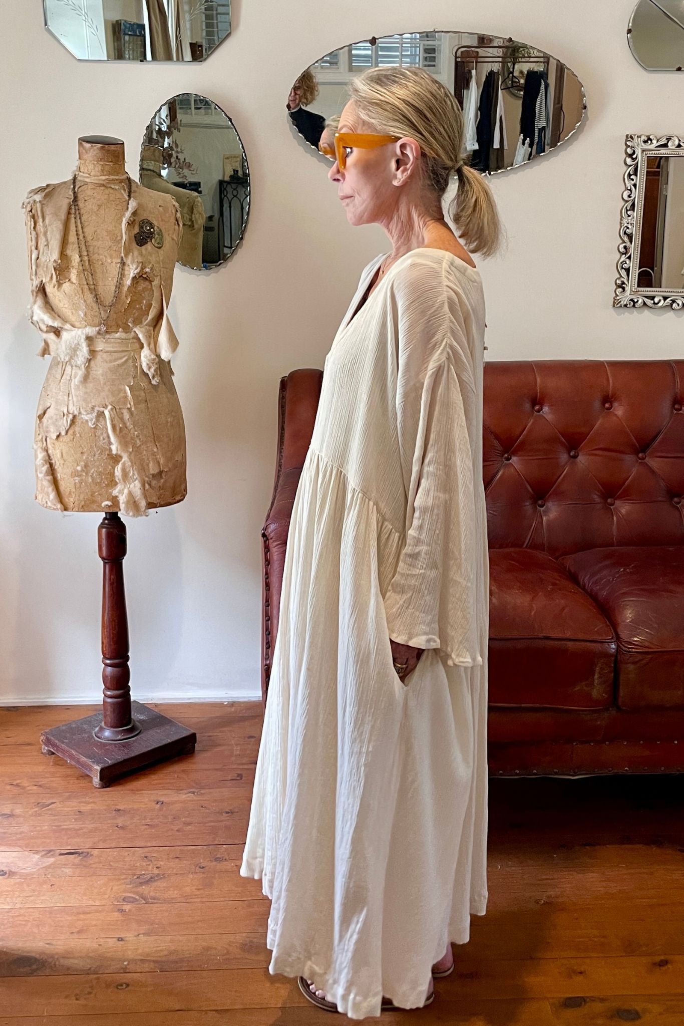 DESCRIPTION - the breezy afternoon dress by fabulous jaded gypsy is designed to keep you comfortable and stylish throughout the day. its flattering V-neckline and flowing bell sleeves create a smooth silhouette, while the empire line enhances your natural shape. this maxi-length dress, made from 100% cotton, offers breathable softness that’s perfect for any weather. the parchment shade adds a subtle neutral touch, making it easy to dress up or down for any occasion. whether you're enjoying a casual afternoon or a relaxed gathering, this dress is comfort with every wear.