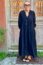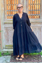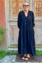 DESCRIPTION - the black crystal dress features a delicate slip and a small frill neckline that adds subtle touch. it fastens with four buttons running from the collar to the top of the waist, offering a refined opening detail. the billowy short sleeves are gently gathered with slight elastic to create a soft frill, enhancing the dress’s silhouette. designed with three flowing tiers, it provides generous fabric at the hemline for graceful movement and a flattering drape.