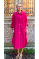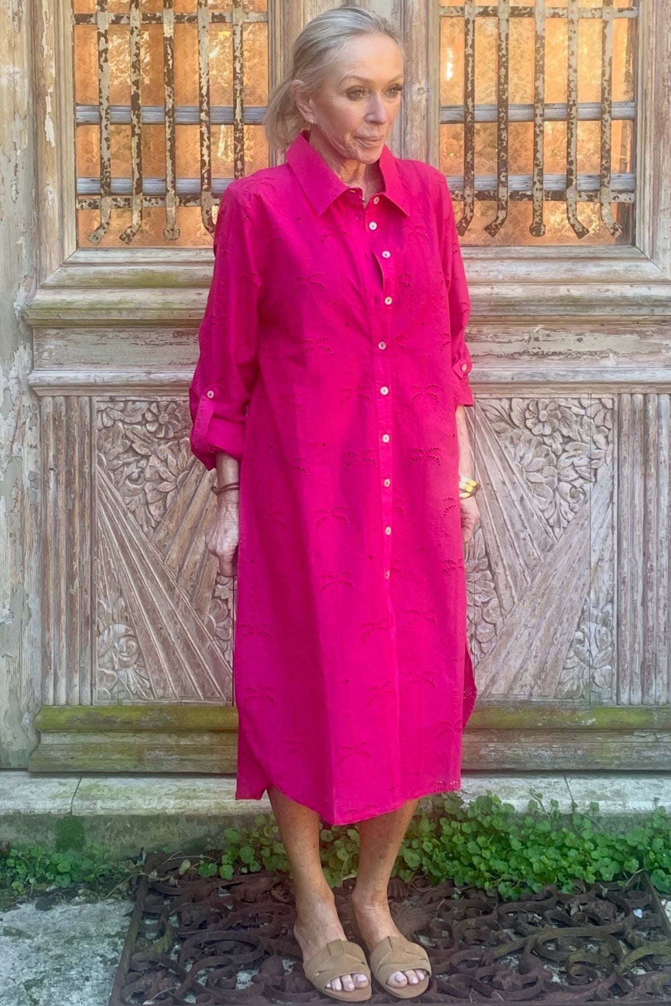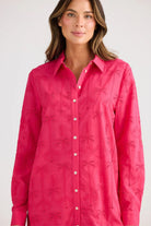 DESCRIPTION - the palm overshirt in hot pink is a versatile and fun wardrobe essential designed for spring and summer wear. featuring a classic collared neckline and a button-front closure, this piece offers effortless style with practical functionality. the cuffed sleeves secured with button fastenings allow you to adjust your look. crafted for a relaxed fit, it pairs seamlessly with both casual and dressy outfits, making it perfect for layering or wearing on its own. durable and breathable, this overshirt combines comfort with timeless design for year-round appeal.