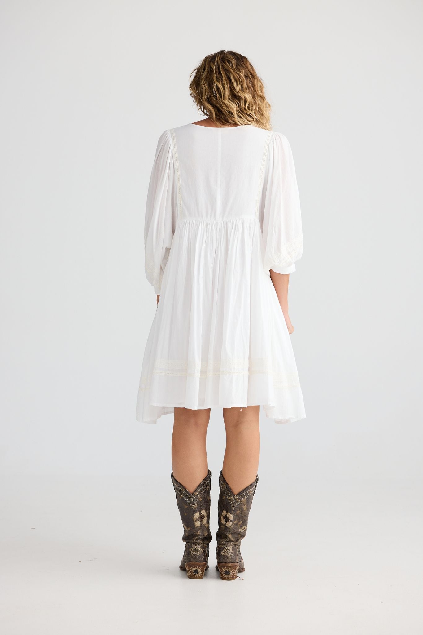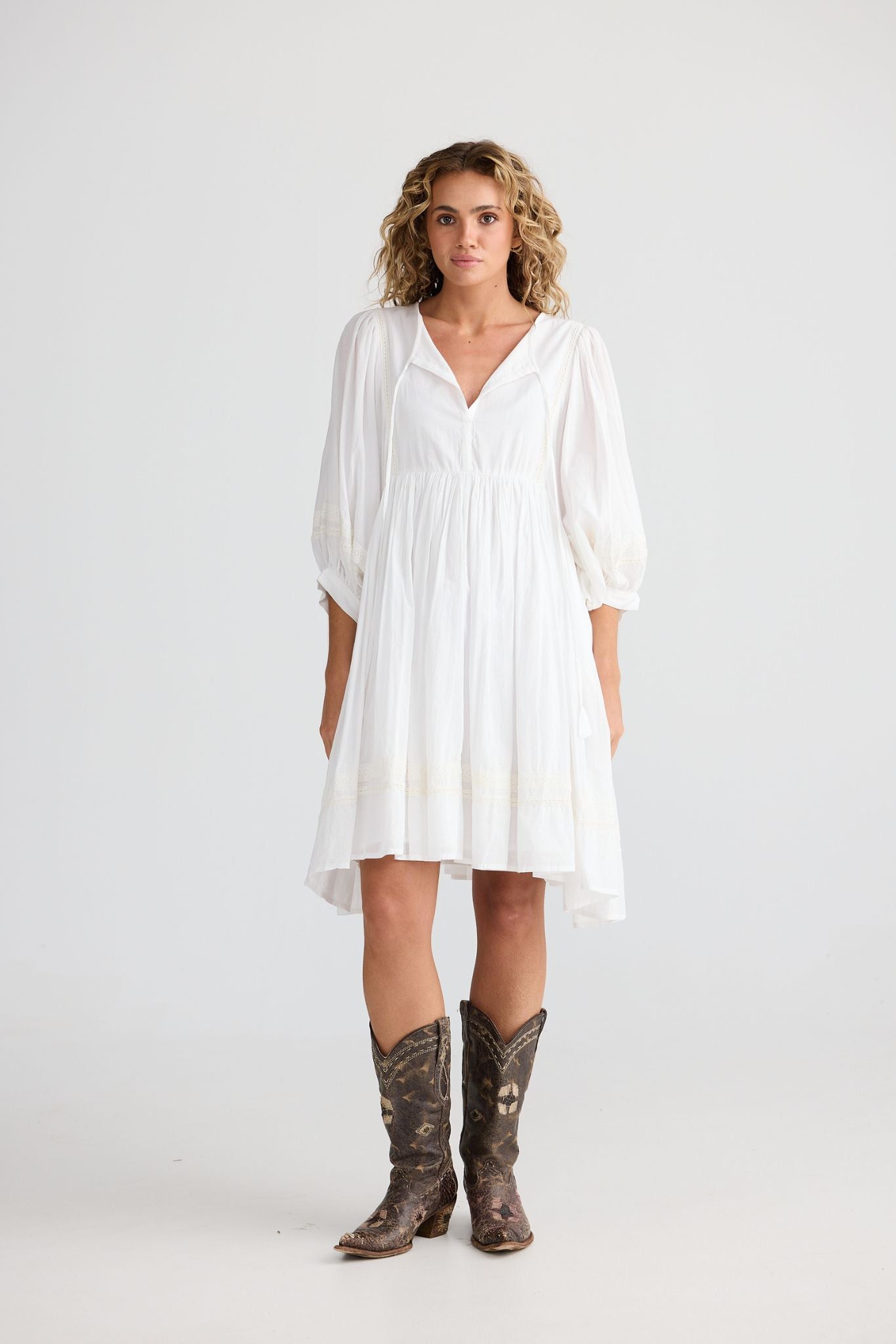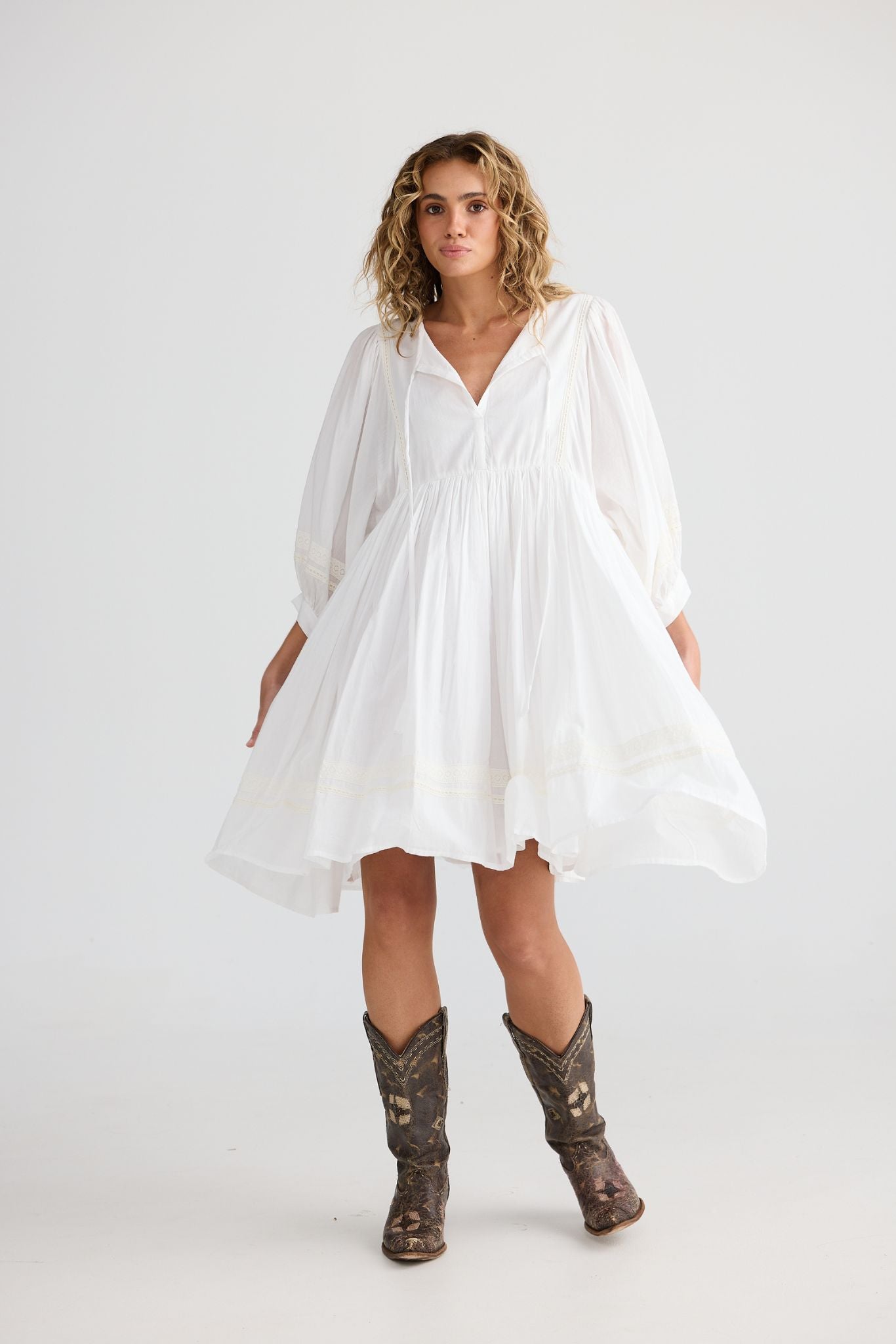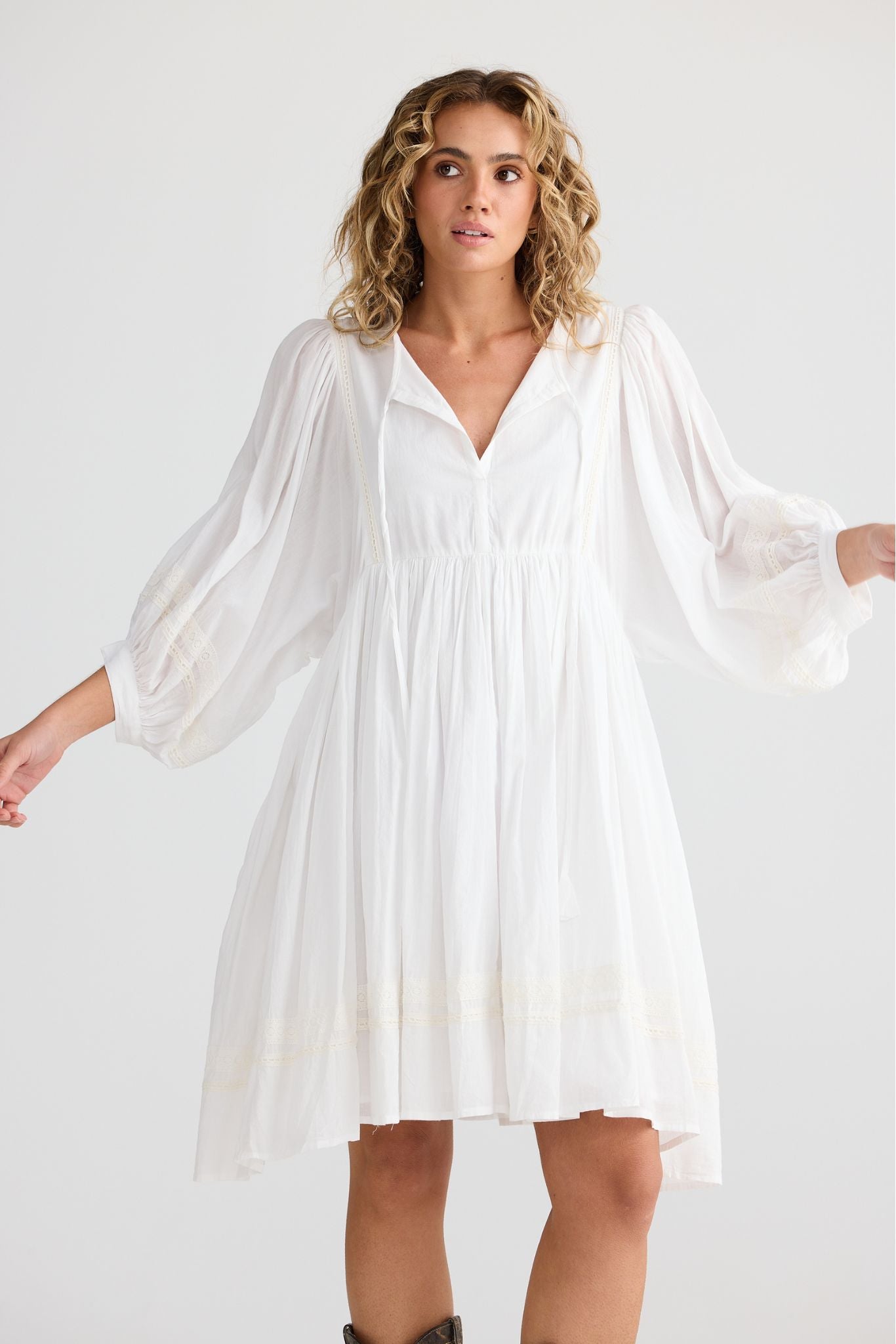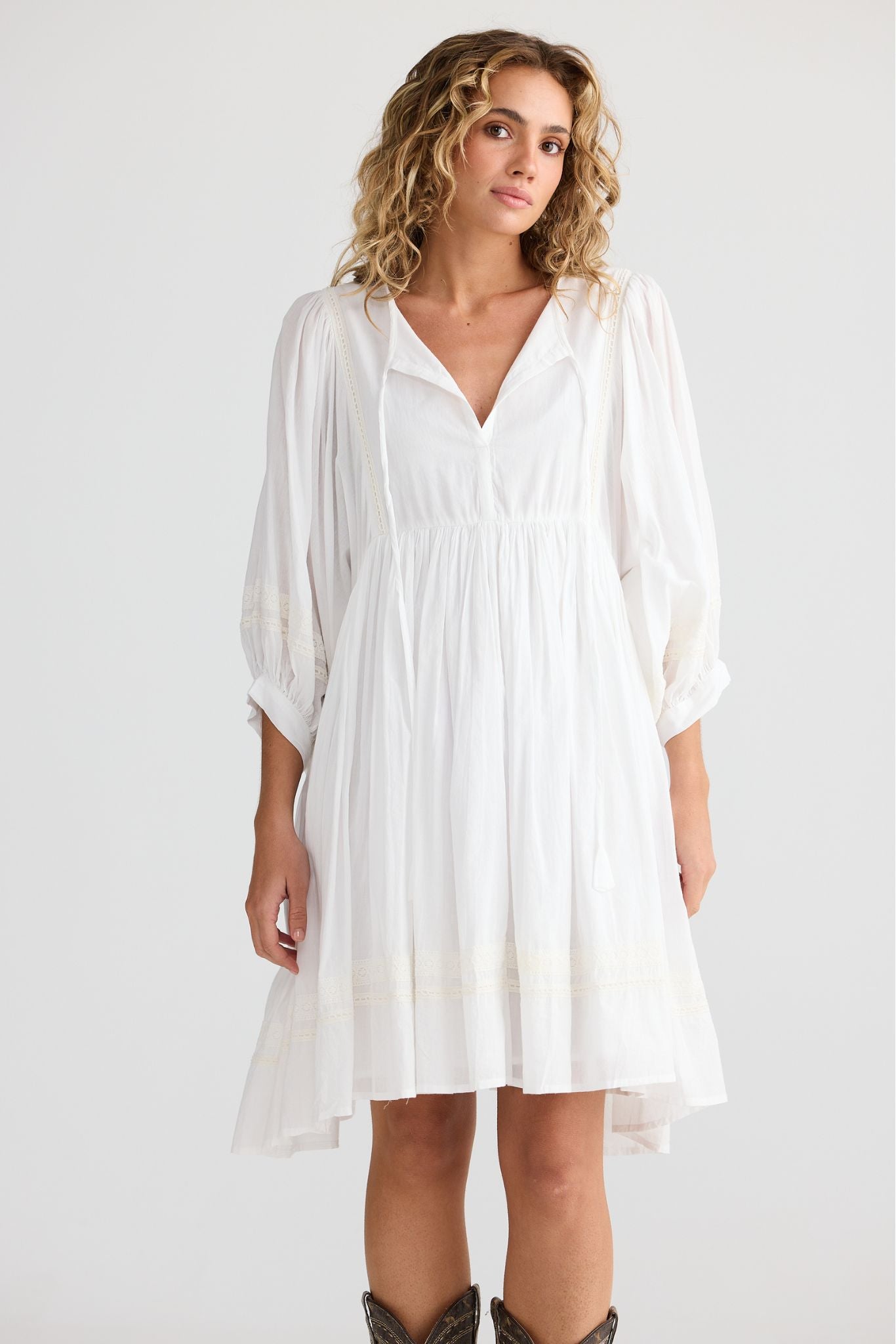 DESCRIPTION -the solstice mini dress by talisman features a round neckline and chic boho style relaxed fit. the dress is enhanced with adjustable neck ties that add a customisable touch to your look. empire line and full skirt, gathered 3/4 sleeves cuffed at the ends create subtle volume and structure, while delicate lace trim accents lend a refined, feminine finish. with its flattering mini length, this dress is perfect for day or evening, offering a versatile piece that effortlessly elevates your wardrobe for summer. make it casual with your sneakers or a dress up with a slide.