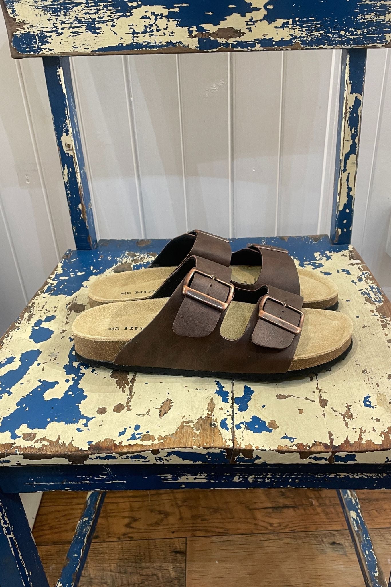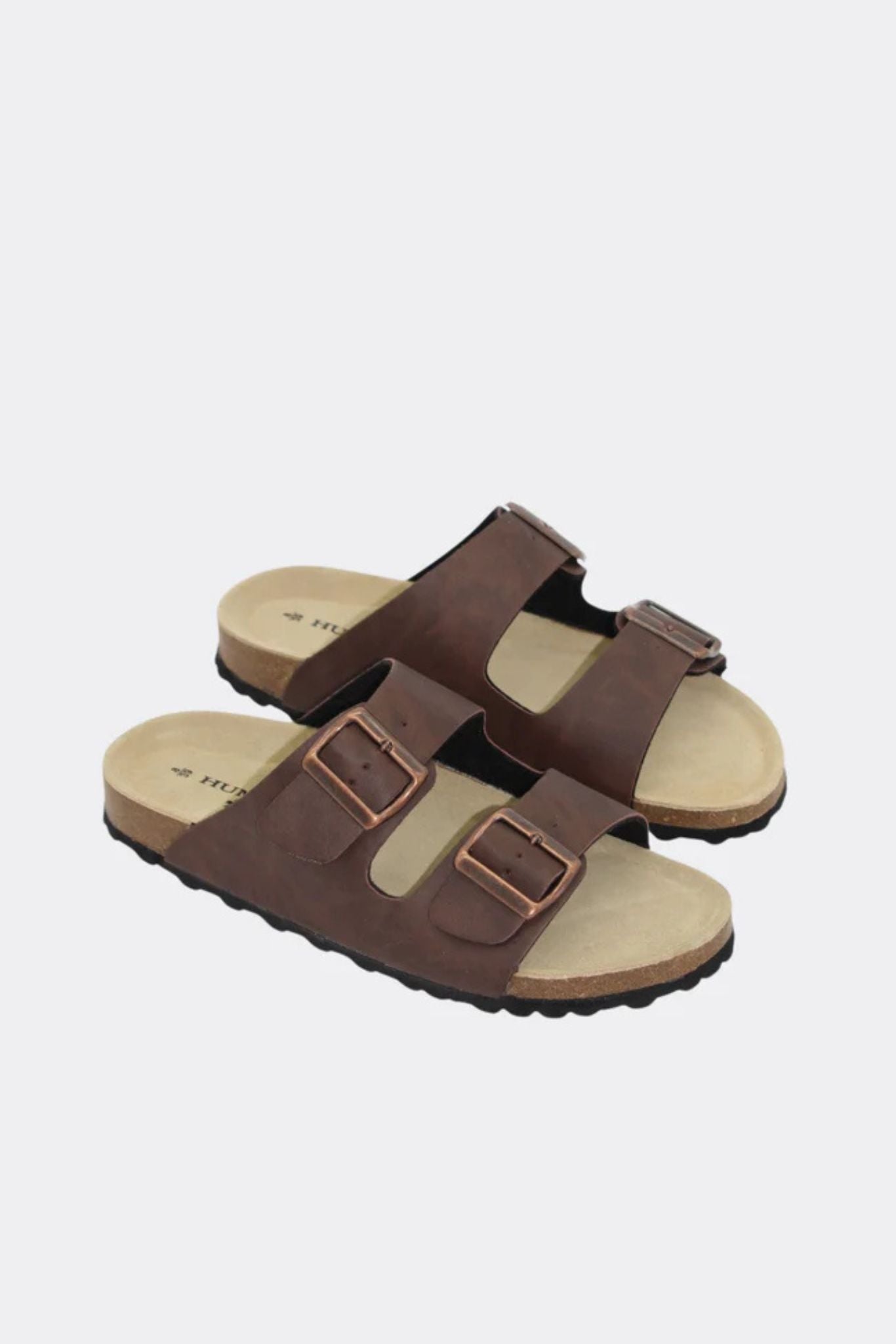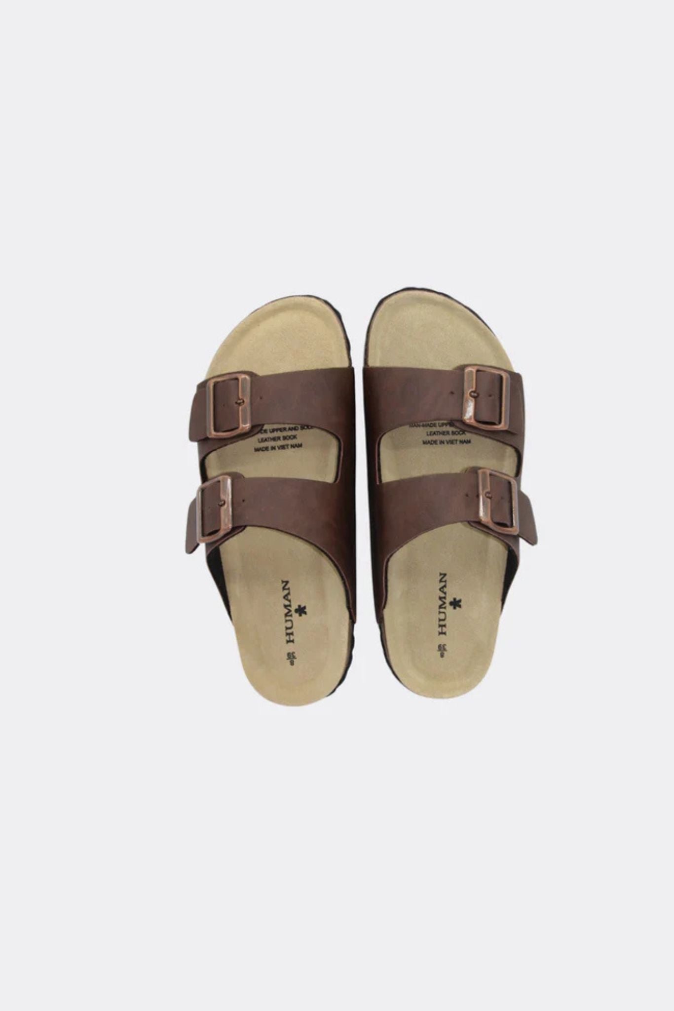 DESCRIPTION - double buckle slip-on sandals feature a molded sole for comfort, a non-leather upper, and a leather insole. equipped with metal adjustable buckles, they are thoughtfully designed in Australia and manufactured in Vietnam.