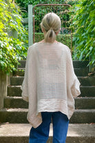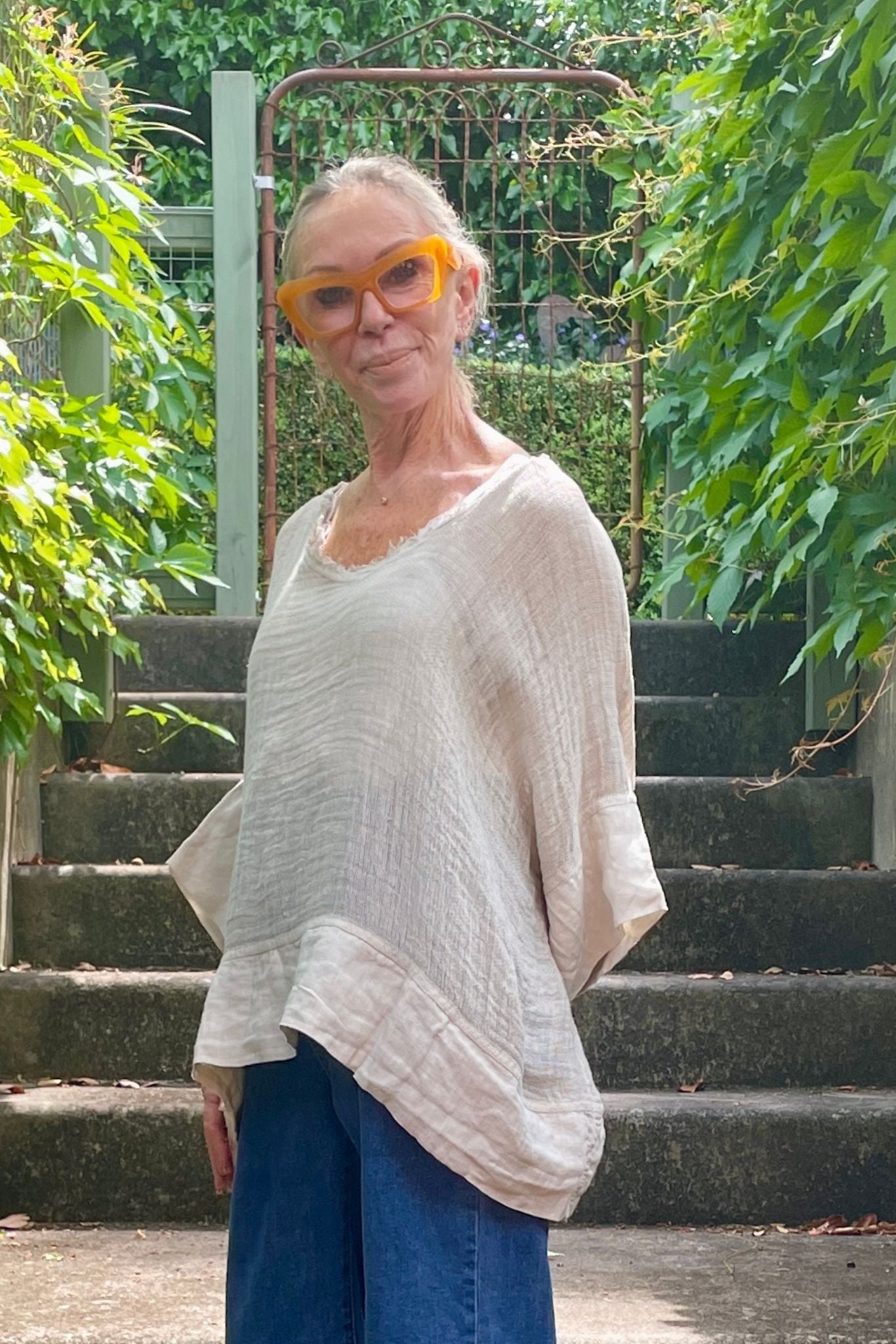 DESCRIPTION - the atrani top by italian cartel is a versatile linen tunic style top, featuring a delicate V-neckline with a subtle frayed trim and 3/4 sleeves accented by contrasting wide linen at the cuffs and hem. made in italy and crafted from a loose, textured linen fabric. this hip-length top offers effortless style and breathable comfort. perfect with jeans or relaxed linen pants.
