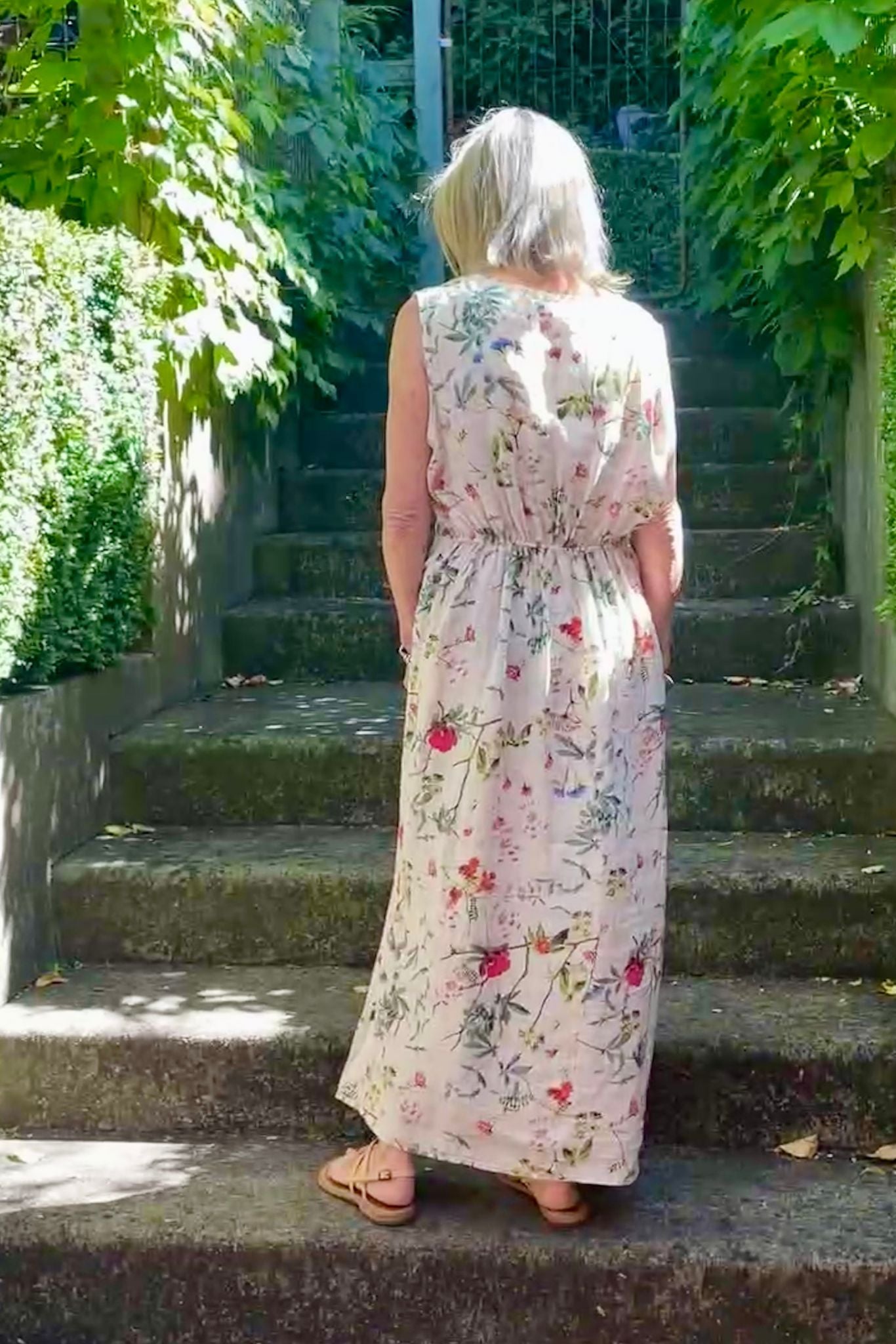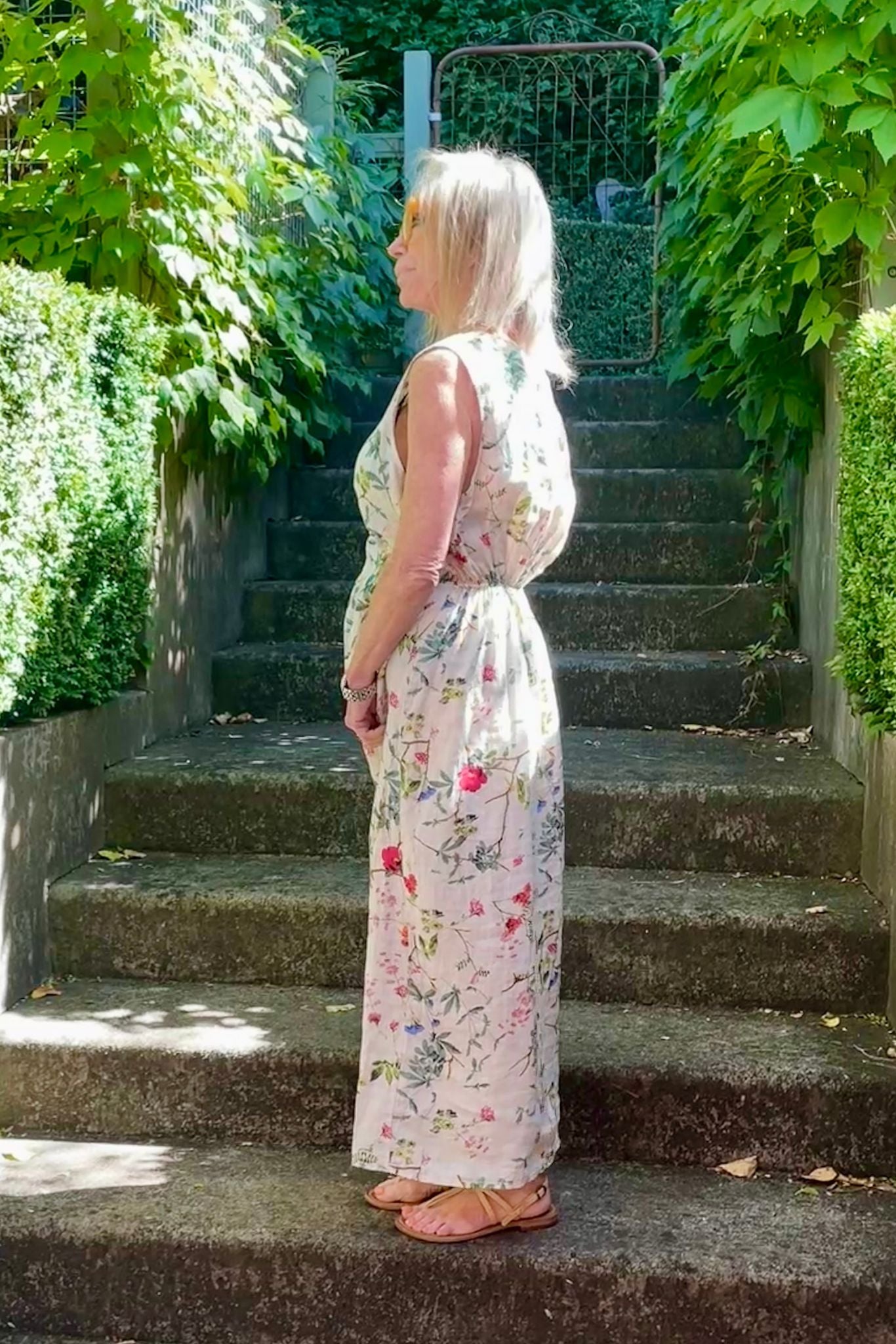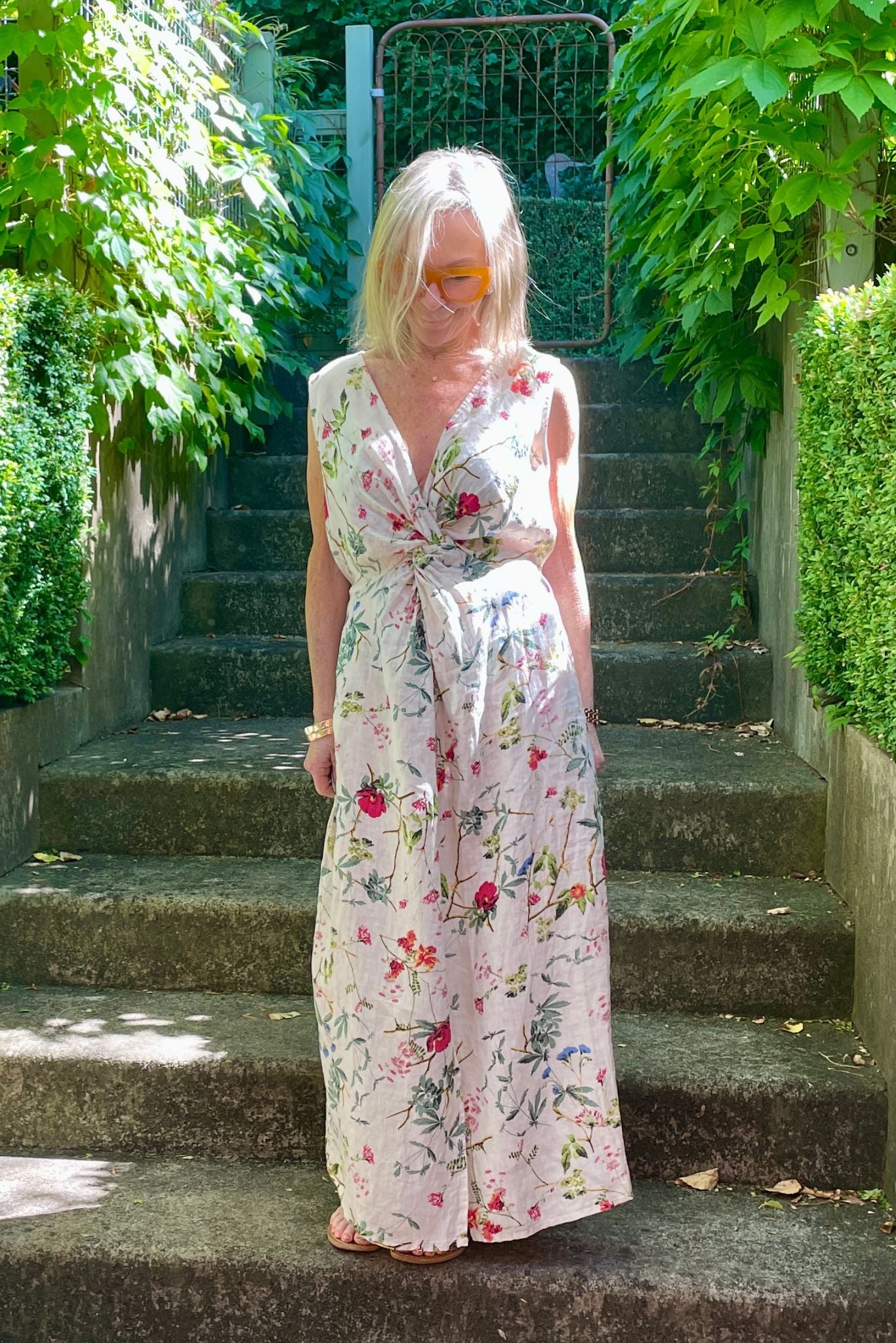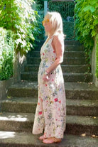 DESCRIPTION - discover the finella dress in floral with a cream base —an Italian-crafted piece. connstructed from luxuriously soft linen, this sleeveless midi features a flattering V-neckline and a subtle centre-front twist that enhances the silhouette. the generous cut provides comfortable movement, whilst back elastic at the waist ensures a refined fit. a discreet wrap-over detail on the skirt makes this a versatile, effortlessly wearable design.