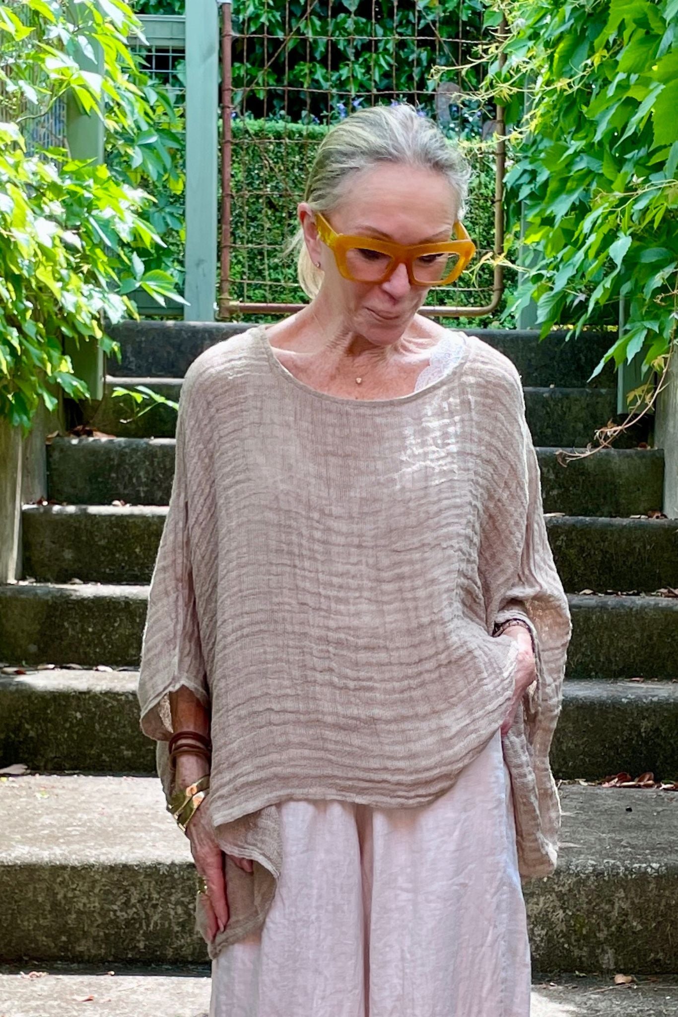 DESCRIPTION - the latina top, crafted in italy from 100% linen, offers a relaxed, boxy fit with a loose tunic silhouette and a wider round neckline. slightly shorter than the atrani and arezzo tops from italian cartel, this textured linen pairs beautifully with linen trousers or jeans. wear it alone or layered over a cami for effortless style. breathable and comfortable, this top is perfect for staying cool while looking chic.
