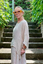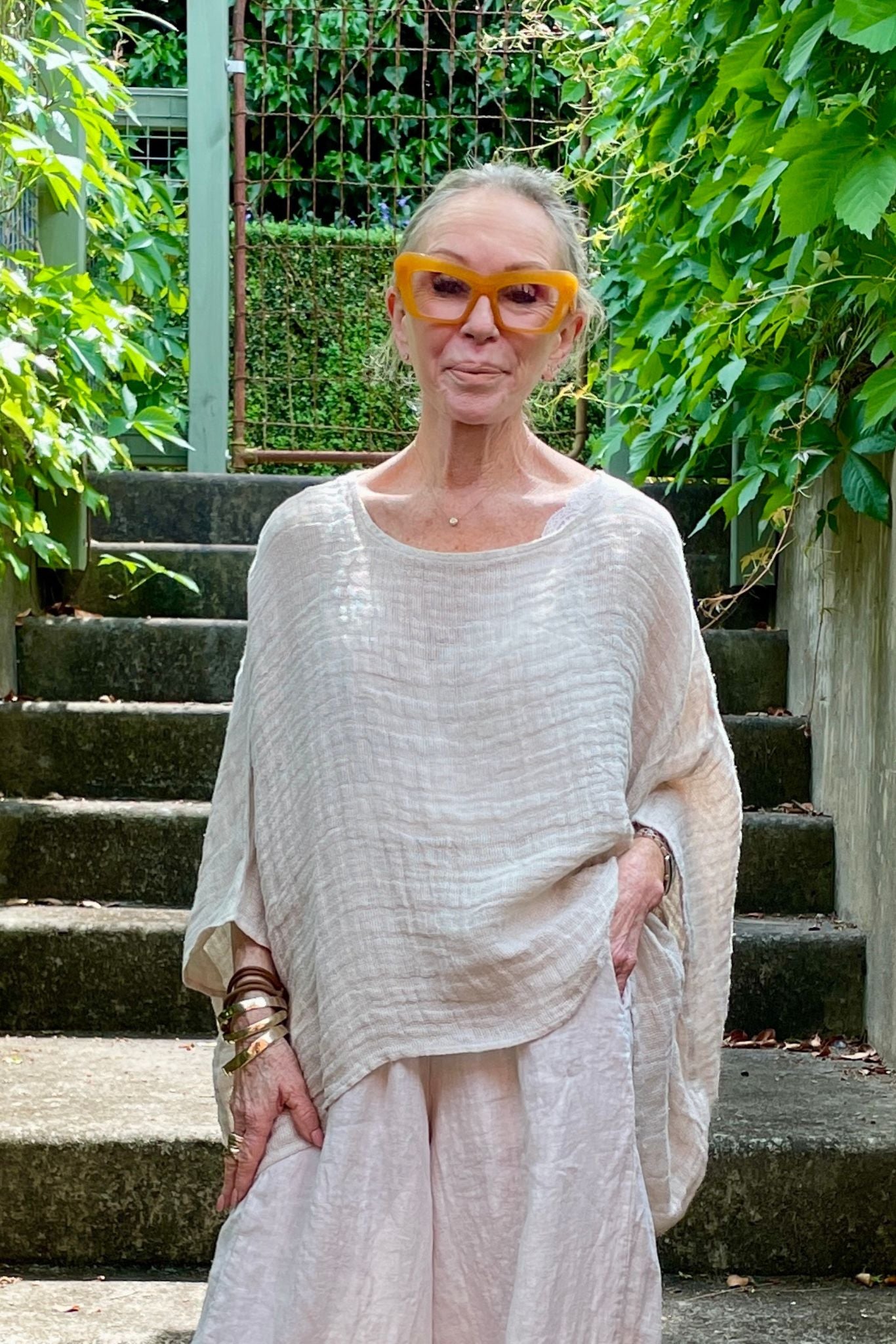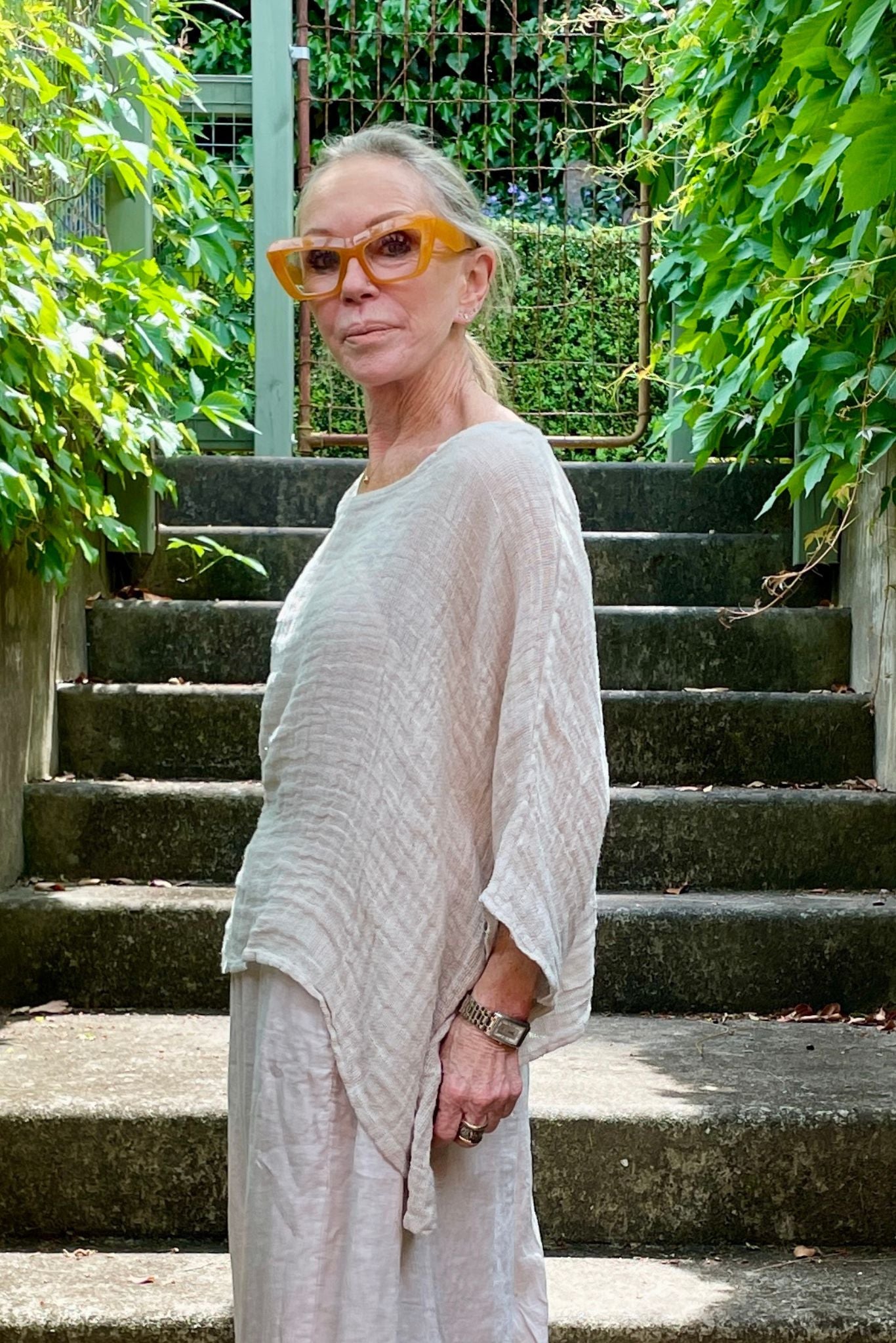 DESCRIPTION - the latina top, crafted in italy from 100% linen, offers a relaxed, boxy fit with a loose tunic silhouette and a wider round neckline. slightly shorter than the atrani and arezzo tops from italian cartel, this textured linen pairs beautifully with linen trousers or jeans. wear it alone or layered over a cami for effortless style. breathable and comfortable, this top is perfect for staying cool while looking chic.
