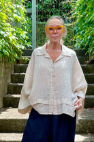 DESCRIPTION - crafted from soft Italian linen, the sanita shirt features an open neck collar and a button-up front. its relaxed, boxy fit is complemented by 3/4 to long sleeves and subtle button accents on the sides. expertly made in Italy, this shirt pairs perfectly with the navy fern pants also by italian cartel for a stylish, comfortable look.