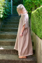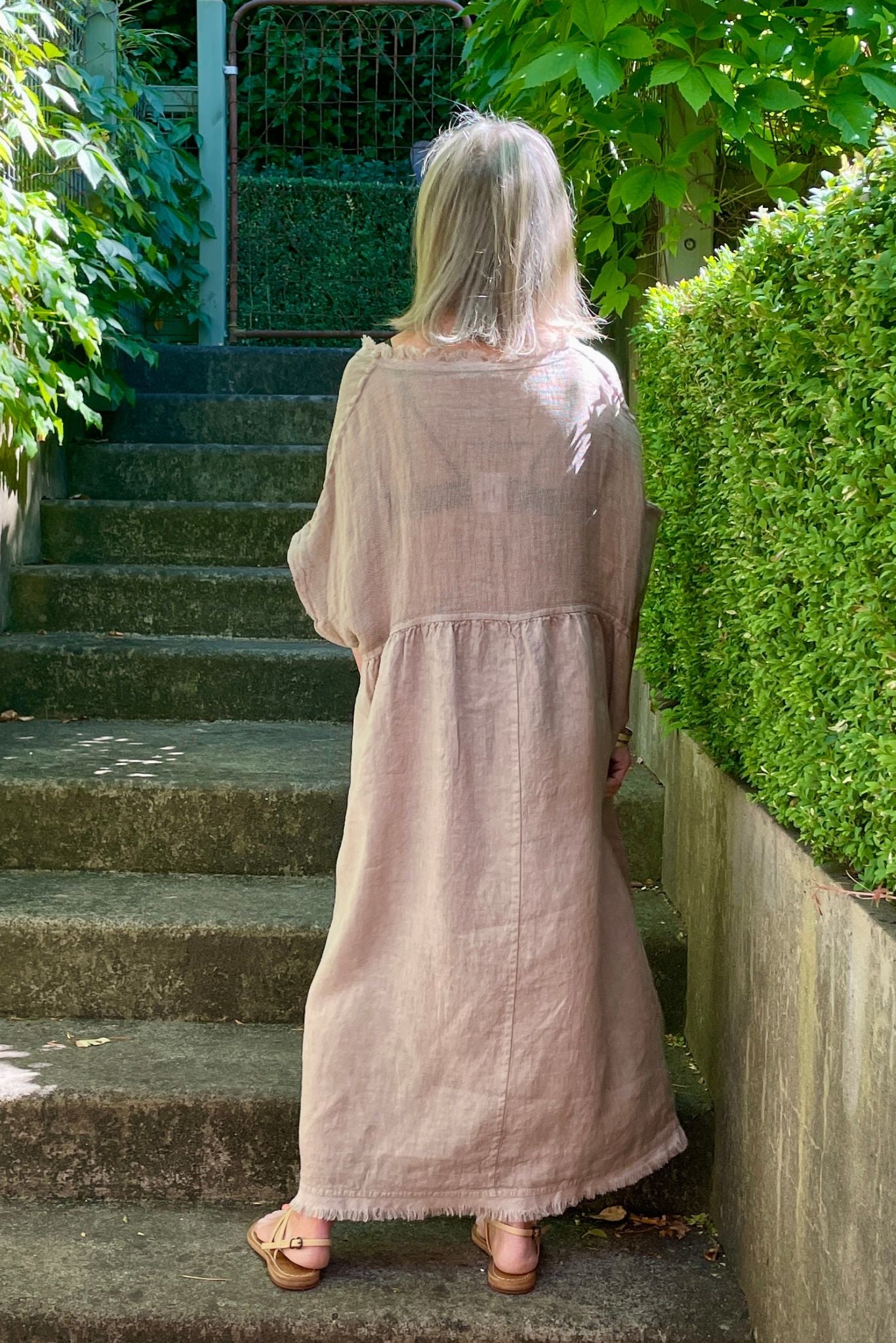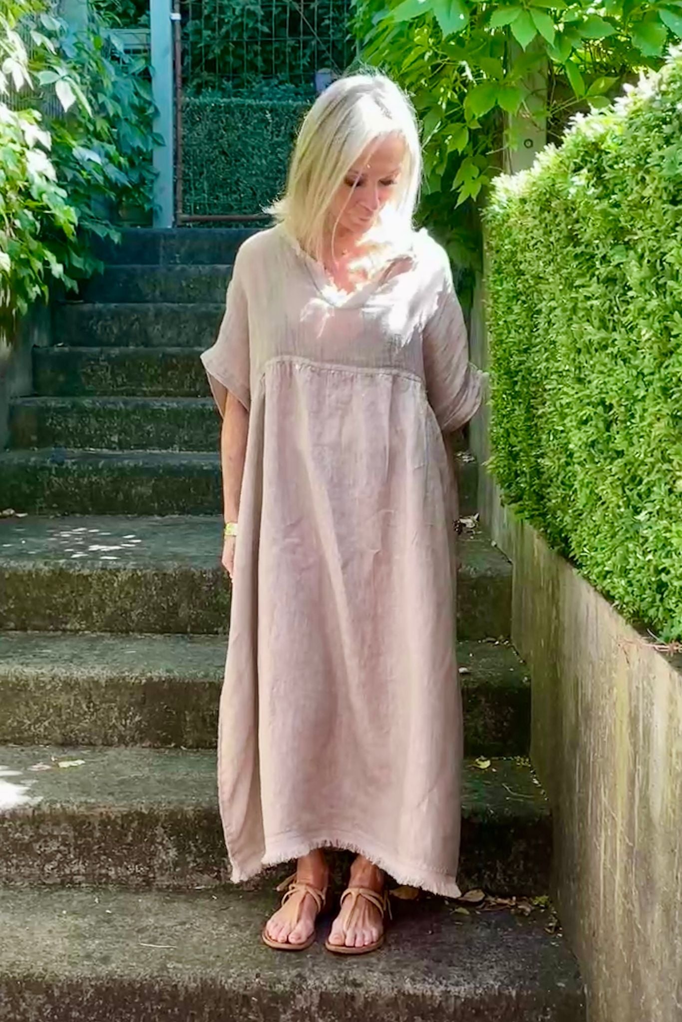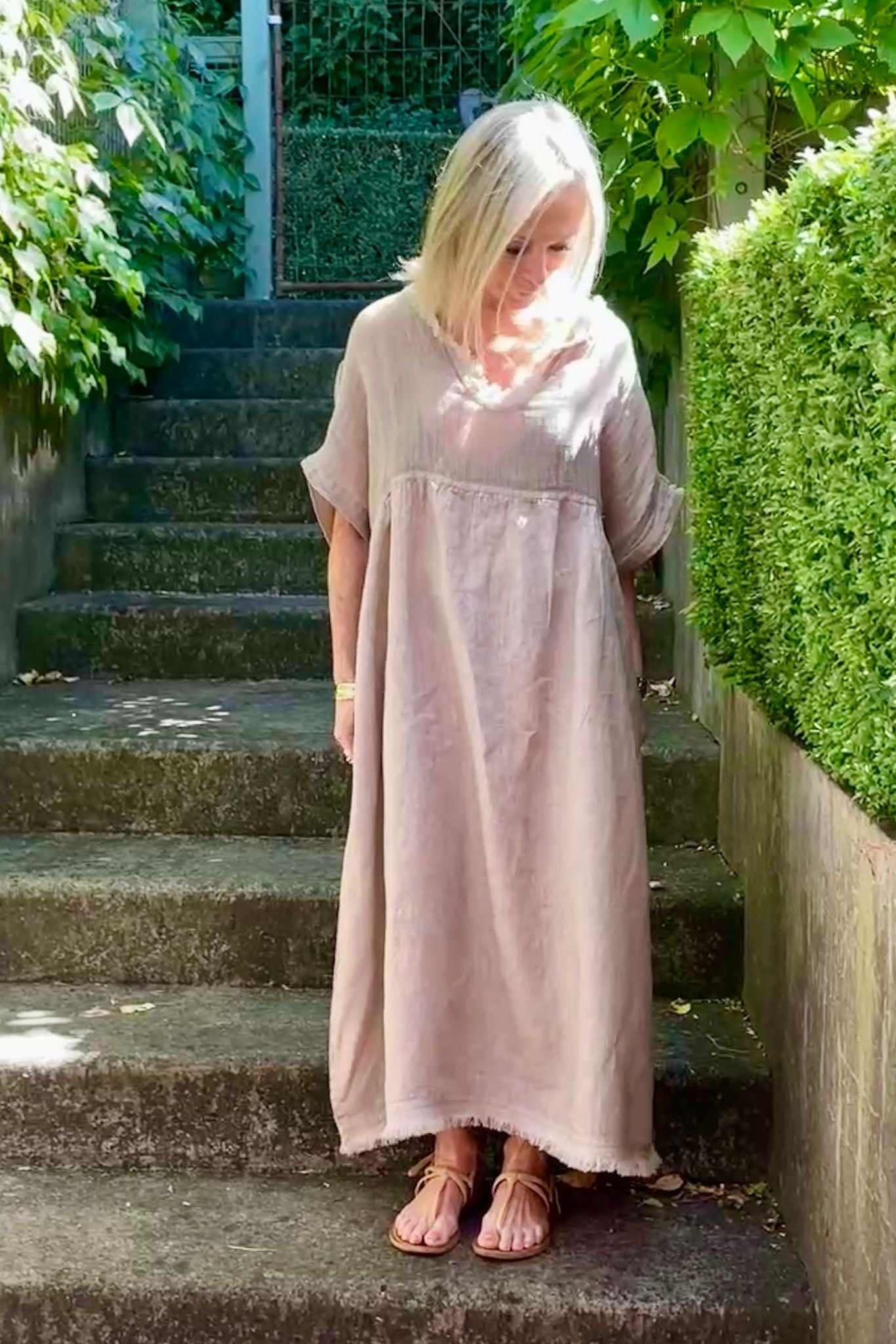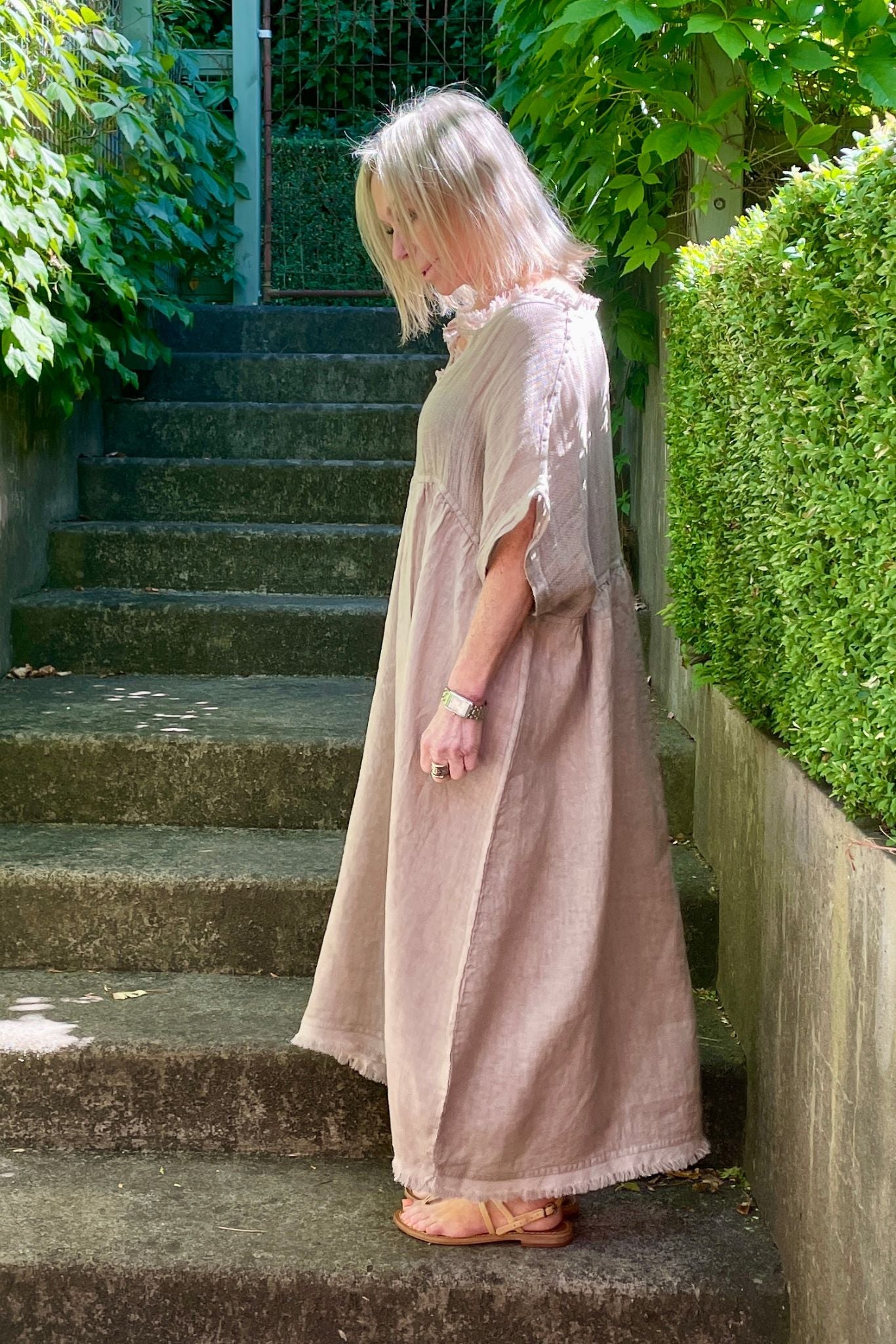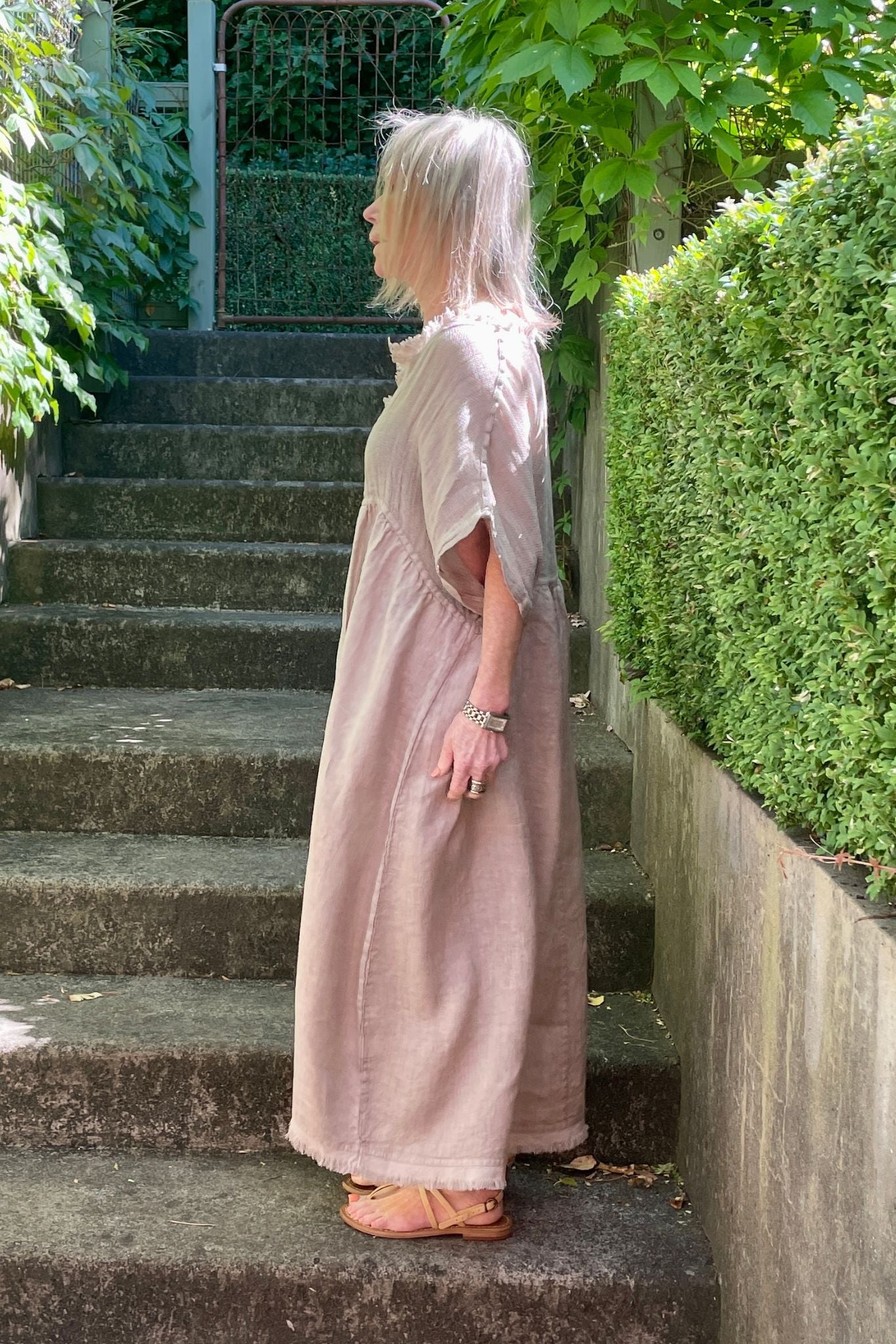 DESCRIPTION - our best selling valera dress is back in new colour-ways. crafted in italy from textured linen, this effortlessly wearable dress features an empire silhouette, an open neckline accented with frayed edges, and short, relaxed sleeves. falling to midi length, it embodies ultimate summer ease. wear it alone or layer with a cami, and complete the look with slides or sneakers for a casual chic look.