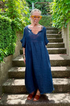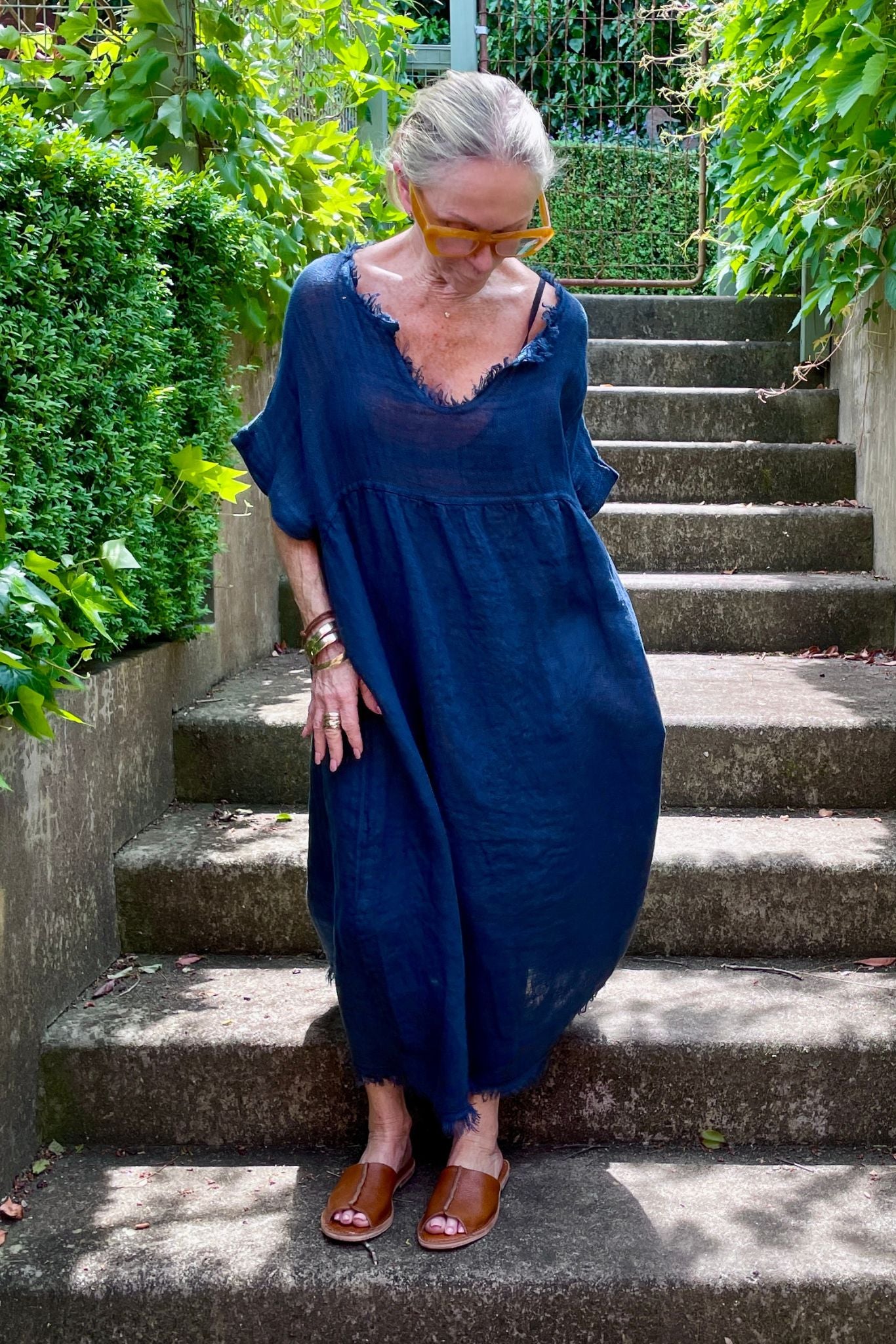 DESCRIPTION - crafted in italy from textured linen, this effortlessly wearable dress features an empire silhouette, an open neckline accented with frayed edges, and short, relaxed sleeves. falling to midi length, it embodies ultimate summer ease. wear it alone or layer with a cami, and complete the look with slides or sneakers for a casual chic look.