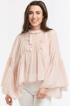 DESCRIPTION - the angel cropped blouse by italian star features exquisite lace panels extending from the high neckline down the bodice. it showcases a delicate ruffled collar that flows seamlessly onto the chest, a cropped front contrasted by a longer back, and prominent dropped shoulders accented by wide, intricately designed bell sleeves. an easy to wear style in one convenient size. shelly wears the angel blouse with italian stars daisy skirt.