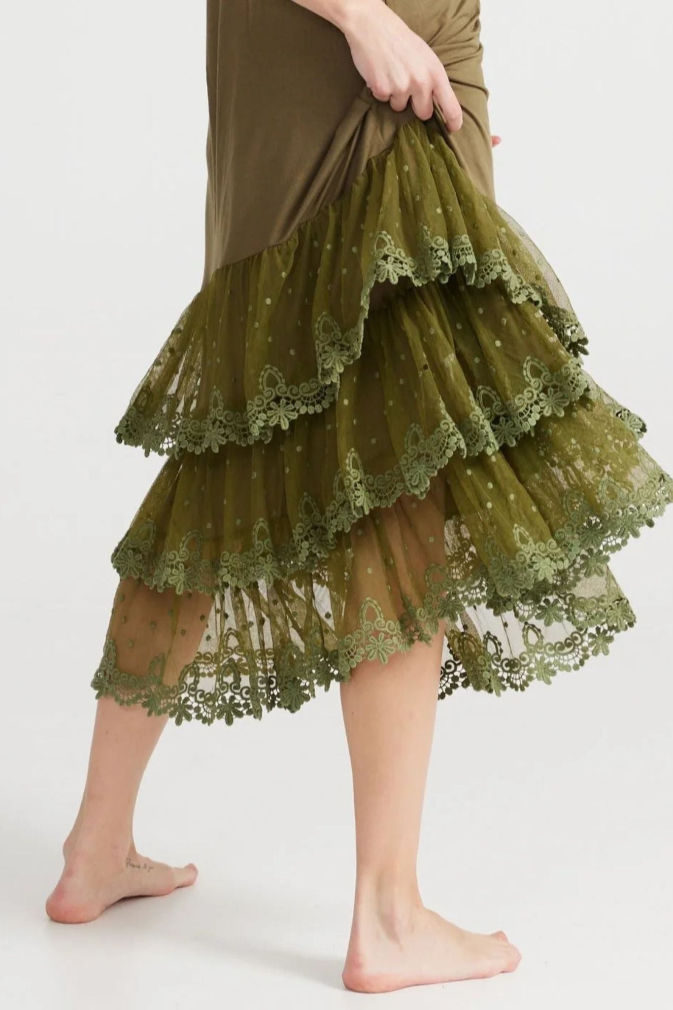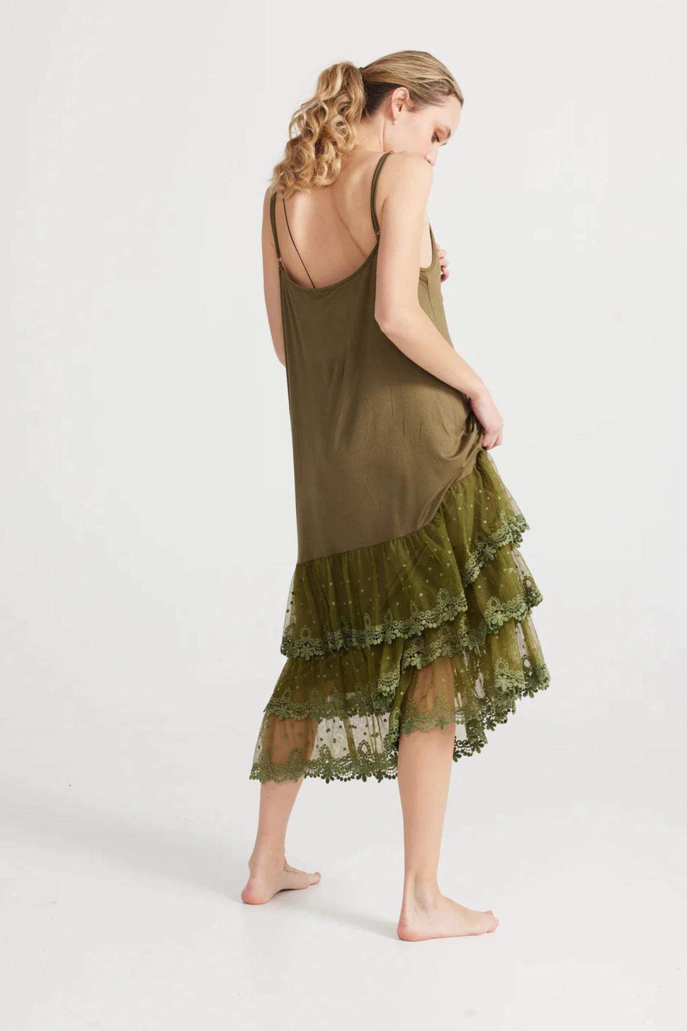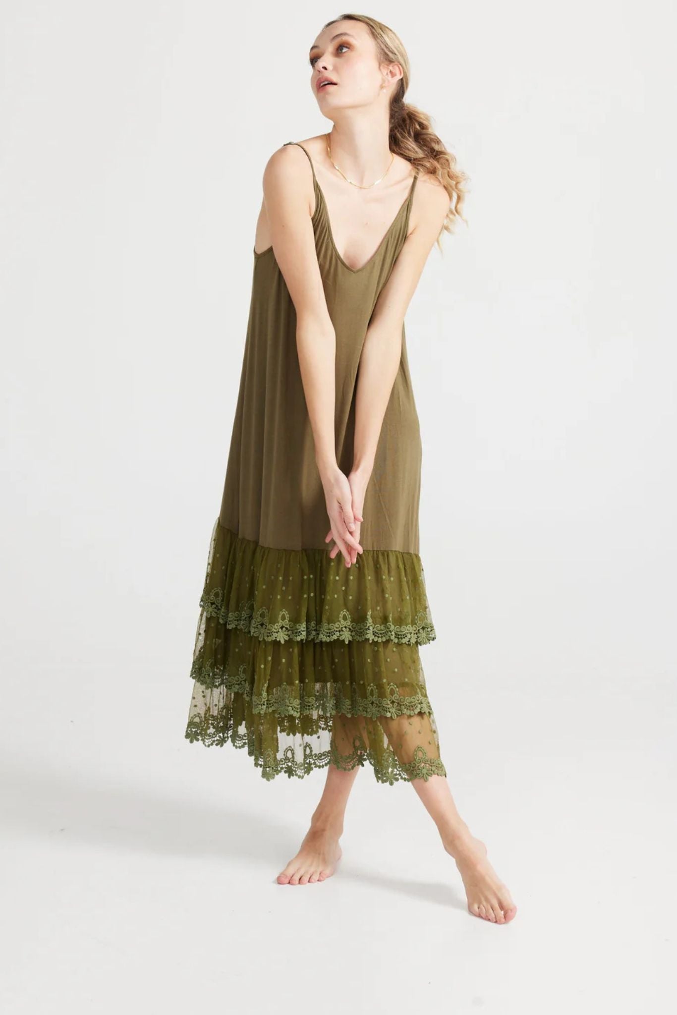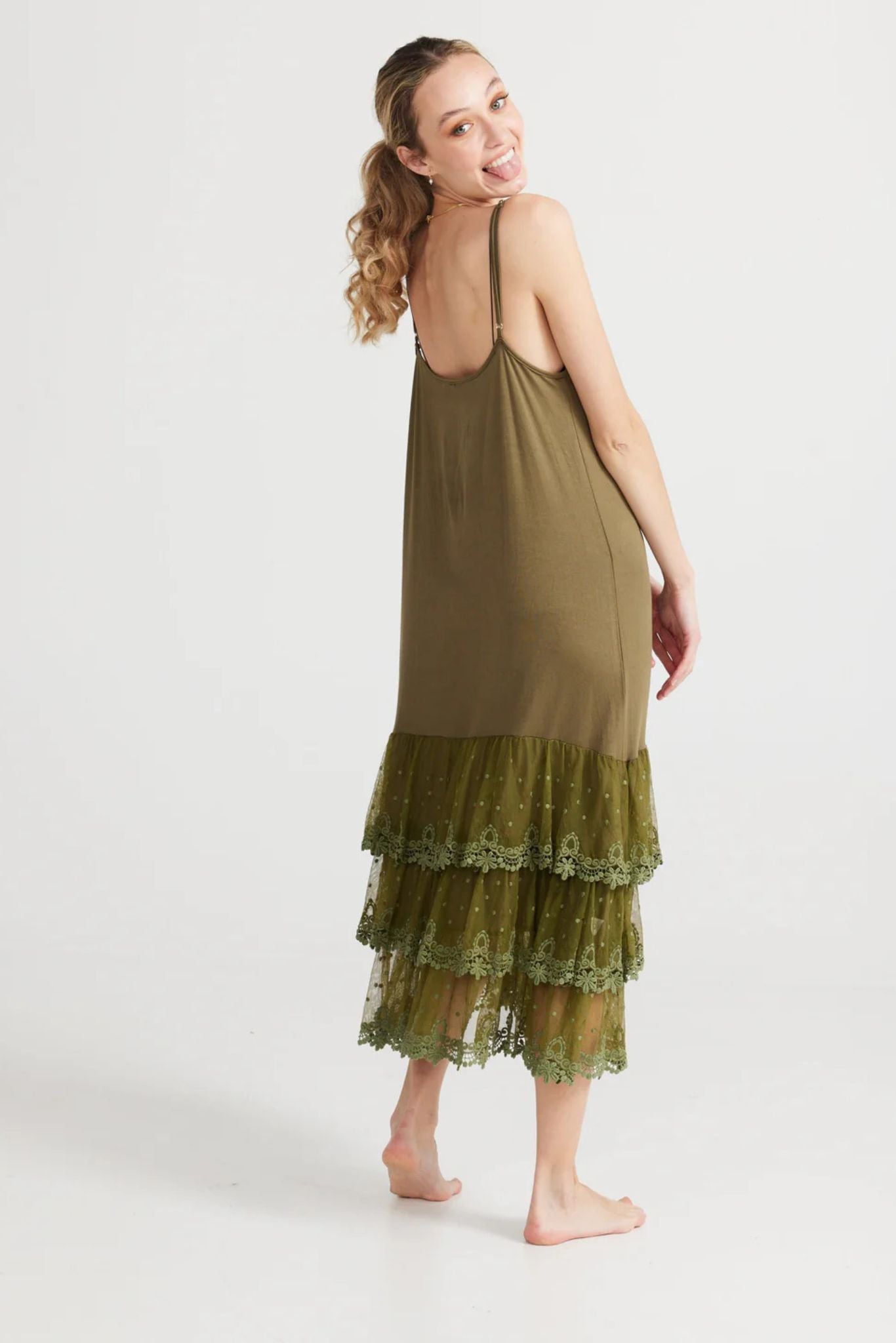 DESCRIPTION - the miss rose sister violet evangeline slip is simply stunning and so soft and stretchy. wear this lace slip in the cooler months with a big jumper, layer it under linen coats and dresses as you like all year. a v-neckline, adjustable straps, plain front and three beautiful tears of delicate lace.