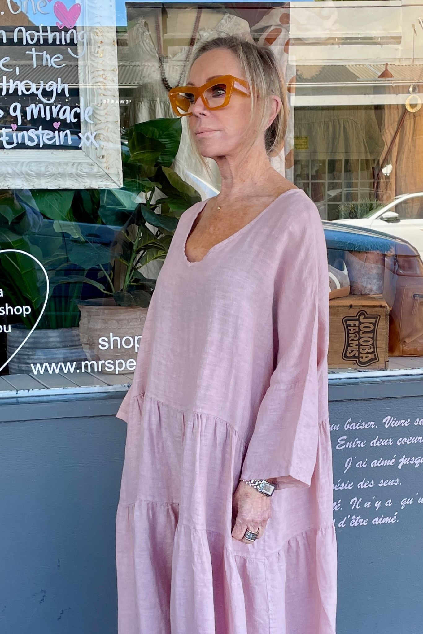 DESCRIPTION - the stella linen dress is a favourite for a reason. a soft V-neckline, a skirt featuring tiered layers that create a flattering A-line silhouette with a gentle flare, it offers a relaxed, oversized fit. crafted from italian pre-washed linen, it has a substantial weight and lovely structure, making it suitable for all seasons. wear it solo in summer or layer it with a long overshirt, boots, and leggings when it’s cooler or a cute slide or sneaker for a casual look. pre-washed for softness, it requires no ironing—the body’s warmth smooths out creases.