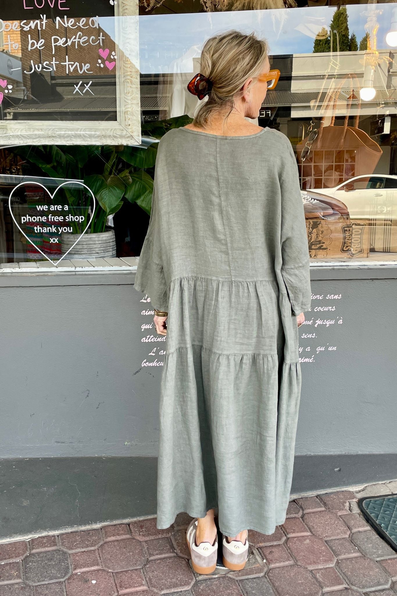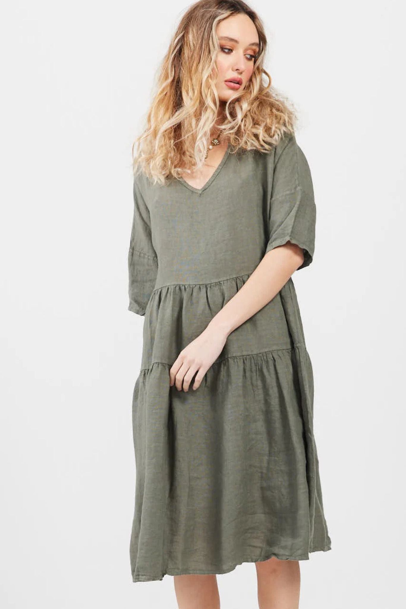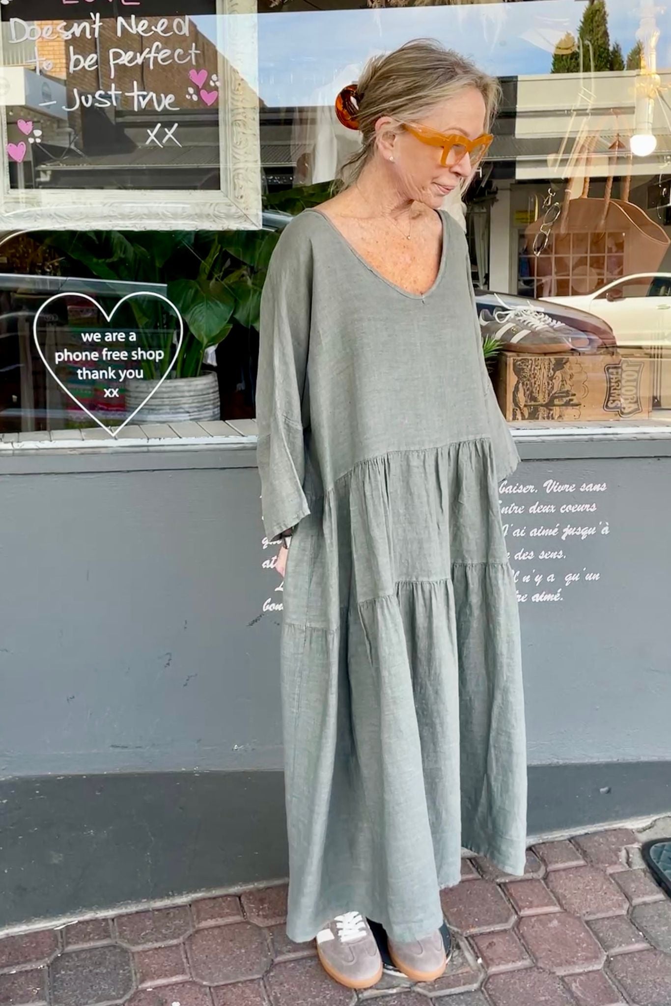 DESCRIPTION - the stella linen dress is a favourite for a reason. a soft V-neckline, a skirt featuring tiered layers that create a flattering A-line silhouette with a gentle flare, it offers a relaxed, oversized fit. crafted from italian pre-washed linen, it has a substantial weight and lovely structure, making it suitable for all seasons. wear it solo in summer or layer it with a long overshirt, boots, and leggings when it’s cooler or a cute slide or sneaker for a casual look. pre-washed for softness, it requires no ironing—the body’s warmth smooths out creases.