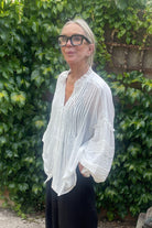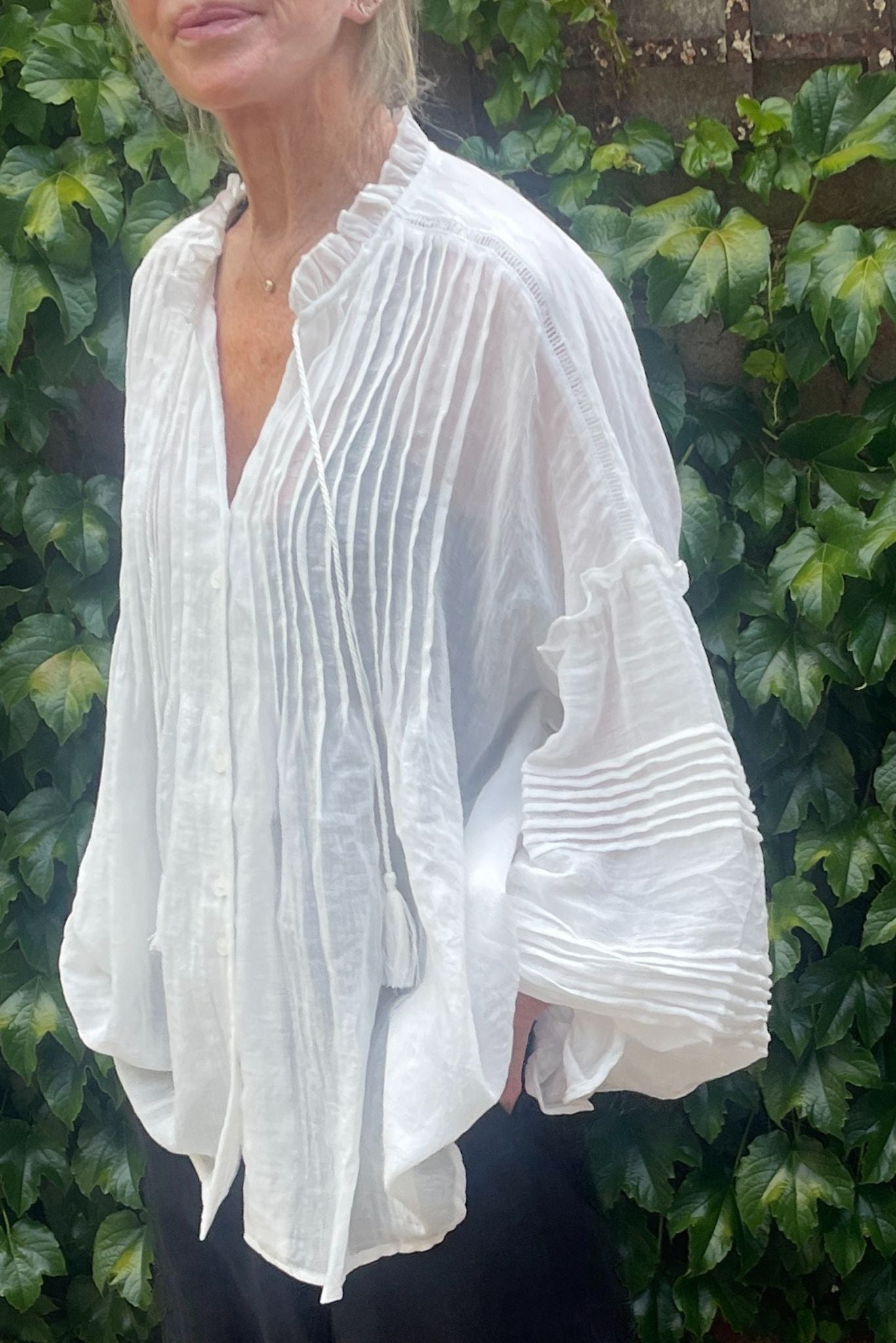 DESCRIPTION - the angelica shirt in white is an italian-designed piece featuring a ruffled neckline with cord tie, blanket stitching on the shoulders, and an oversized square cut. fine pleating on the front and sleeves, paired with voluminous balloon sleeves and elasticated cuffs, create a soft, feminine drape. the button-through front offers easy styling, while the cotton blend fabric keeps you comfortable all day long.