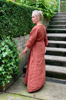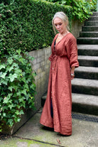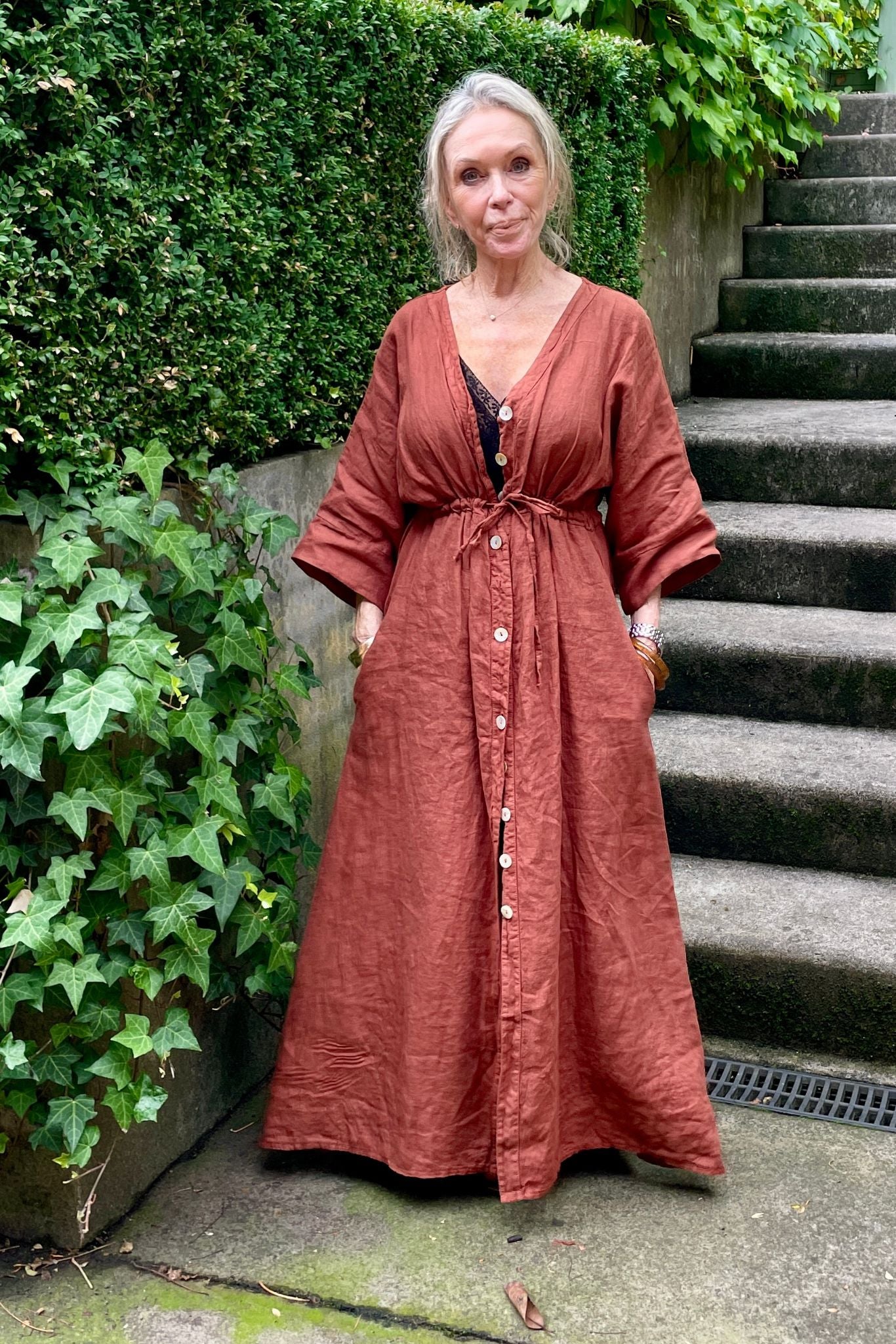 DESCRIPTION - crafted with refined simplicity, this midi dress showcases a V-neckline paired with an open front and button-through fastening for effortless styling. an adjustable drawstring cinches the high waist for a custom fit, while drop shoulders and three-quarter sleeves deliver relaxed sophistication. the midi silhouette strikes the perfect balance between polished and comfortable, making it an essential piece for versatile everyday wear.