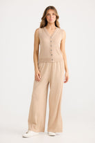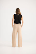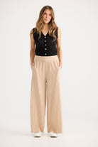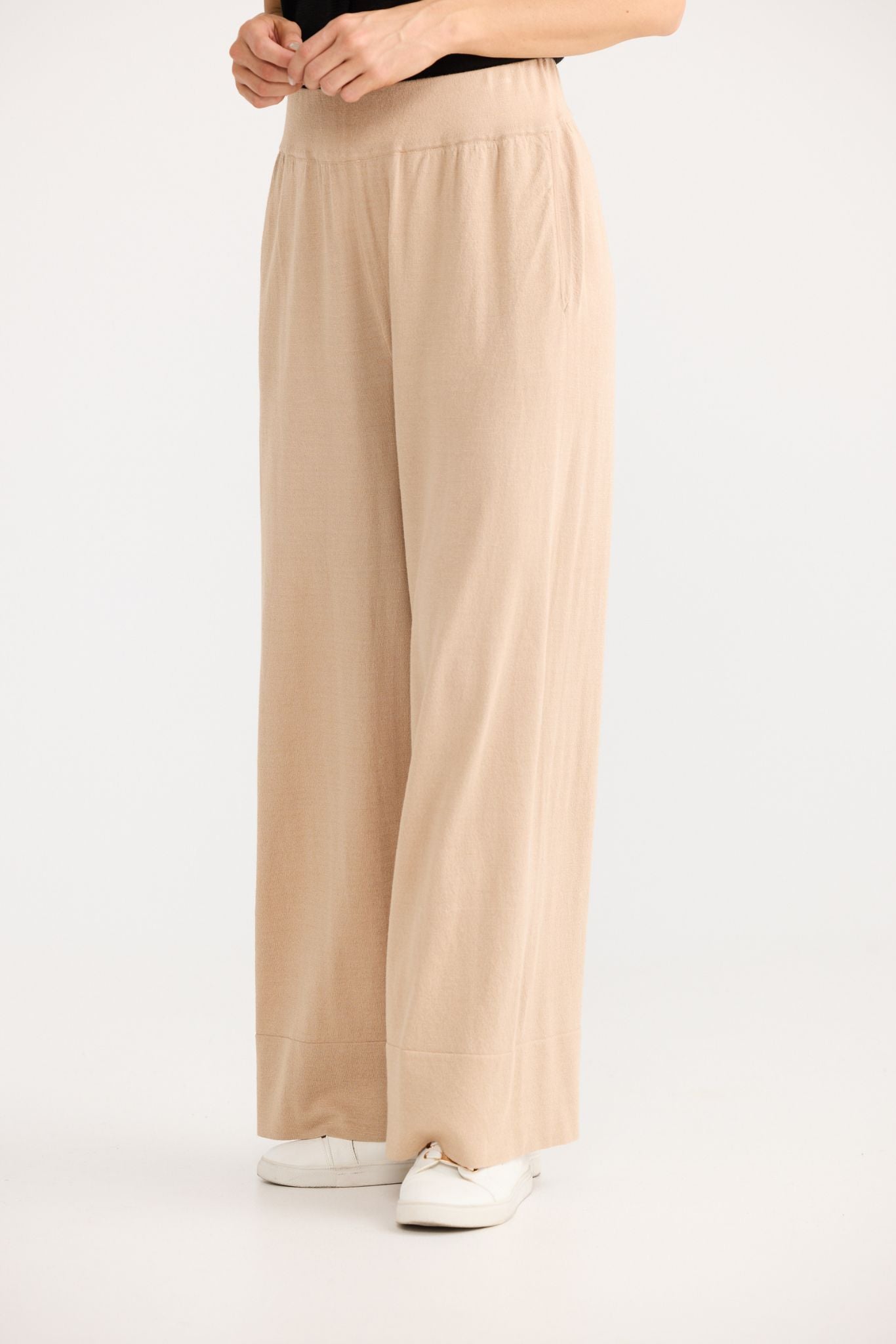 DESCRIPTION - the etta knit pant in rich, warm caramel is a versatile wardrobe essential designed for effortless comfort and style. featuring a wide elasticised waistband, functional side pockets, and a relaxed loose fit with flattering wide legs, this pant moves with you throughout your day. the soft viscose-rich fabric drapes beautifully while maintaining its shape. pair with the etta vest in black or caramel for a coordinated look, or style with your favourite tops for endless outfit possibilities.