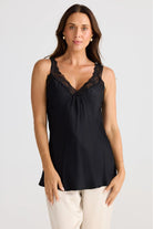 DESCRIPTION - the lois cami by brave + true showcases a refined V-neckline enhanced with delicate scalloped lace trim. carefully gathered fabric at both the front and back creates gentle shaping, ensuring a flattering silhouette. designed with a classic standard fit, this cami offers versatile comfort suitable for layering or wearing alone, making it an essential piece for a polished wardrobe.