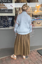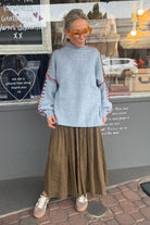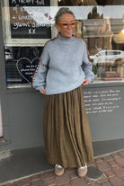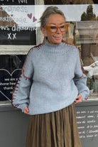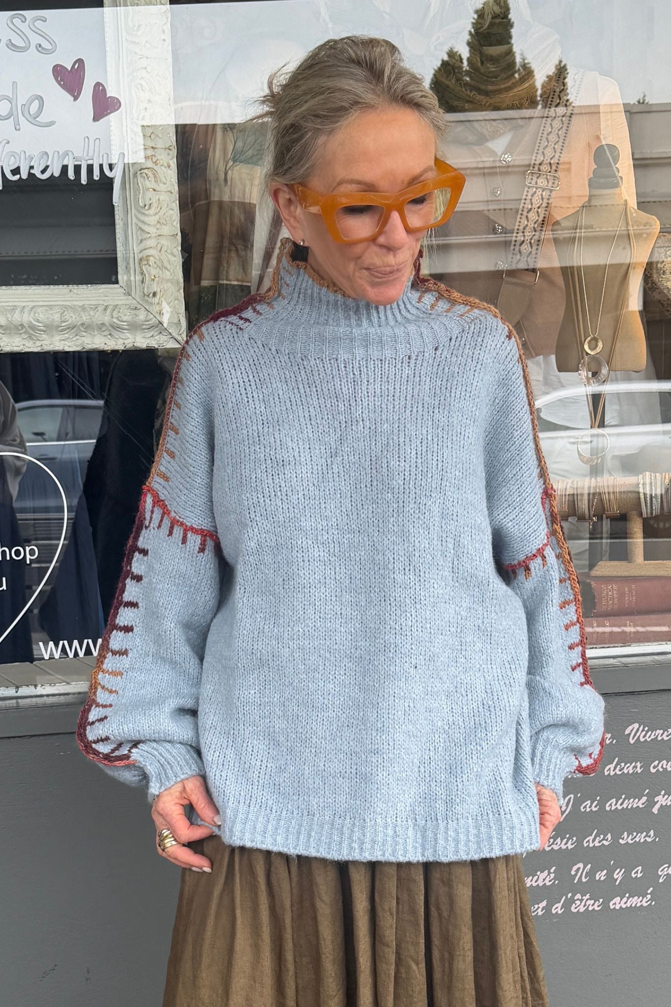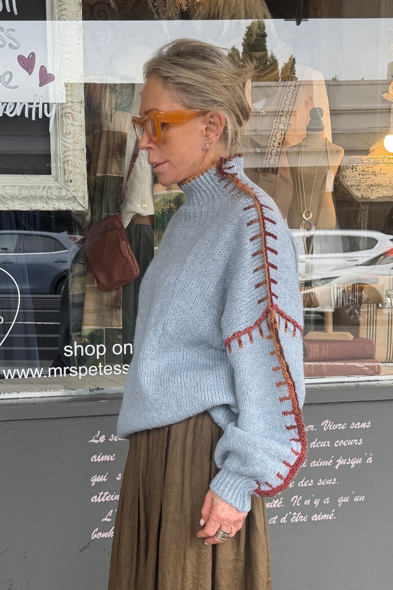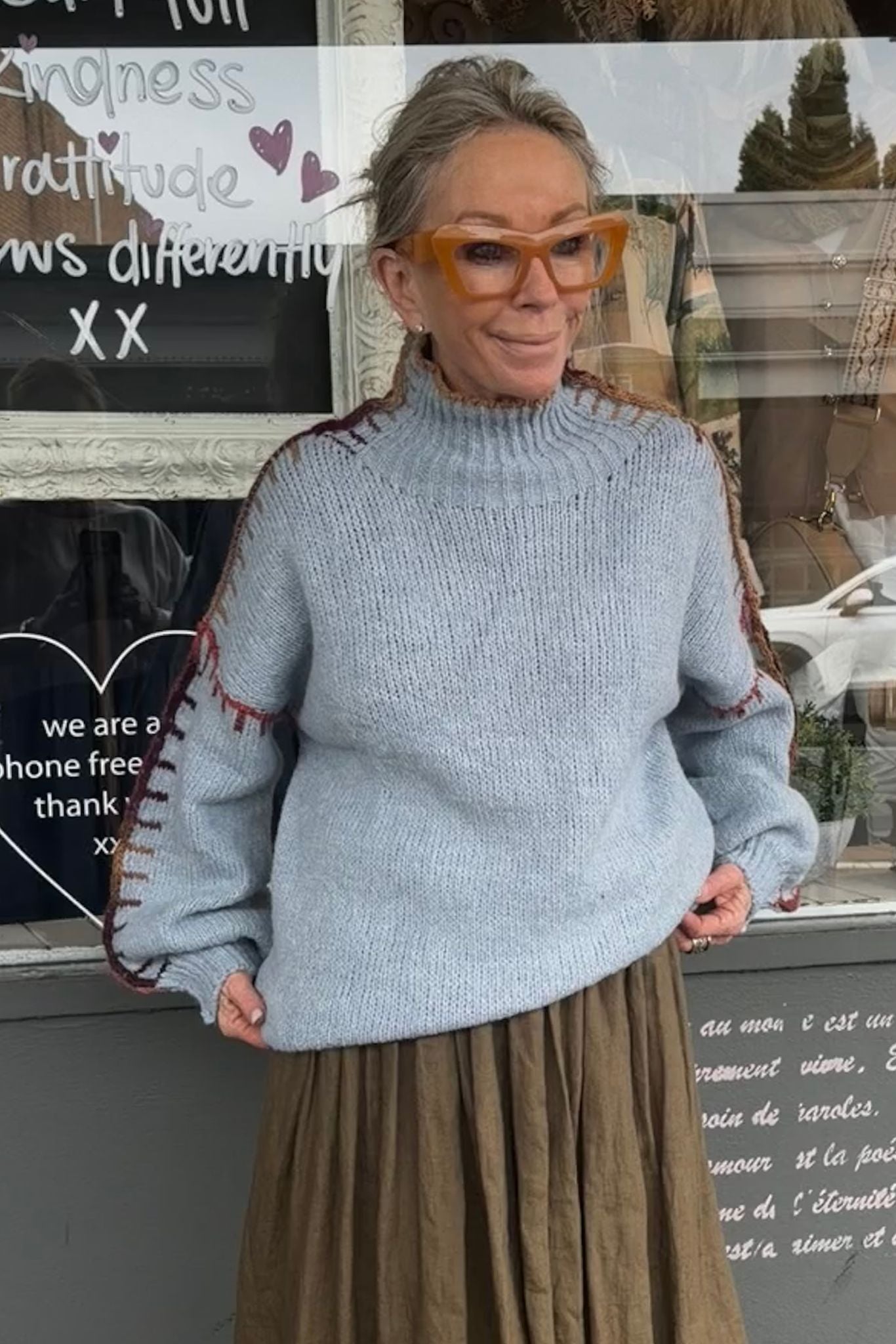 DESCRIPTION - the lucia jumper in sage is a relaxed, oversized knit featuring a cosy high turtleneck, loose box silhouette, and drop shoulders finished with distinctive contrast blanket stitching for added visual interest and texture.