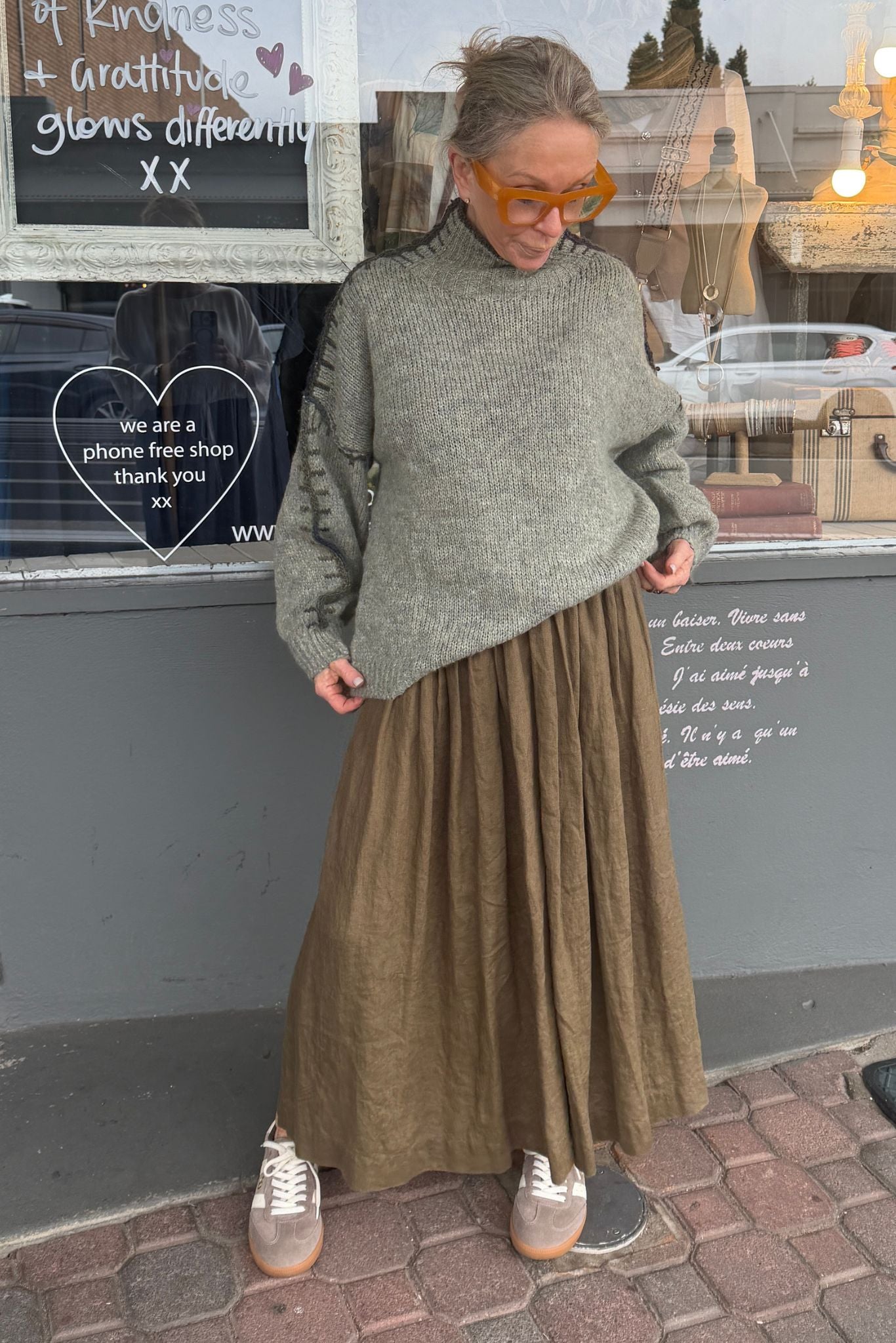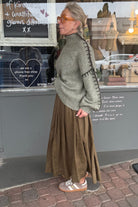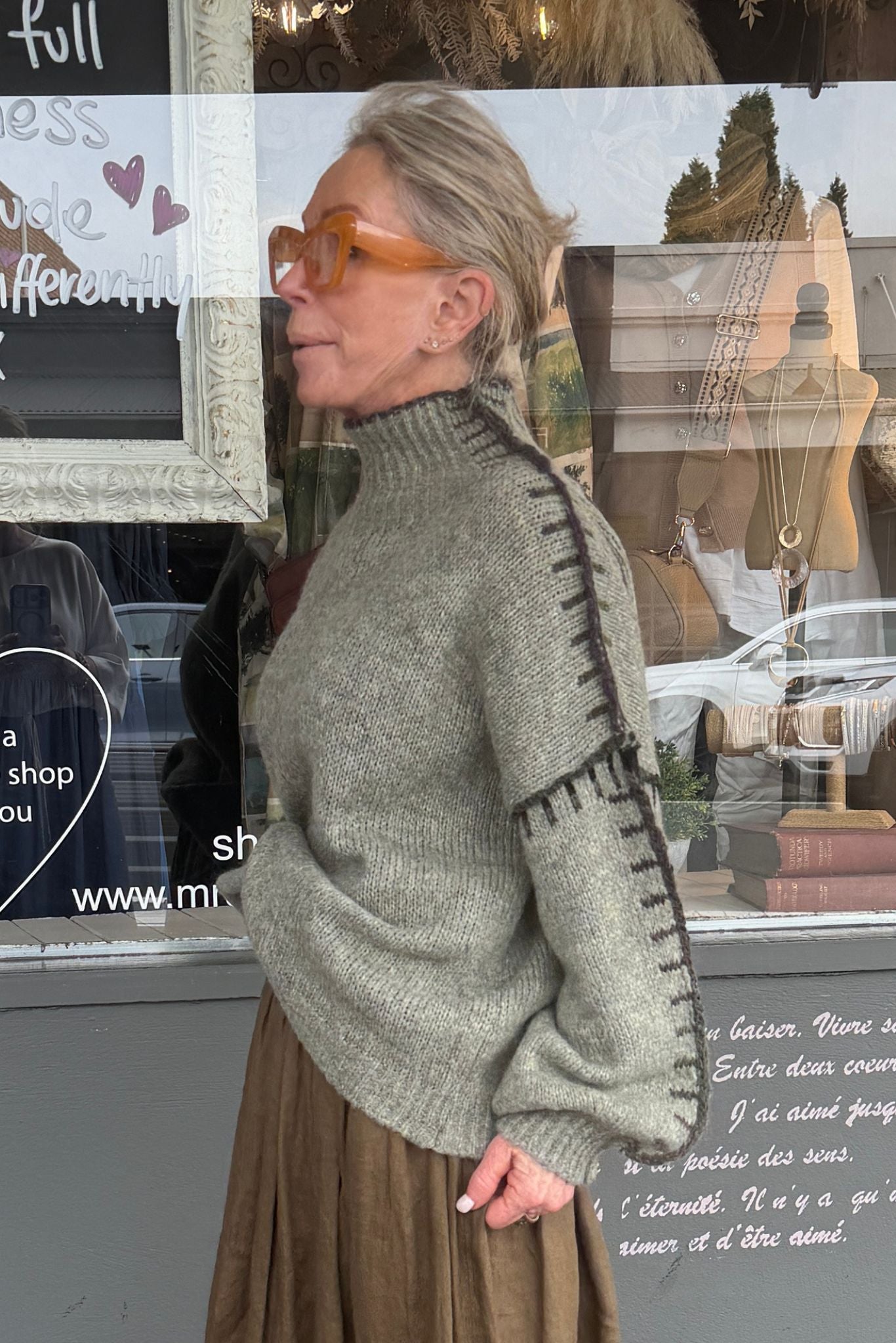 DESCRIPTION - the lucia jumper in sage is a relaxed, oversized knit featuring a cosy high turtleneck, loose box silhouette, and drop shoulders finished with distinctive contrast blanket stitching for added visual interest and texture.