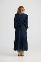 DESCRIPTION - the lunar wrap dress by talisman is crafted from lightweight cotton voile, ensuring breathable comfort and a soft, airy feel ideal for warmer weather. its true wrap design offers an adjustable fit, allowing ease of movement. the tiered skirt is detailed with delicate lace trim, introducing a refined texture. midi-length sleeves feature elasticated cuffs paired with subtle ruffles, combining a gentle, flowing shape. inseam pockets add practical functionality without disrupting the sleek, lines of the dress. falling to a perfect maxi length, this versatile piece transitions seamlessly whatever the occasion.