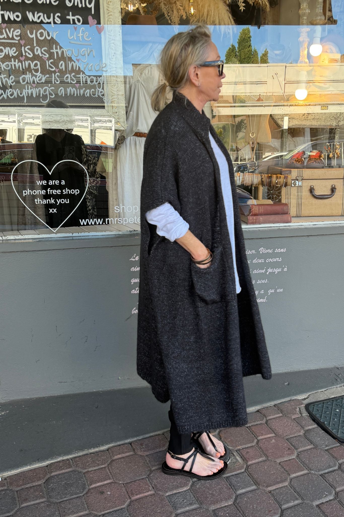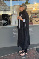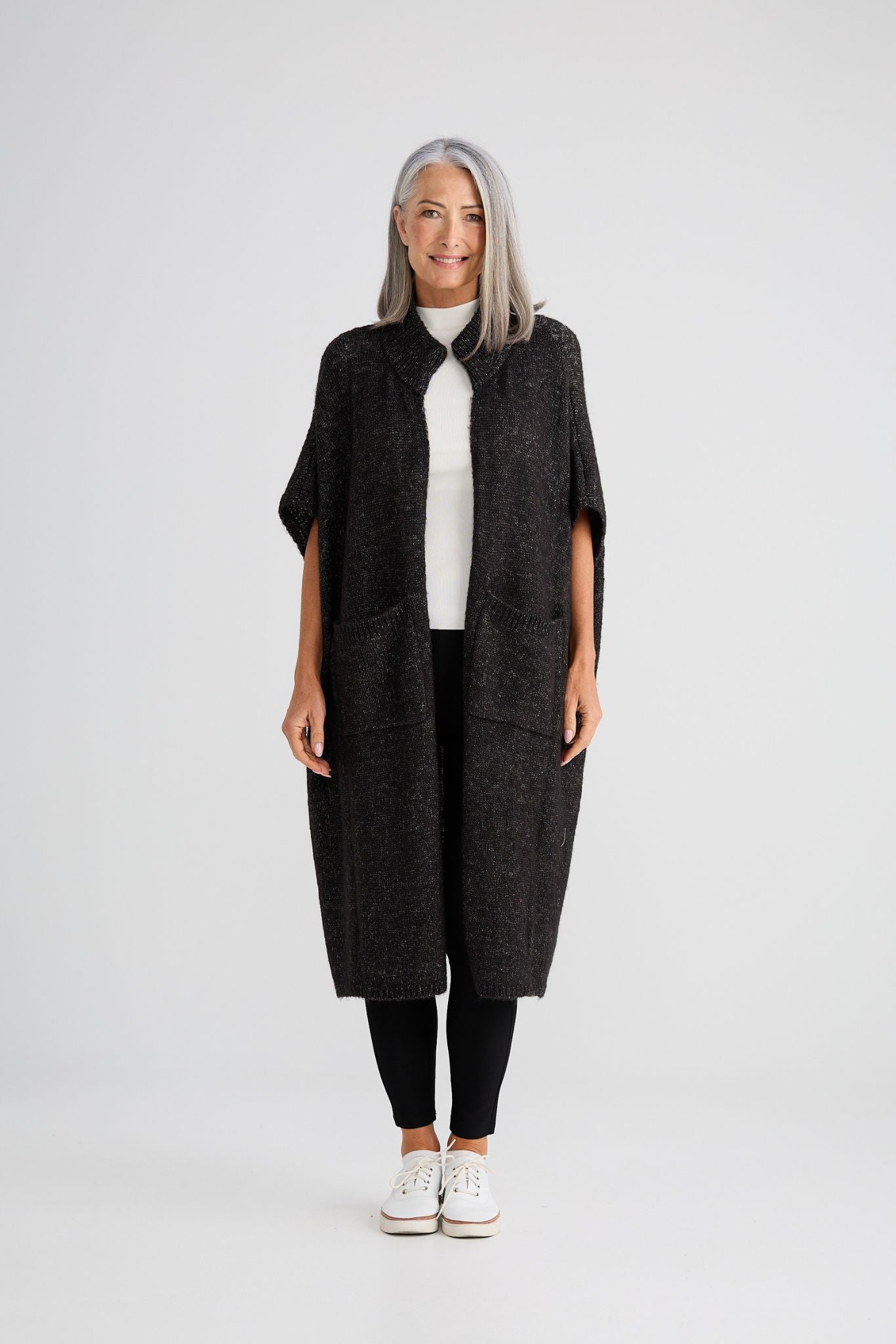 DESCRIPTION - the phoenix knit cardigan in charcoal, a deep, dark, and neutral shade of grey, designed for effortless everyday style. this midi-length cardigan features a relaxed, wide fit that flatters a range of sizes, making it the perfect addition to any wardrobe. with its round neck ribbed collar, short sleeves, and practical front pockets, this piece combines comfort with functionality. crafted from a soft wool blend knit, this durable, wearable garment moves with you.