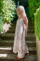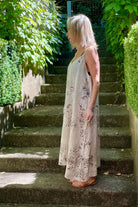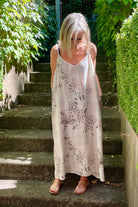DESCRIPTION - this italian linen slip dress showcases a refined textured print against a soft sand, delivering both style and comfort. the A-line cut provides a flattering drape that moves freely without clinging to the body, perfect comfort during warm weather. features include adjustable shoestring straps, a softly sculpted V-front neckline, and a considered midi length that balances sophistication with ease.