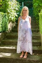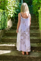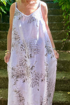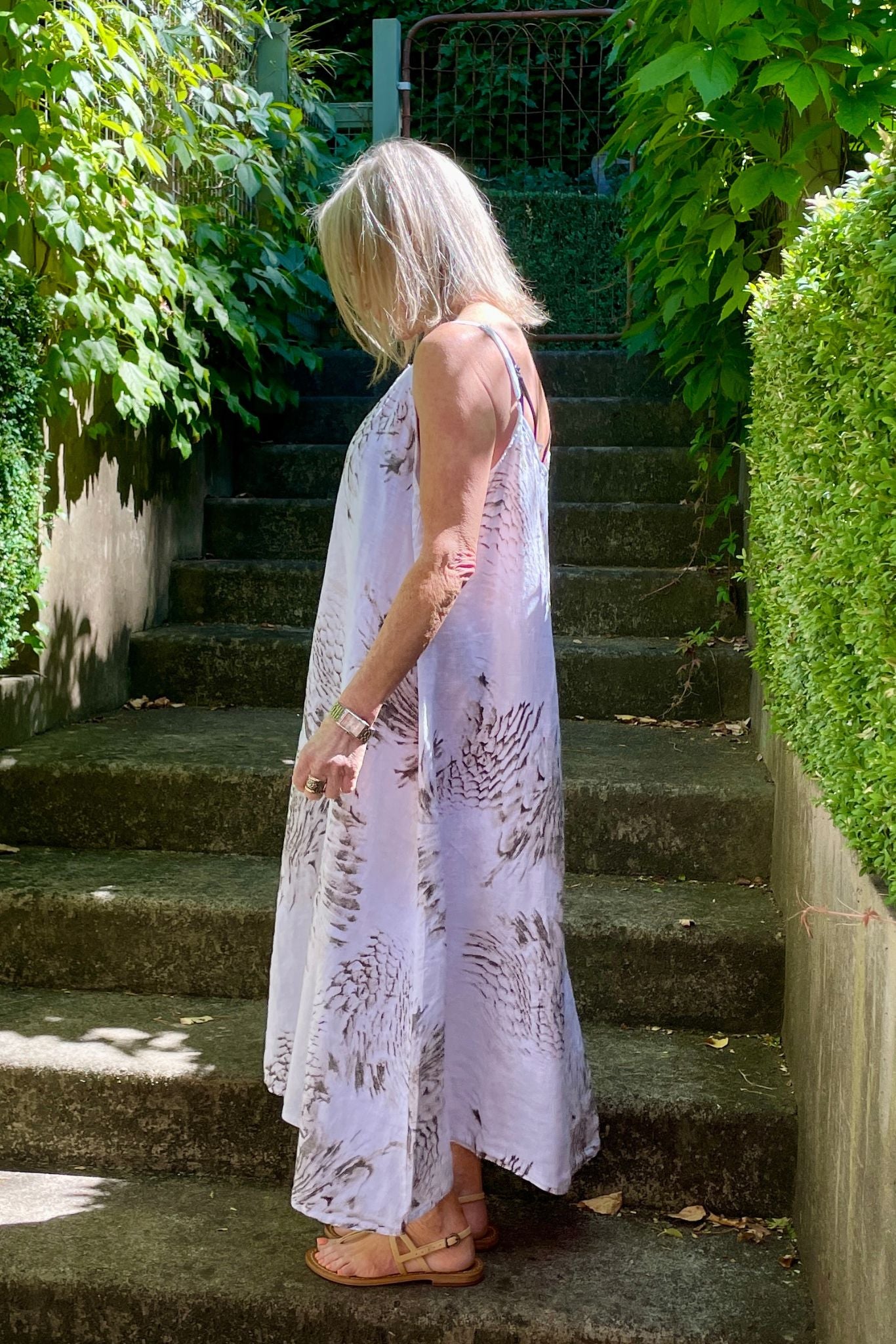 DESCRIPTION - this italian linen slip dress showcases a refined textured print against a fresh white, delivering both style and comfort. the A-line cut provides a flattering drape that moves freely without clinging to the body, perfect comfort during warm weather. features include adjustable shoestring straps, a softly sculpted V-front neckline, and a considered midi length that balances sophistication with ease.