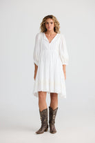 DESCRIPTION -the solstice mini dress by talisman features a round neckline and chic boho style relaxed fit. the dress is enhanced with adjustable neck ties that add a customisable touch to your look. empire line and full skirt, gathered 3/4 sleeves cuffed at the ends create subtle volume and structure, while delicate lace trim accents lend a refined, feminine finish. with its flattering mini length, this dress is perfect for day or evening, offering a versatile piece that effortlessly elevates your wardrobe for summer. make it casual with your sneakers or a dress up with a slide.