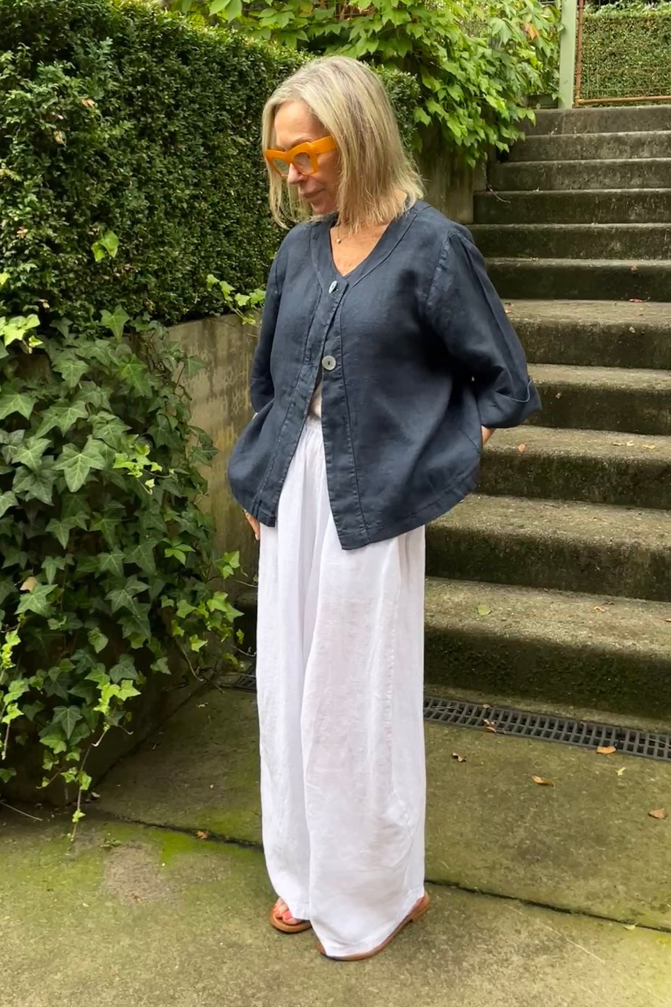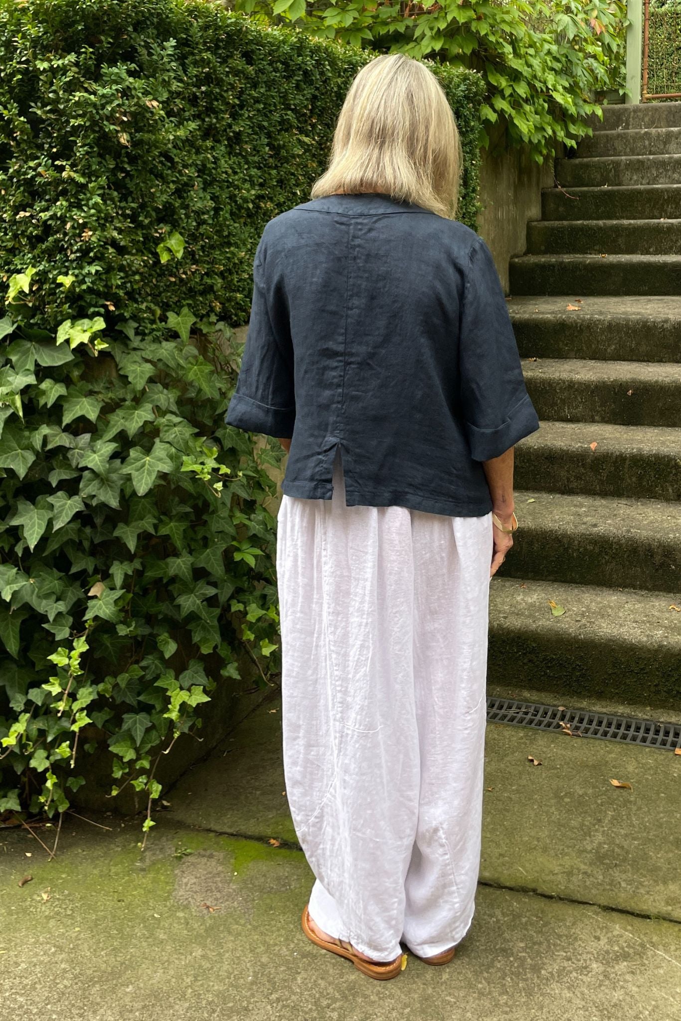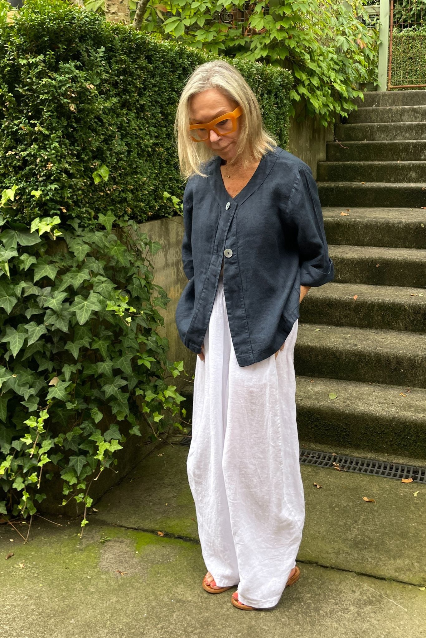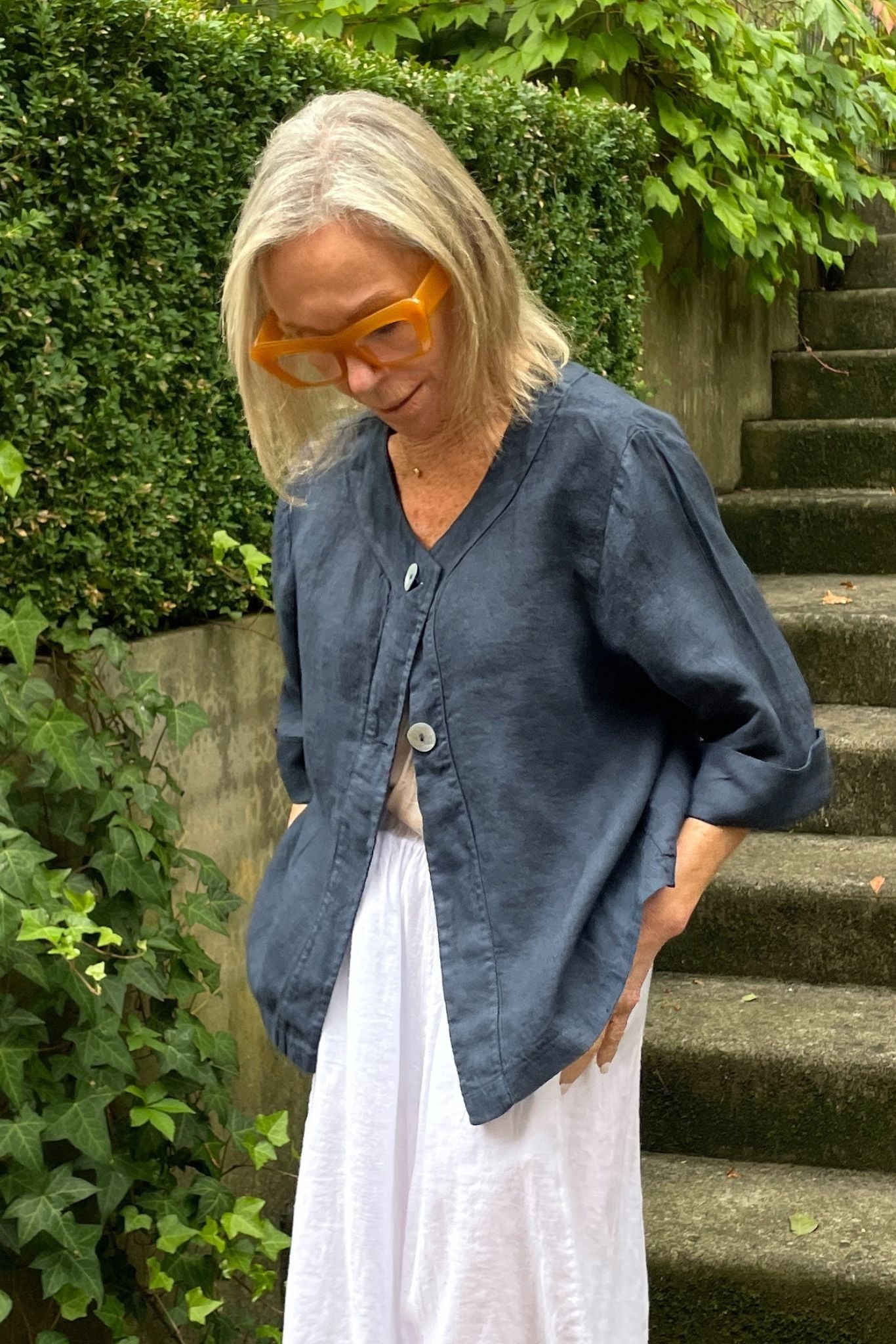 DESCRIPTION - tailored from italian linen, the treviso jacket delivers the flexibility needed for transitional dressing. its unstructured design features a round neckline, two-button closure, and three-quarter sleeves—pairs effortlessly over basics or under heavier outerwear. the relaxed fit and hip-length cut provide comfortable layering through spring and autumn, making it an indispensable wardrobe staple for those who value understated quality and practical style.