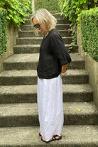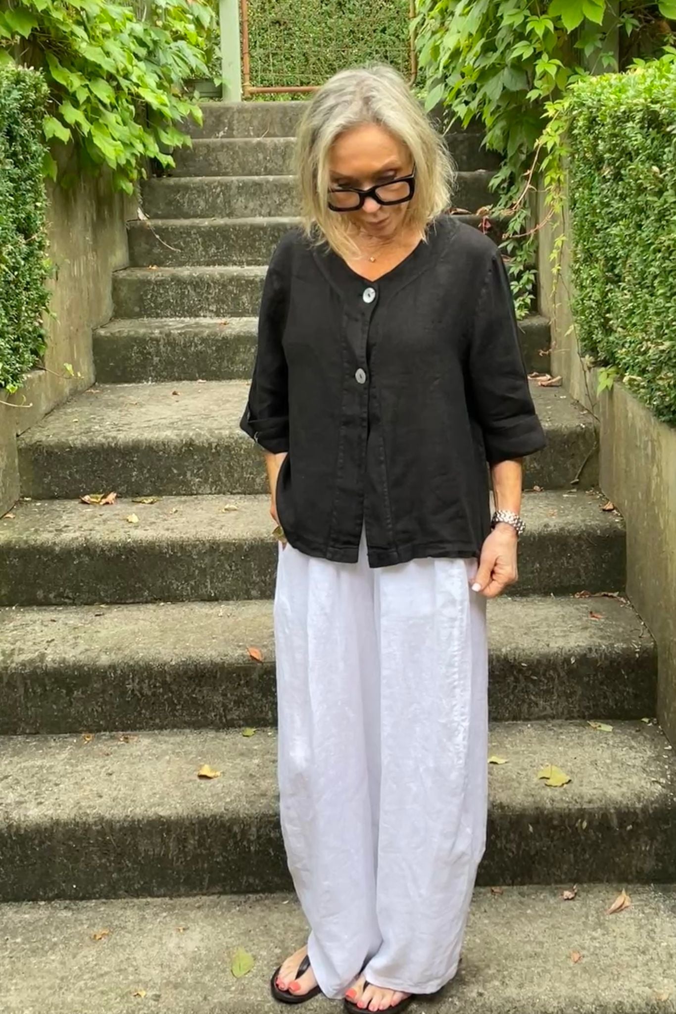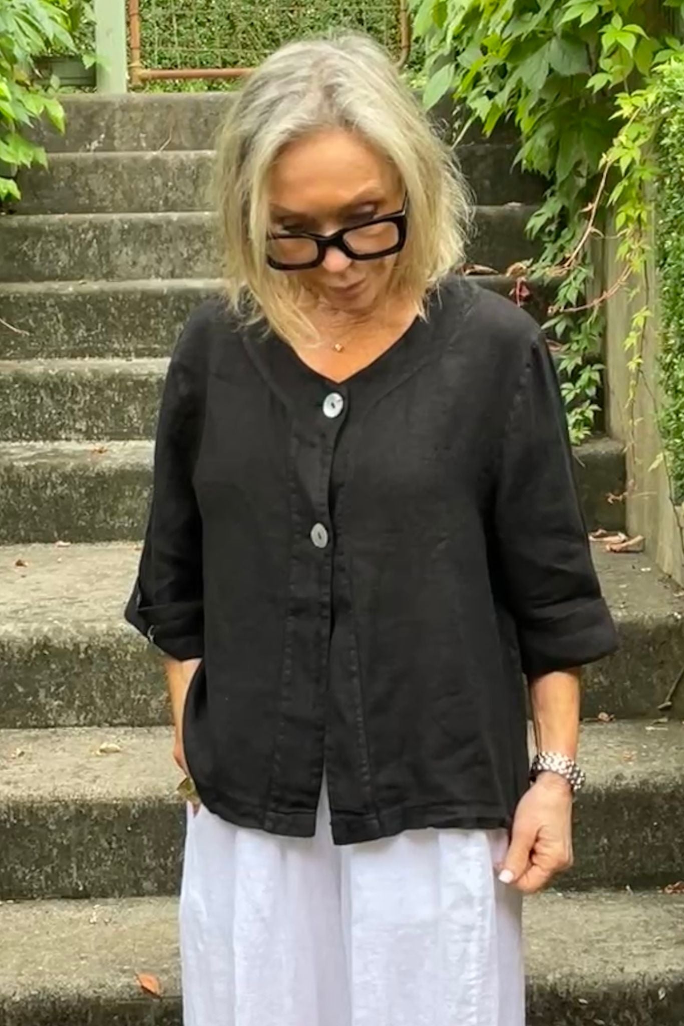 DESCRIPTION - tailored from italian linen, the treviso jacket delivers the flexibility needed for transitional dressing. its unstructured design features a round neckline, two-button closure, and three-quarter sleeves—pairs effortlessly over basics or under heavier outerwear. the relaxed fit and hip-length cut provide comfortable layering through spring and autumn, making it an indispensable wardrobe staple for those who value understated quality and practical style.