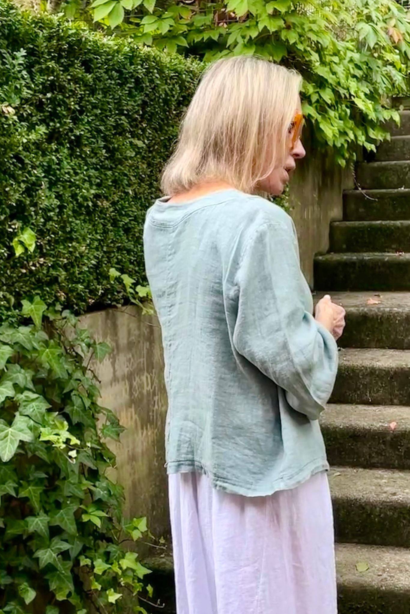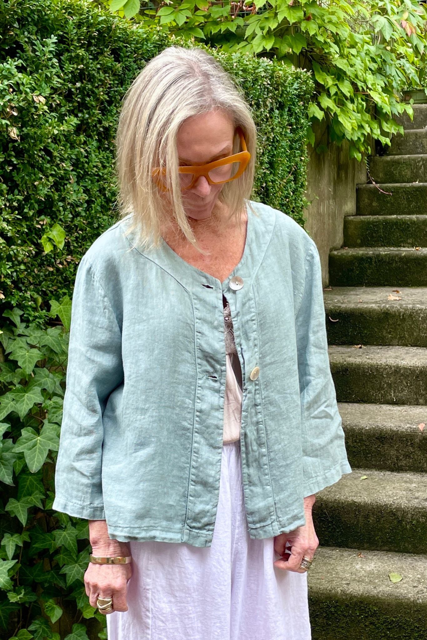 DESCRIPTION - tailored from italian linen, the treviso jacket delivers the flexibility needed for transitional dressing. its unstructured design features a round neckline, two-button closure, and three-quarter sleeves—pairs effortlessly over basics or under heavier outerwear. the relaxed fit and hip-length cut provide comfortable layering through spring and autumn, making it an indispensable wardrobe staple for those who value understated quality and practical style.