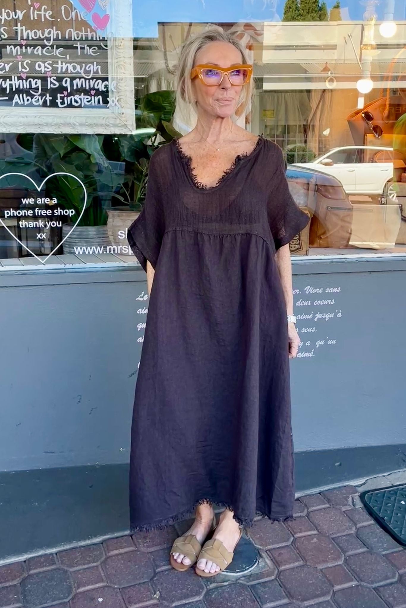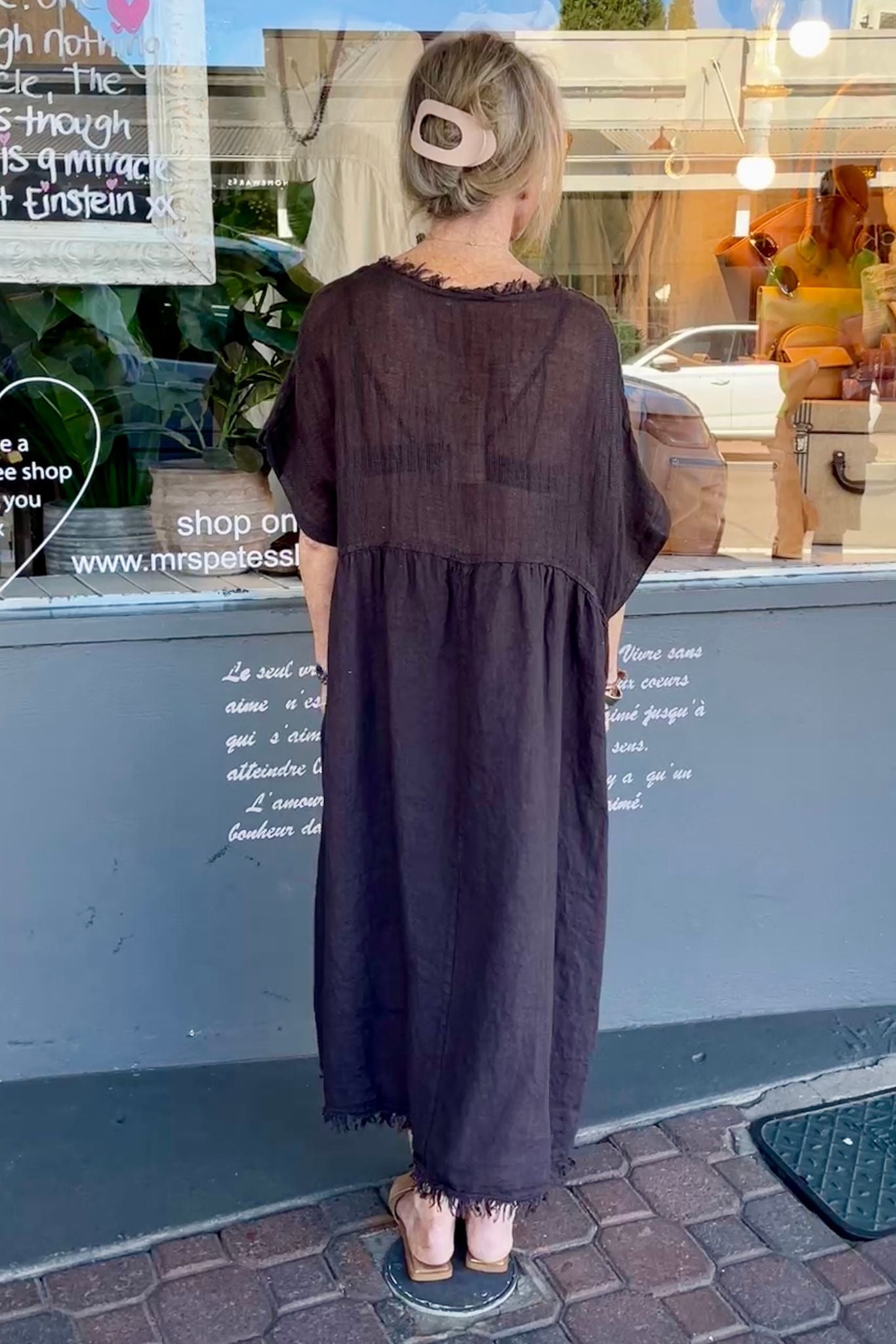 DESCRIPTION - crafted in italy from textured linen, this effortlessly wearable dress features an empire silhouette, an open neckline accented with frayed edges, and short, relaxed sleeves. falling to midi length, it embodies ultimate summer ease. wear it alone or layer with a cami, and complete the look with slides or sneakers for a casual chic look.