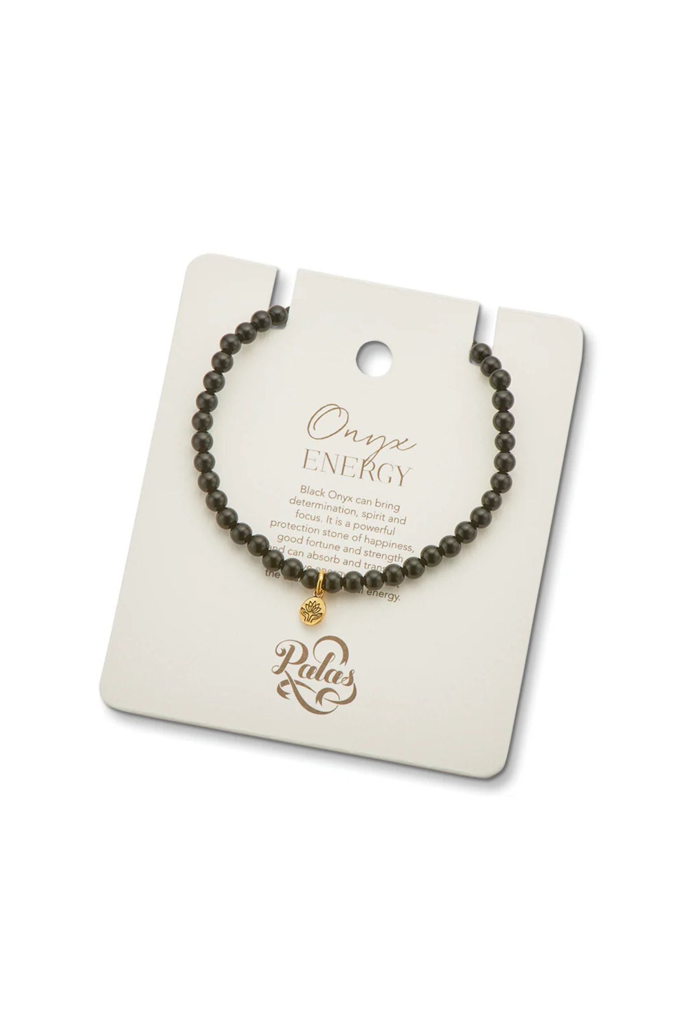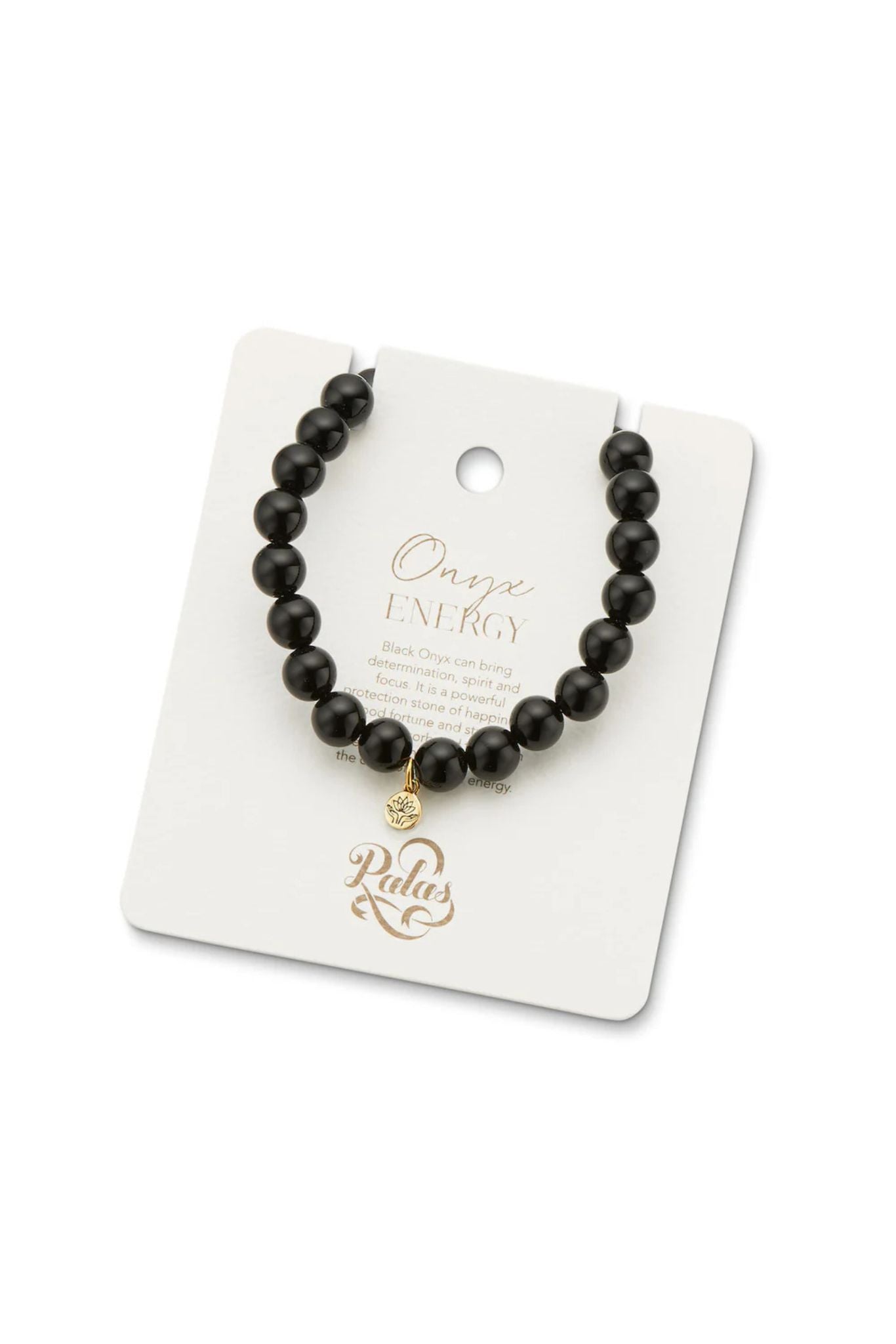 MEANING - energy. black onyx is believed to bring determination, spirit and focus. it is a powerful protection stone of happiness, good fortune and strength and can absorb and transform negative energy to prevent the drain of personal energy.