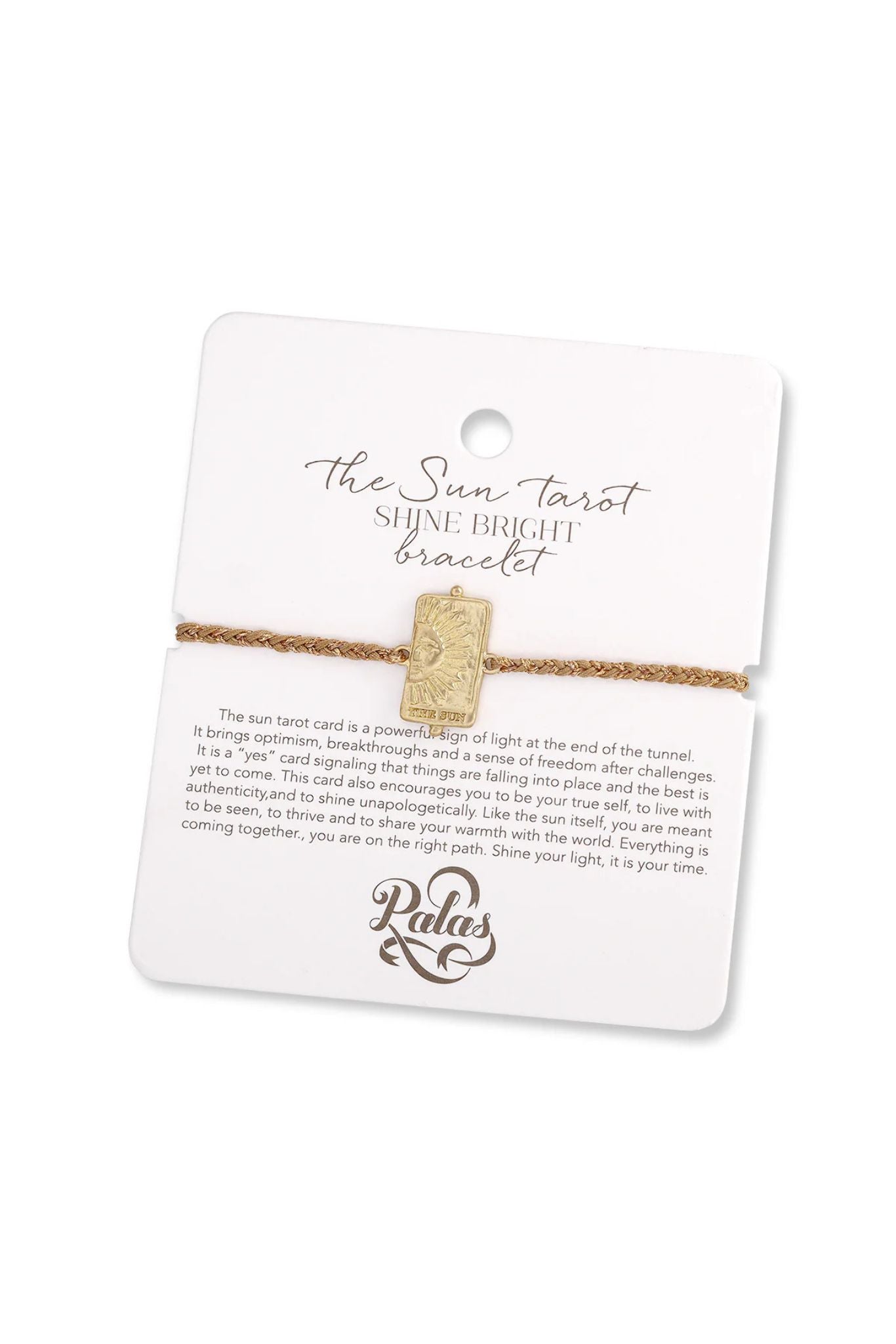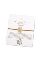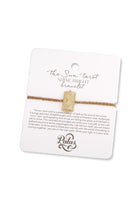 DESCRIPTION - an adjustable cotton and gold bracelet with handcrafted yellow brass charm featuring a sun design and 'shine bright' on the reverse.