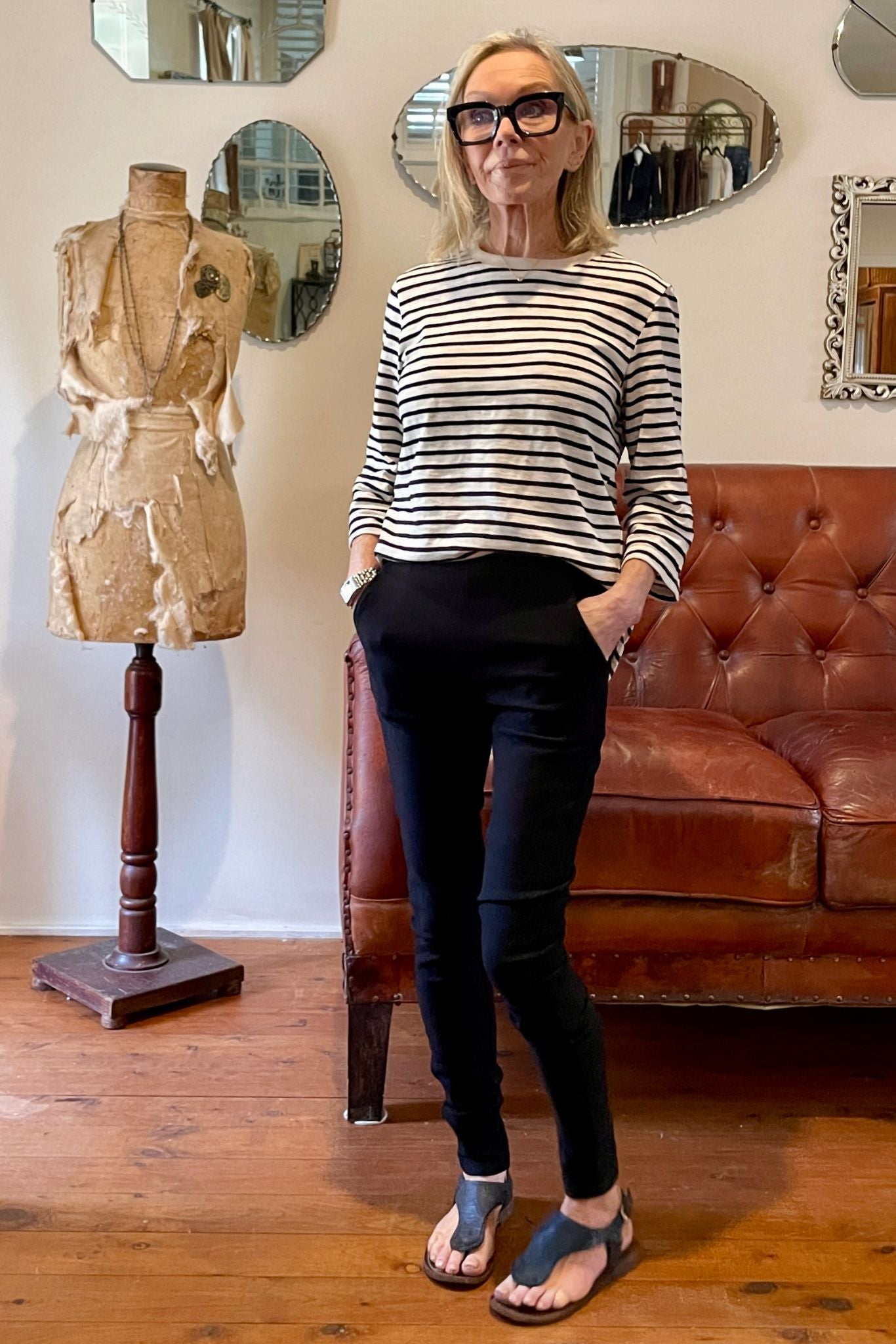 DESCRIPTION - the brave + true pilot pants are a super comfy pull on pant made from soft stretch ponte. featuring cutaway front pockets, a self fabric elasticated waist band and a slim leg, these pants are a wardrobe staple for all seasons and a mrs pete's shed best seller.
