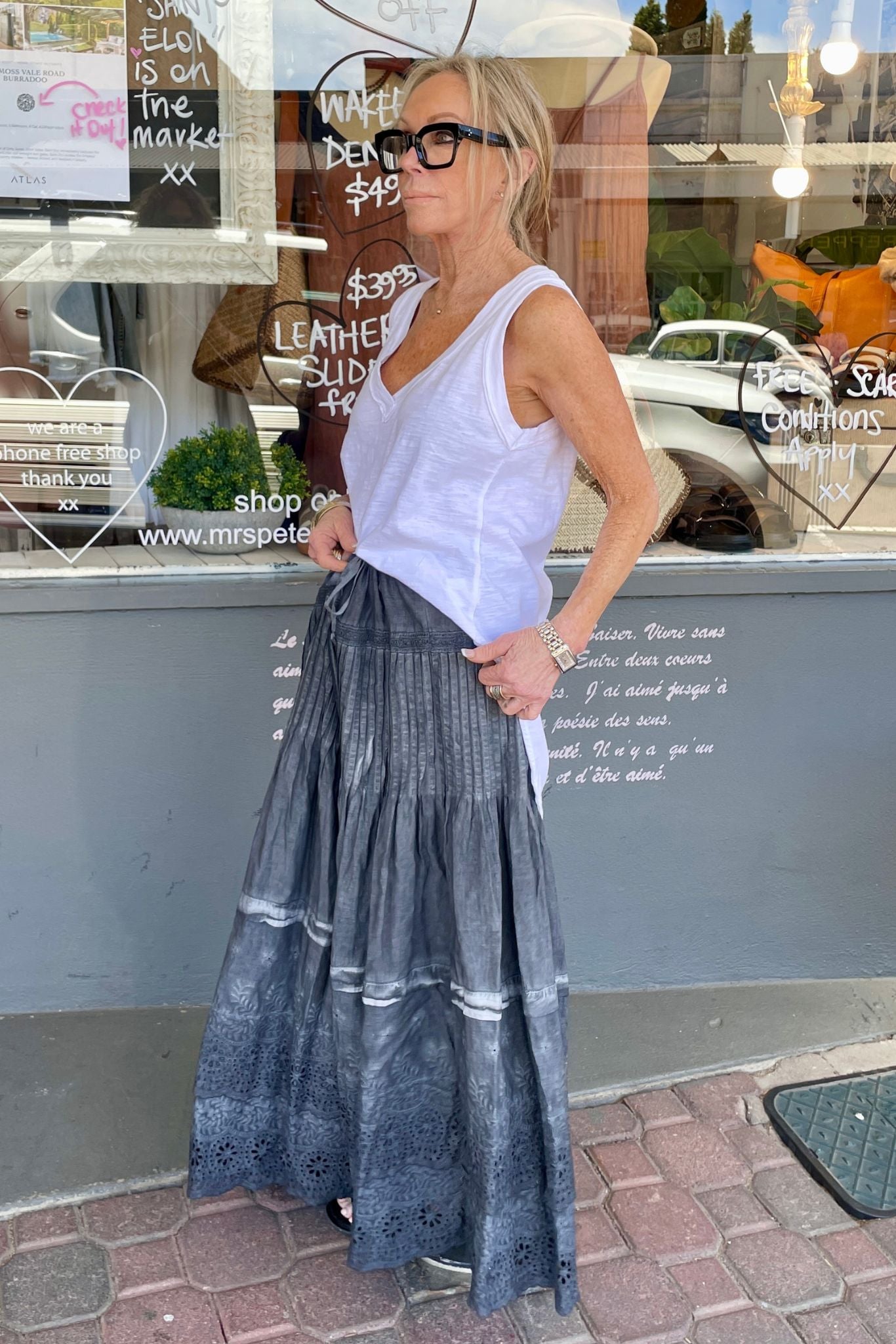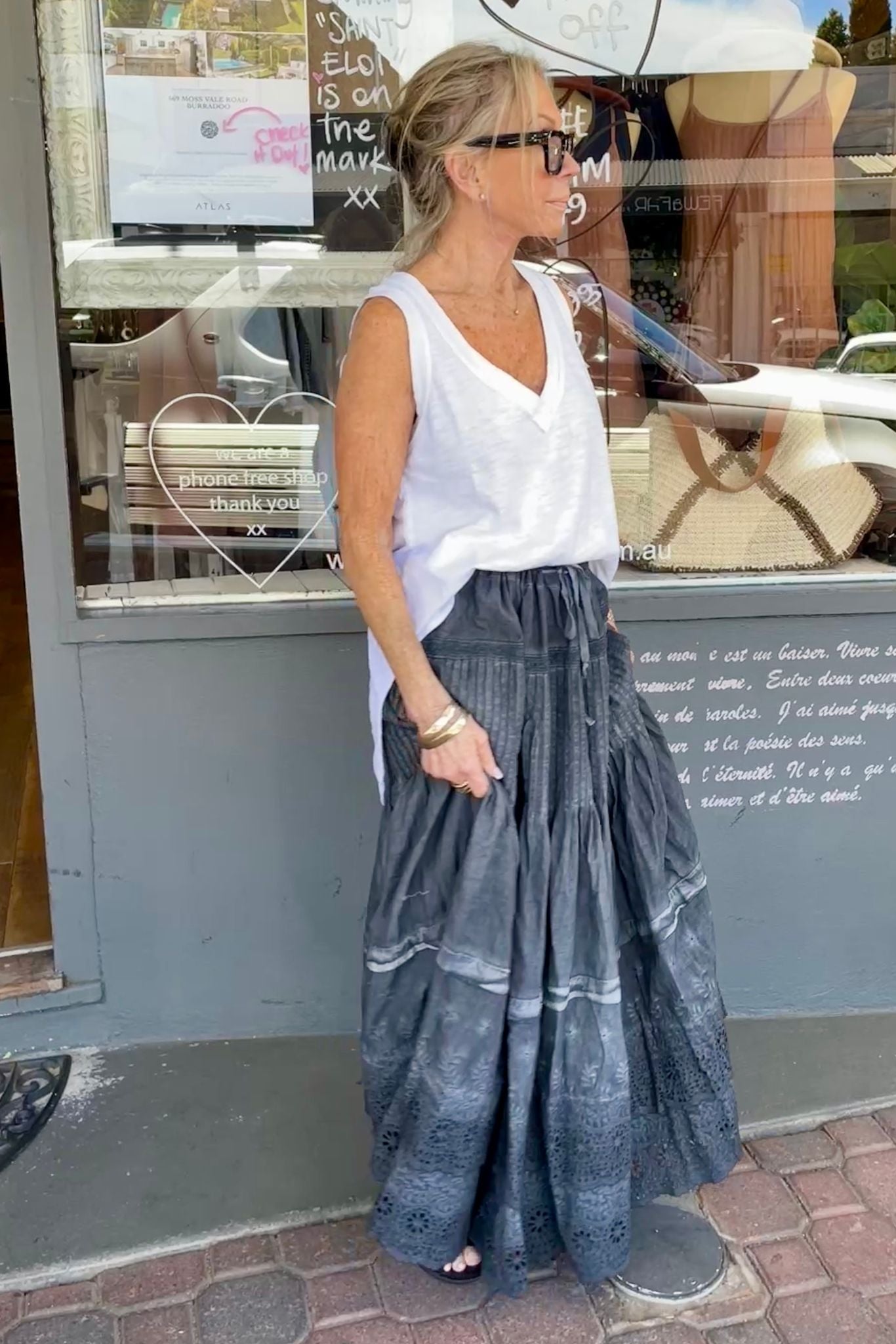 DESCRIPTION - the date with mabel skirt from miss rose sister violet is made from a broderie anglaise - cotton lace. a beautiful full skirt with a drawstring waist it will fit everyone comfortably. pintucks and detailing give this skirt a whimsical feel. perfect with a white tank or tee or dressed up with a shirt.