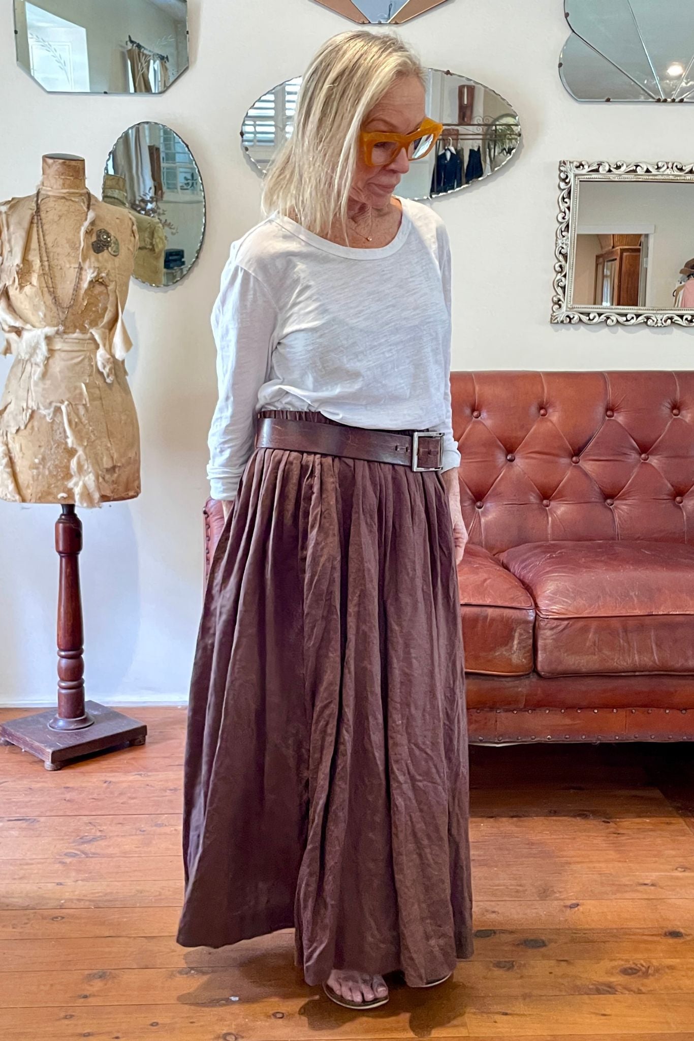 DESCRIPTION - a maxi skirt made from soft, medium weight 100% linen. the stunning rustic pleating gives this maxi skirt both comfort and edge. the 5cm wide elastic waist is secured to prevent rolling. wear on the waist or slightly lower for effortless style and versatility. this skirt is perfect for dressing up or down for any season with handy side pockets. looks great in the warmer months with slides as an everyday casual look. team it with an cotton tee, a great blazer and trainers.