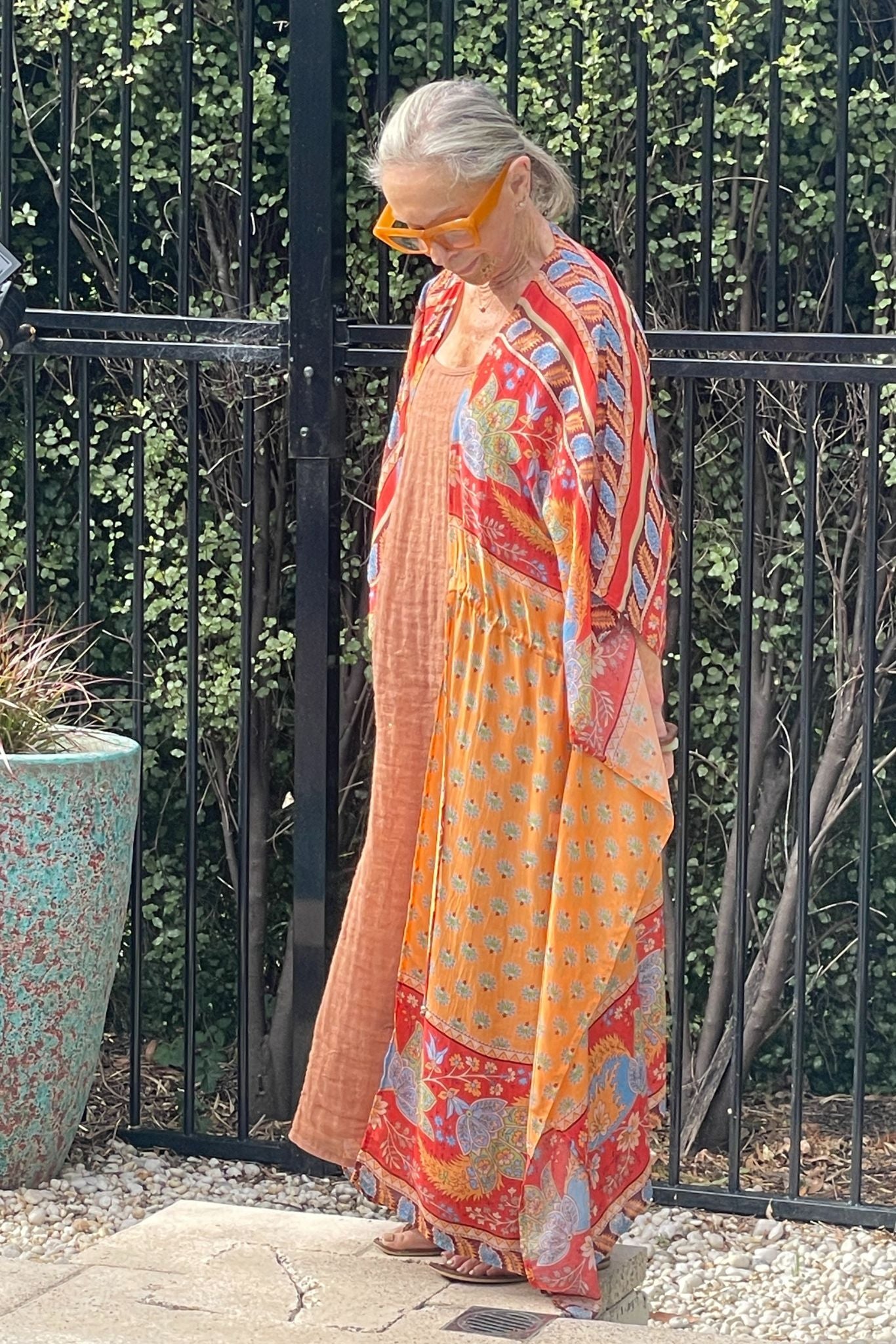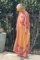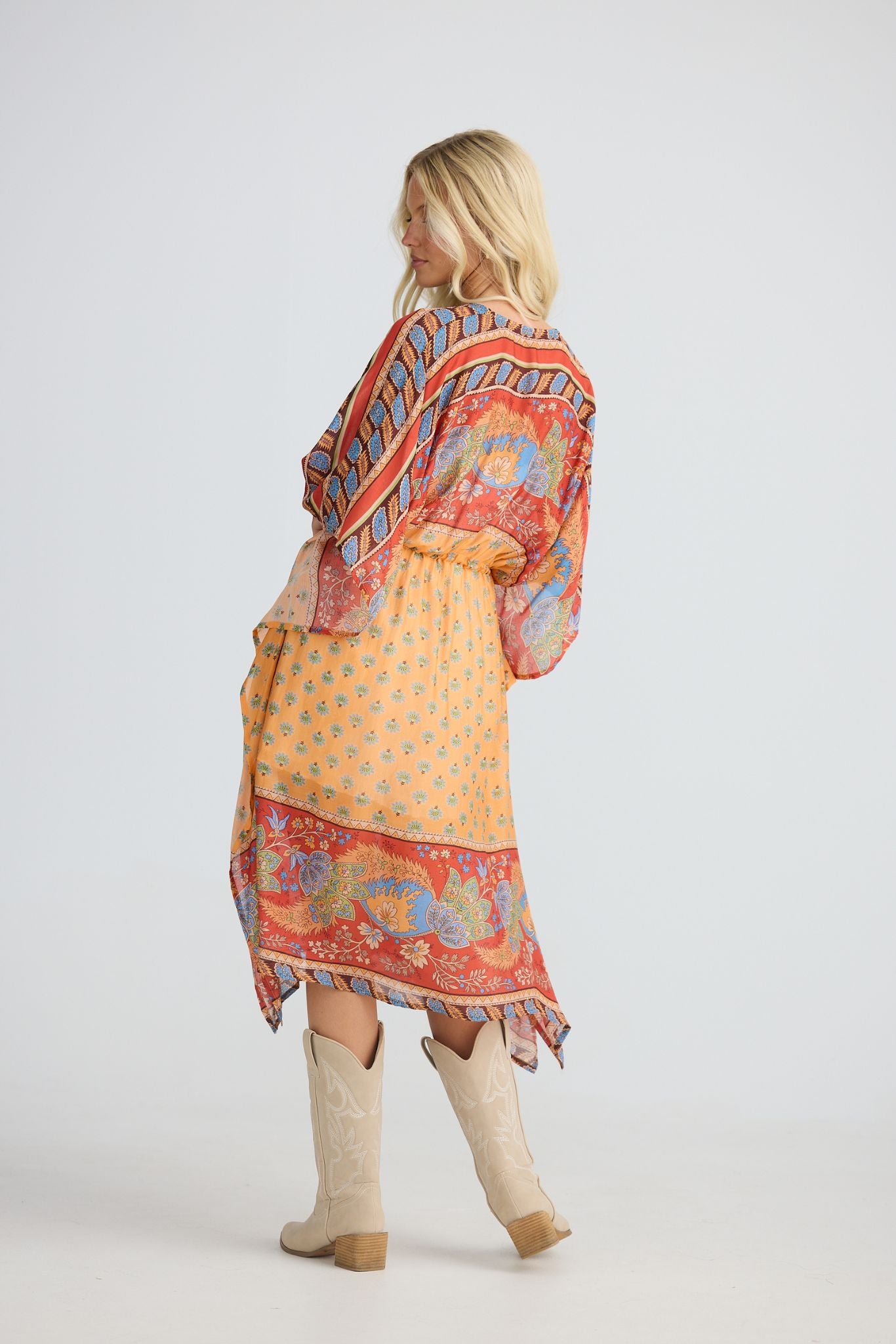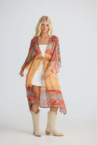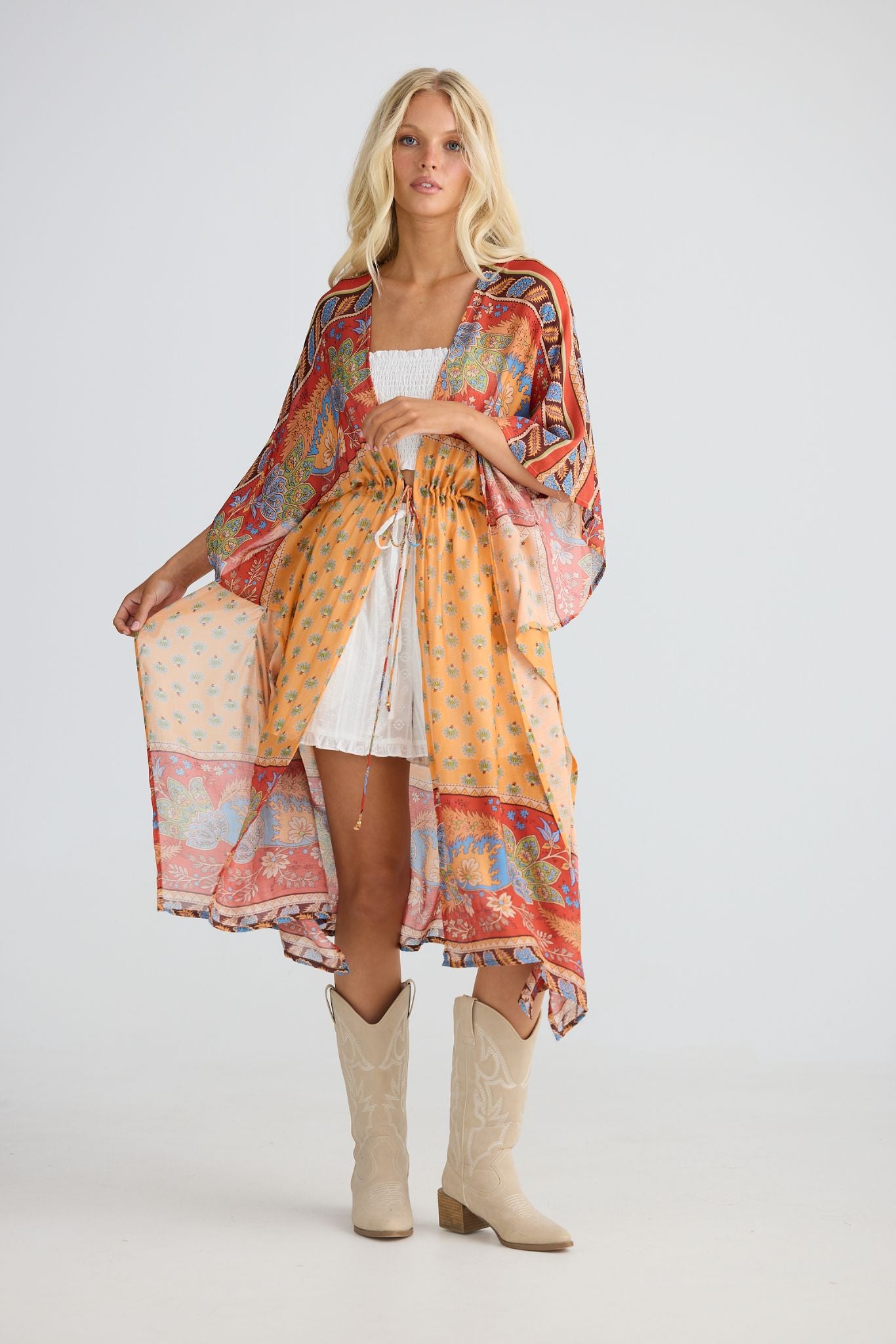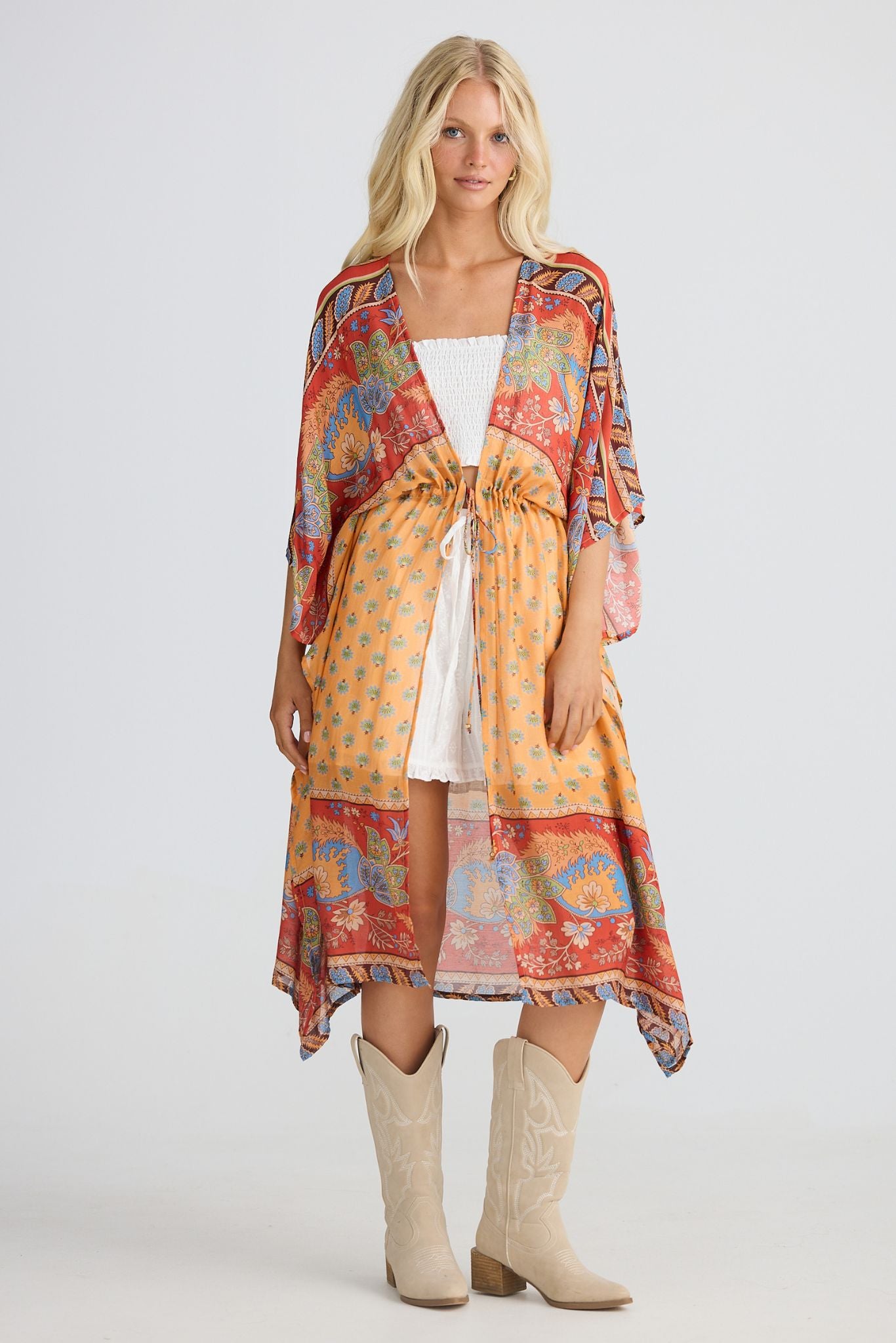 DESCRIPTION - this versatile piece transitions effortlessly from beach to beyond. layer it over your favourite swimwear or slip it on as a standalone statement piece. the relaxed kaftan silhouette features an open front design with adjustable drawstring ties finished with beaded accents at the waist. elbow-length sleeves and a flowing printed fabric create an easy, breezy aesthetic that flatters and moves with you.