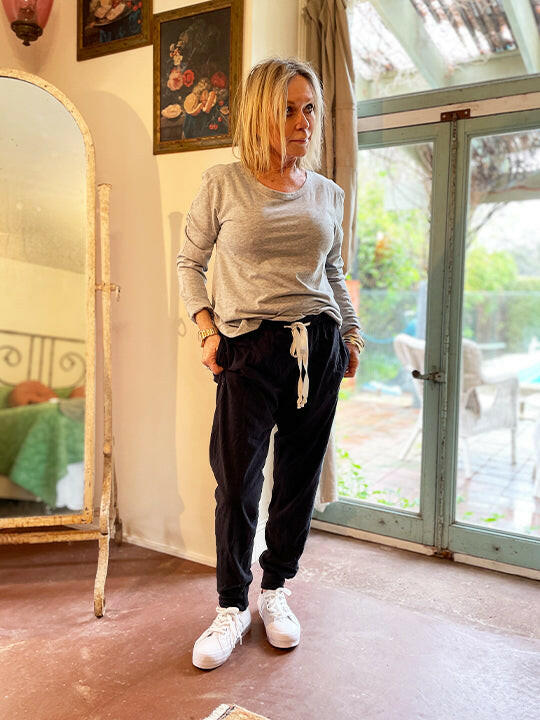 DESCRIPTION - a classic long sleeve cotton-jersey tee with a crew neck. a feminine  cut that is sure to become a wardrobe favourite with its curved raw edge hem. easily worn with sleeves folded to the elbow in spring or layered in cooler months. a great classic edition to your wardrobe and a style that mrs pete's shed can't live without.