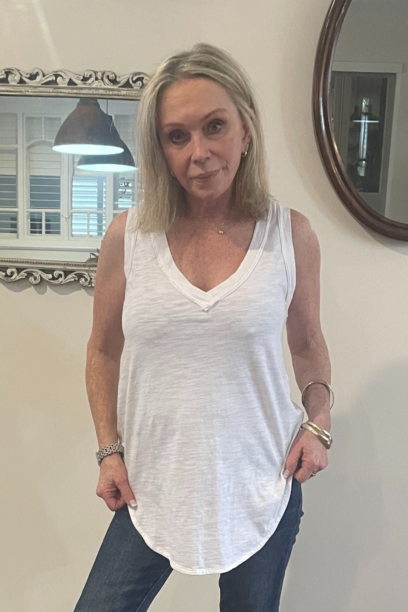 DESCRIPTION - a staple for any wardrobe. the audrey tank made from 100% cotton, with a slub finish is the ultimate tank for layering. lightweight and flattering with a classic v-neck and curved hem slightly lower at the back. wear this with your joggers, denims or one of our skirts.