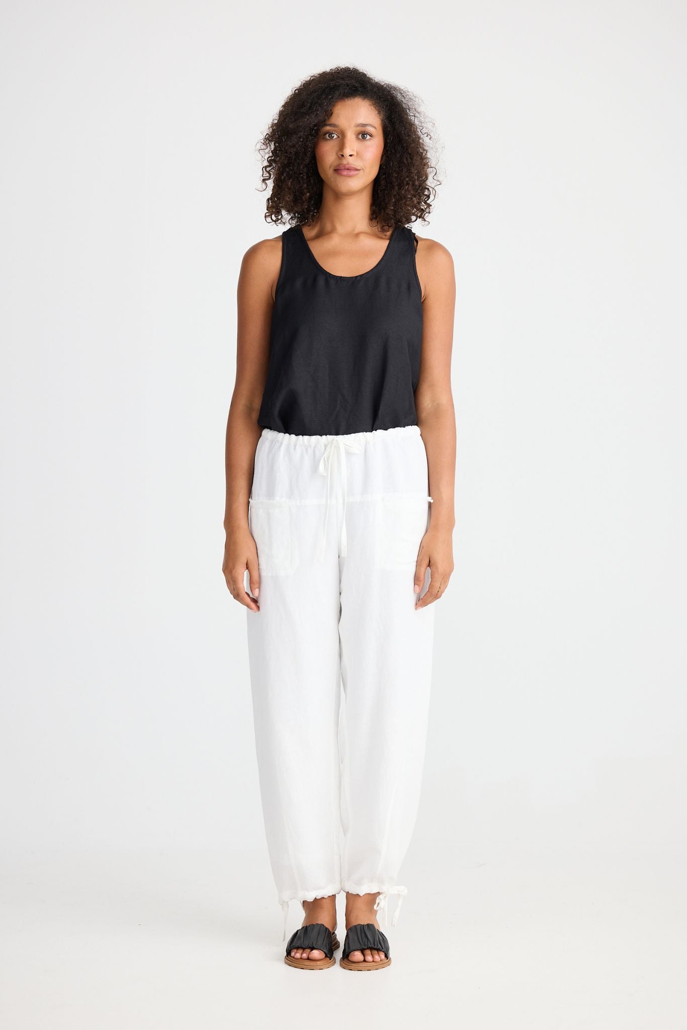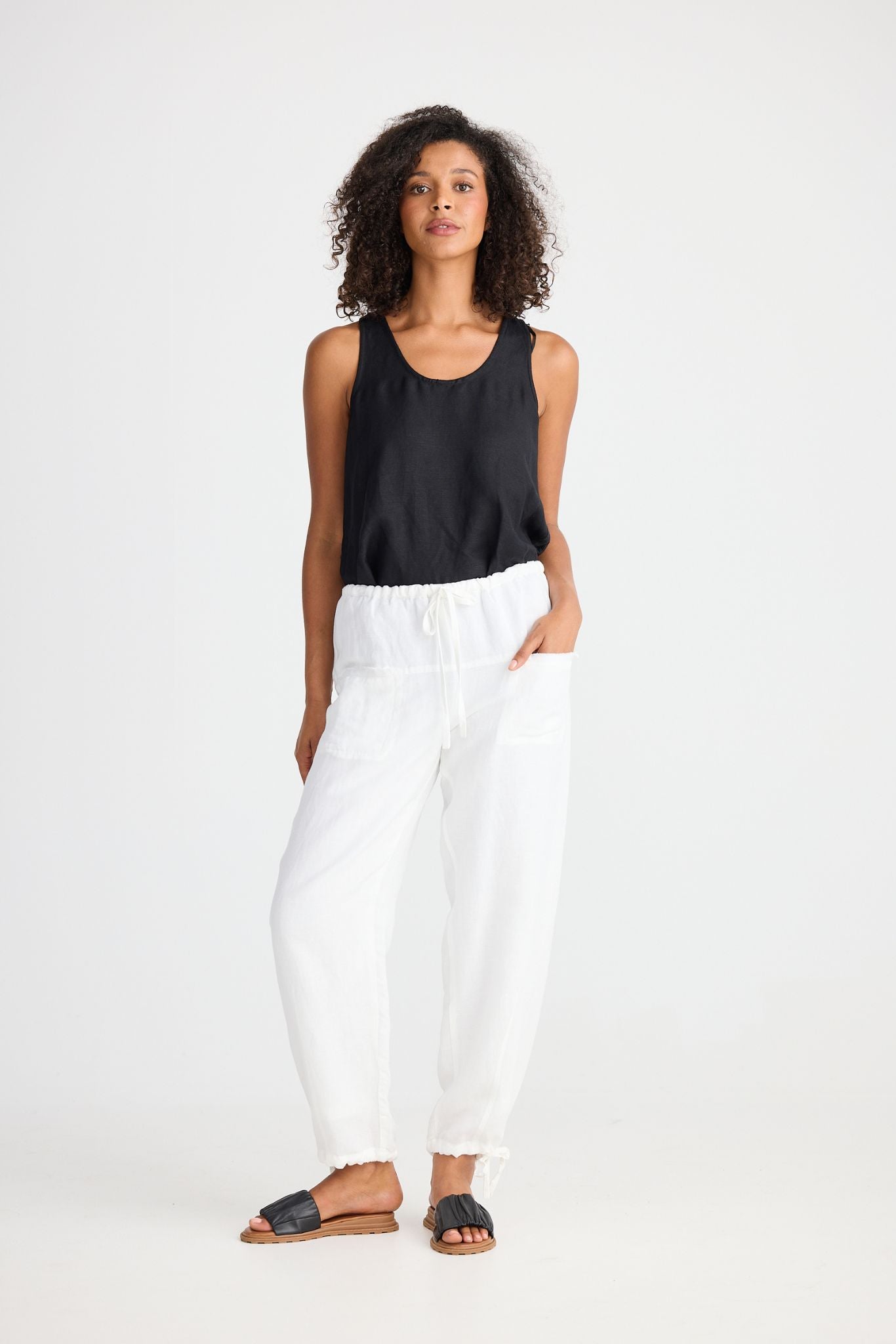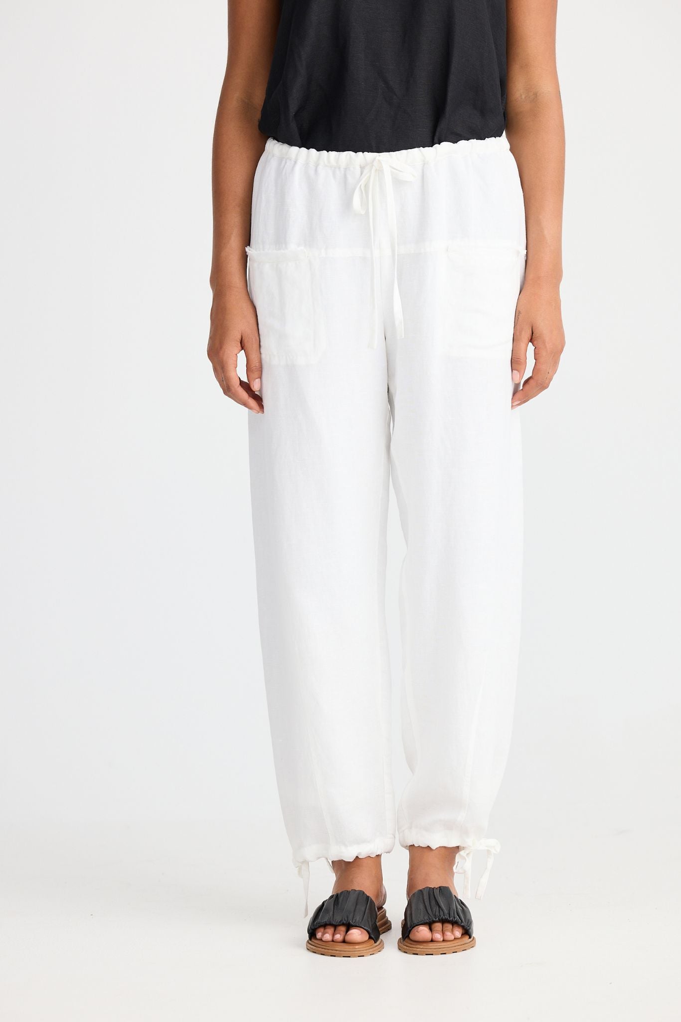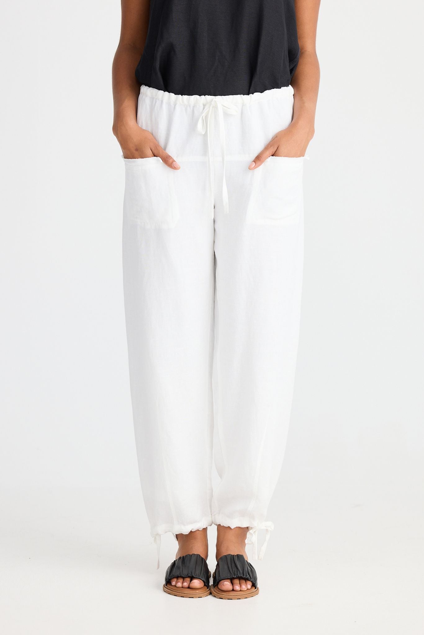 DESCRIPTION - the amazon pant are crafted from a breathable white linen blend, a relaxed fit designed for all-day comfort. featuring an elasticated waistband with drawstring ties, these pants allow for a personalised fit, adjustable hem ties provide versatility in styling and length, making them suitable for various occasions. the yoke seam adds subtle structure and is complemented by practical pockets, perfect for keeping essentials close. this pant combines thoughtful design with quality materials, making it an expert choice for those seeking effortless style and comfort.